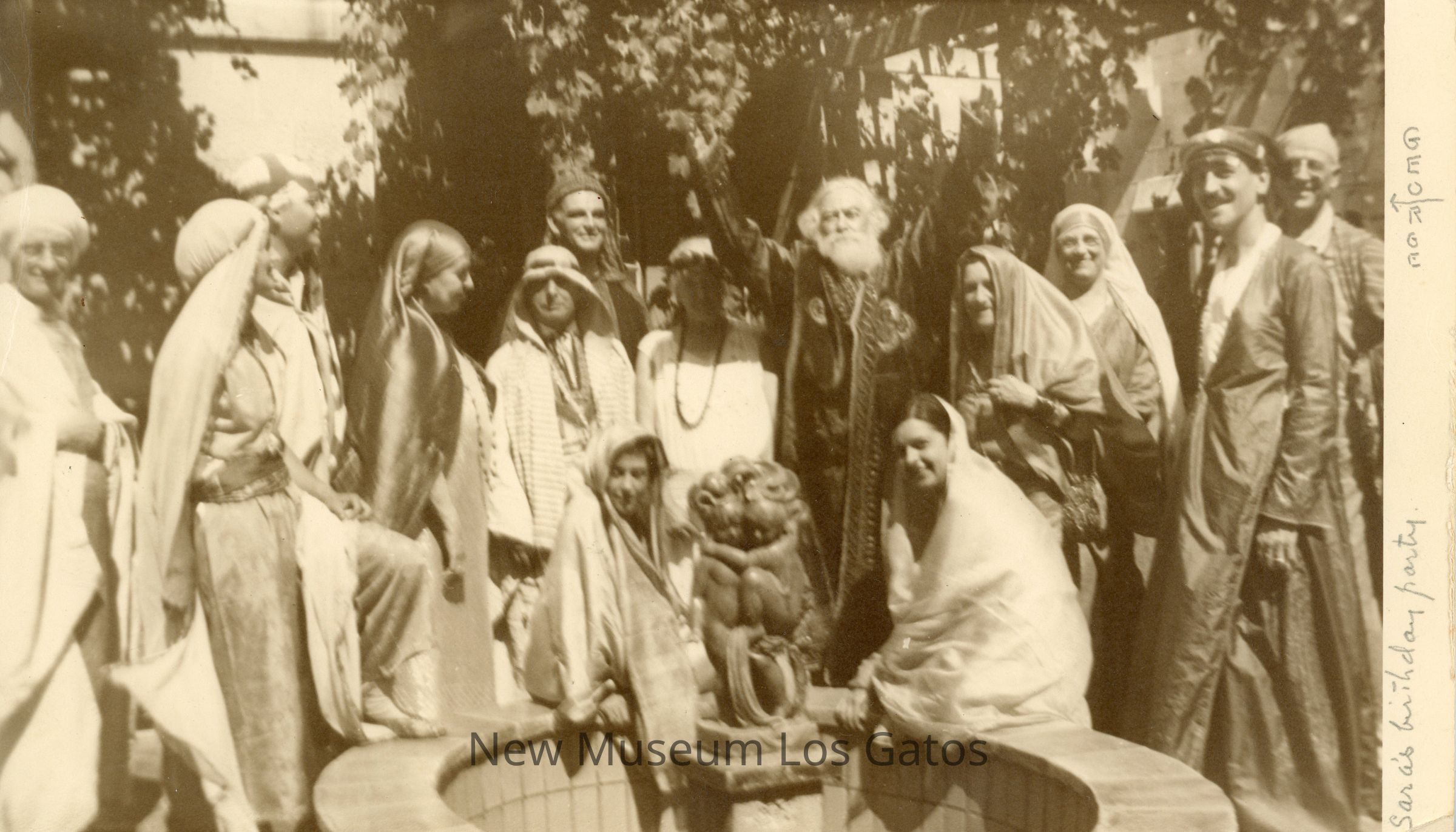 A black and white photo of a group of adults in costume standing around a fountain.