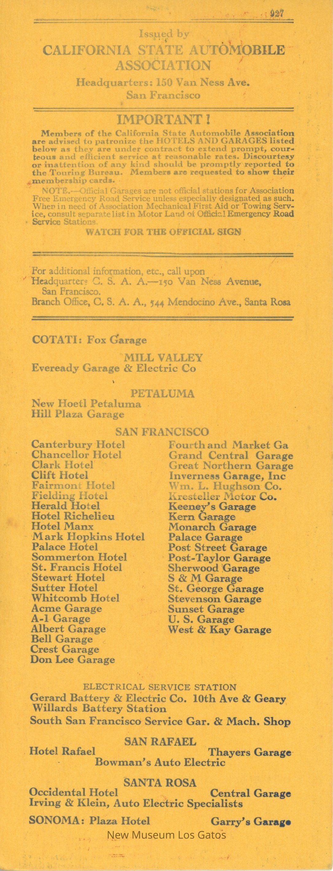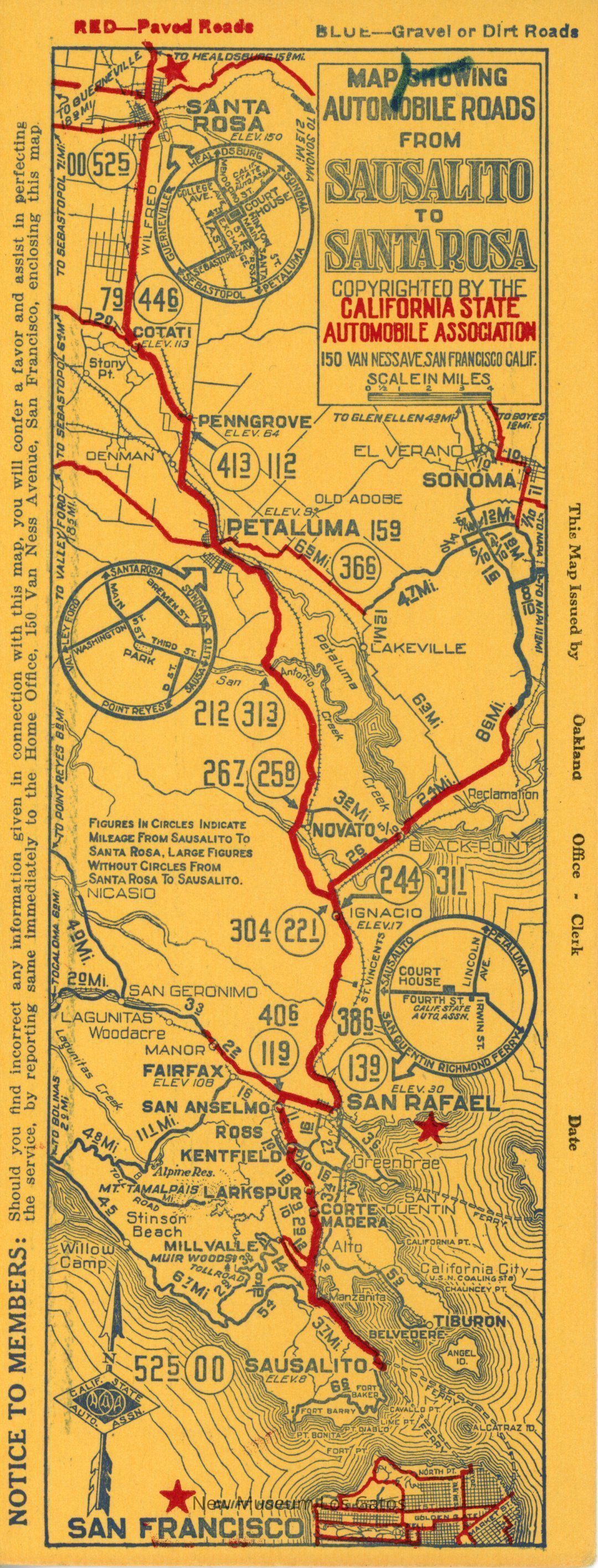 A small, single-sheeted cardstock map, depicting the automobile roads, both paved and unpaved, from Sausalito to Santa Rosa. There is also information about approved service stations and hotels in that area on the back.Collection
