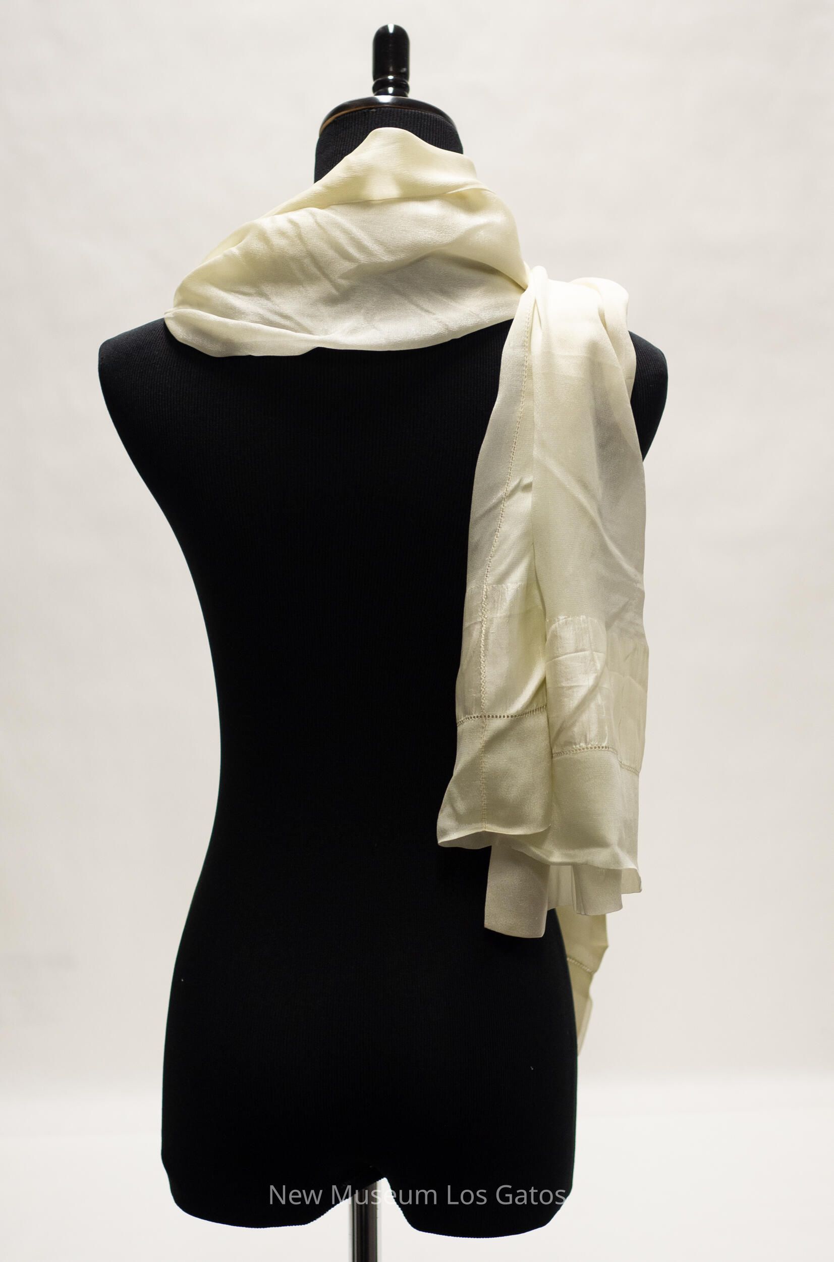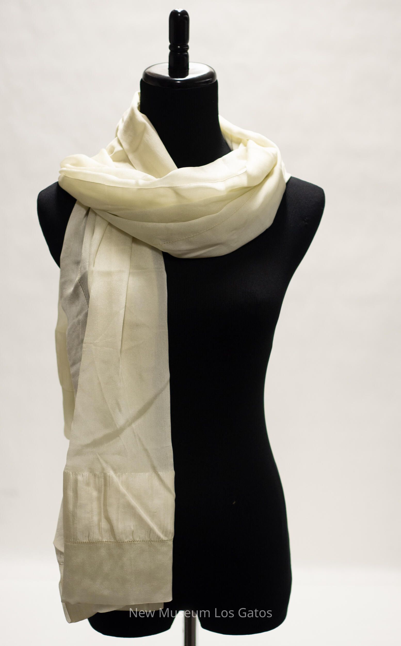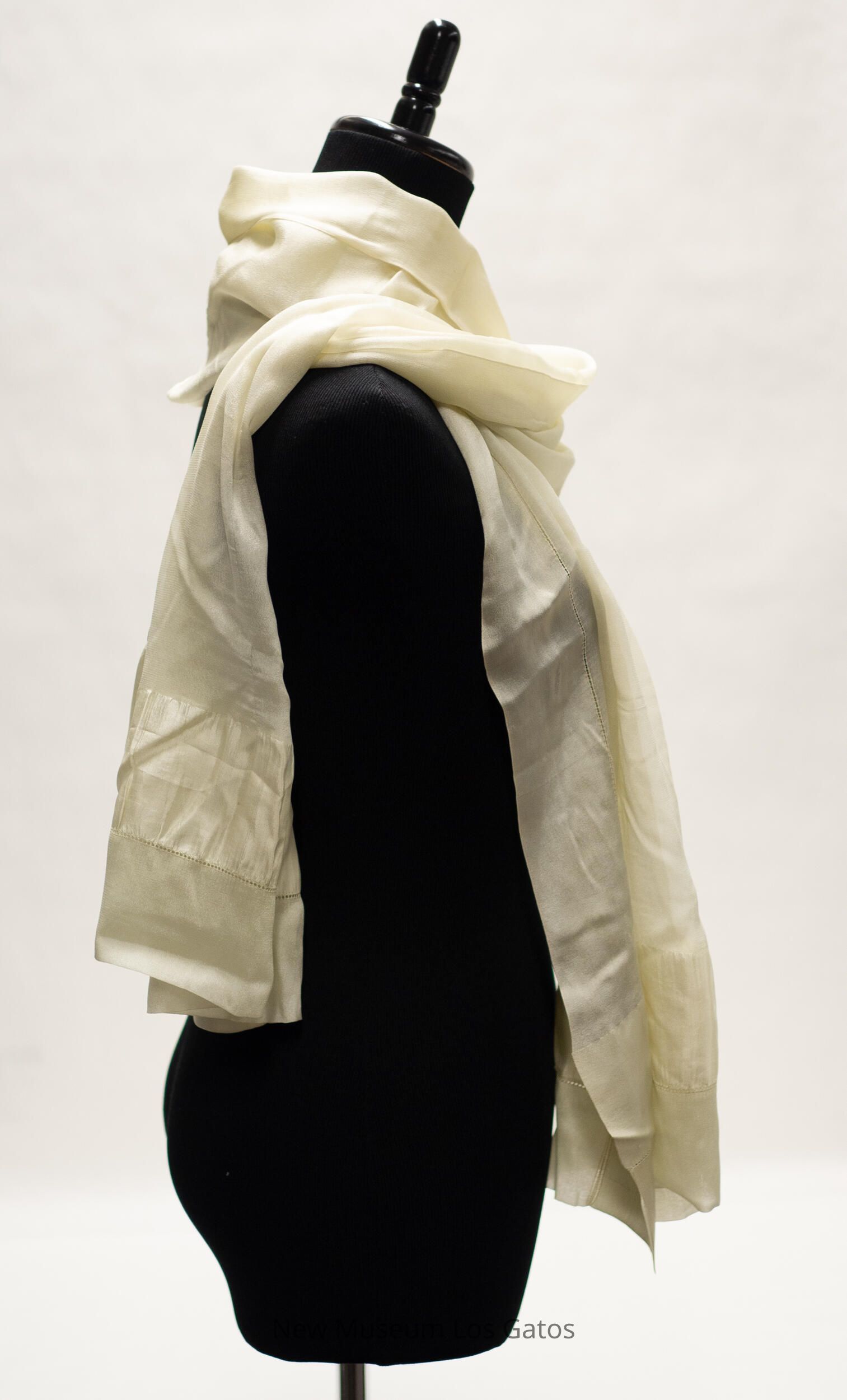 A long, rectangular light green silk scarf. The main body of the scarf is partially sheer, while the edges are more opaque. There is decorative stitching/holes along each edge, between the sheer body and the opaque edges.Collection