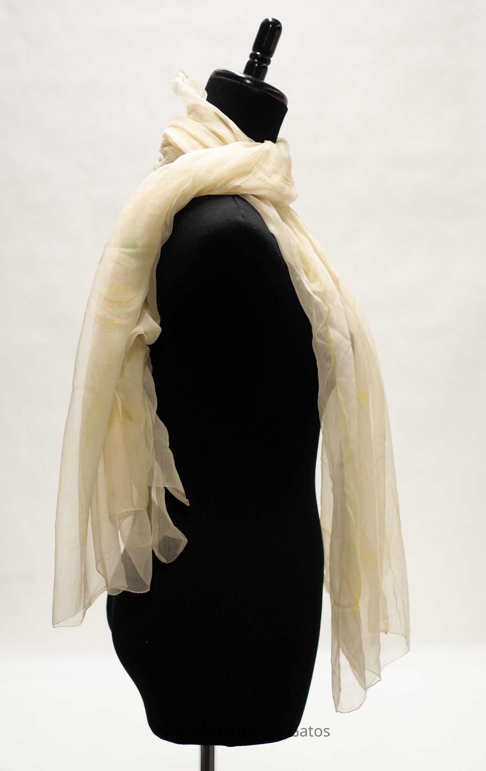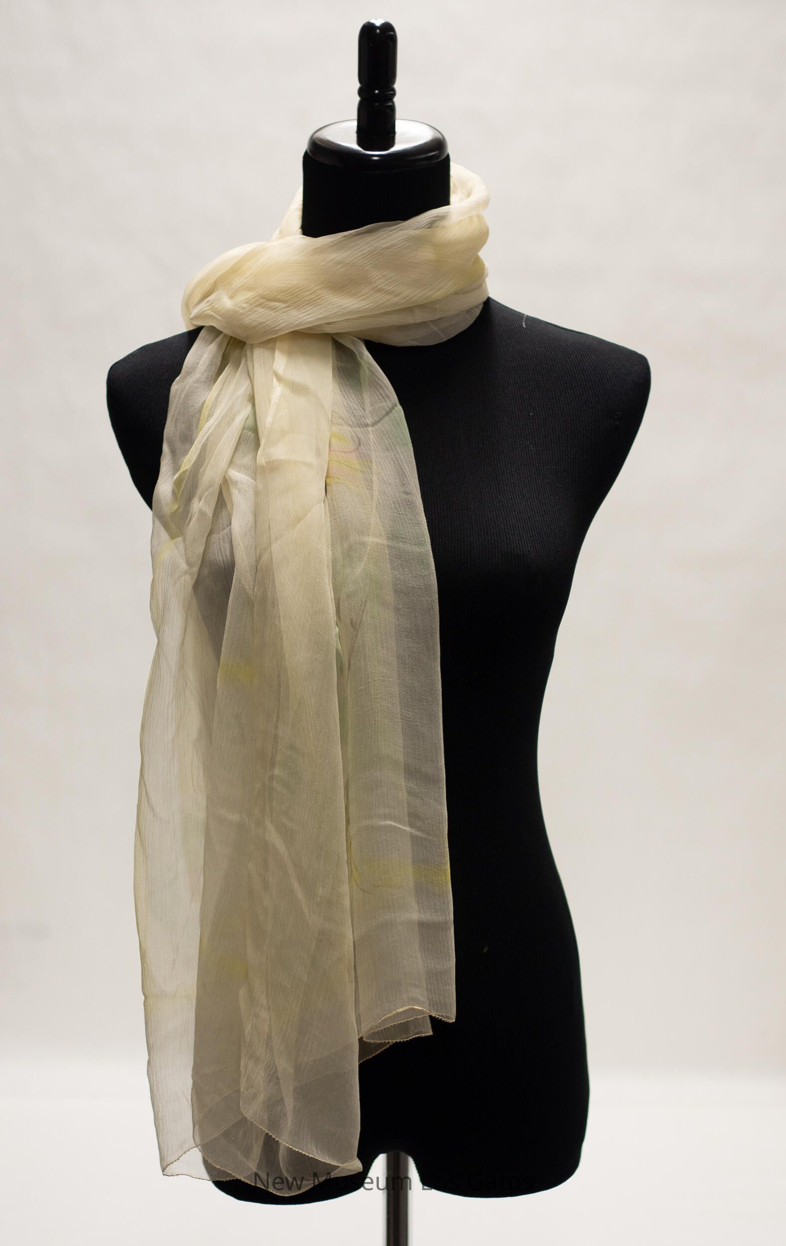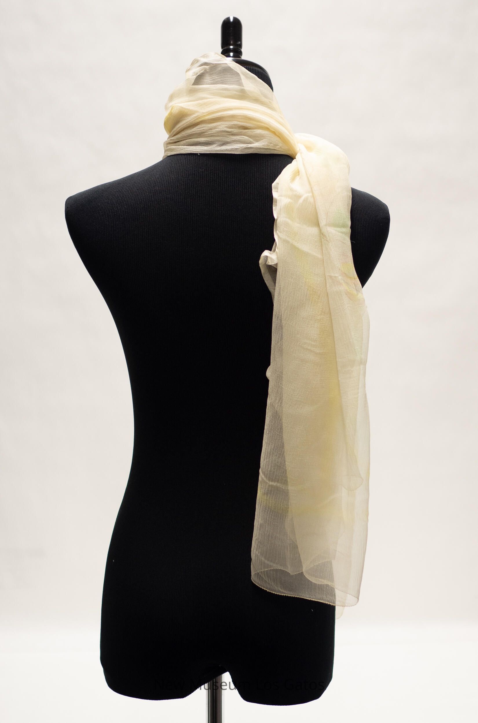 A large, rectangular sheer silk scarf. The scarf is a light beige color, with a faint floral print throughout the scarf, consisting of green leaves, brown stems, pink and yellow flowers, and swirls.Collection
