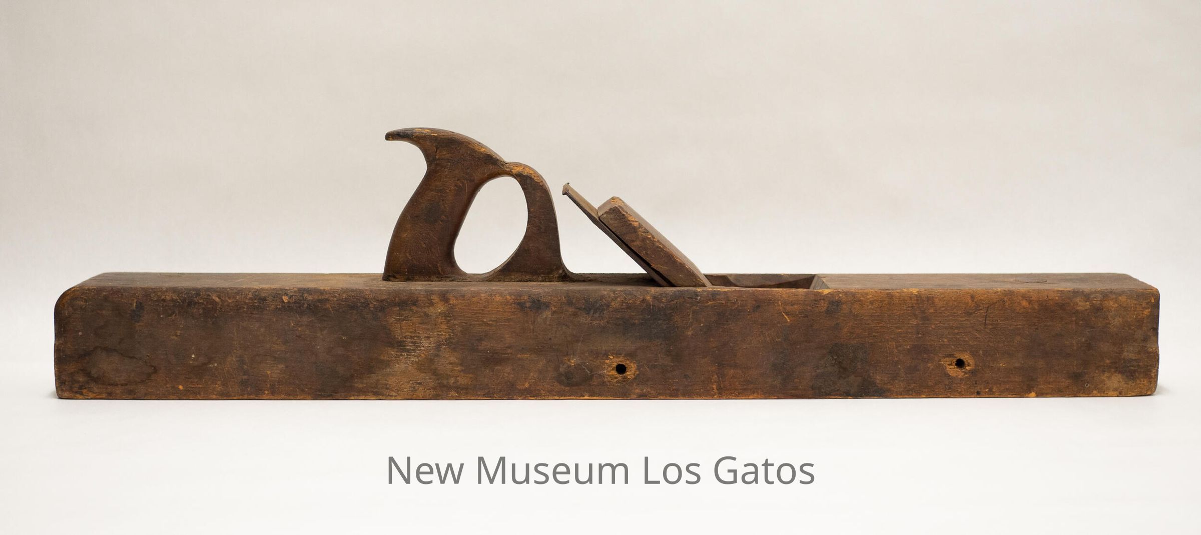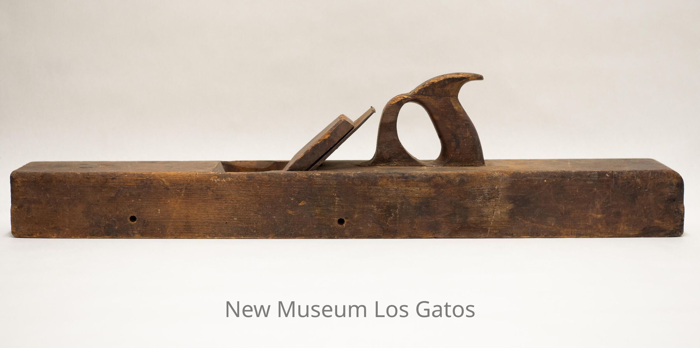 A long, antique wood plane, with a rectangular base. There is a curved, circular handle with a hole in the center for the hands to grasp towards one end of the base, with a metal blade and wooden chip breaker angled into an opening in the center of the base. There are two holes through the width of the base, one towards the front and one more towards the middle of the plane, presumably where the plane was attached to something.Collection