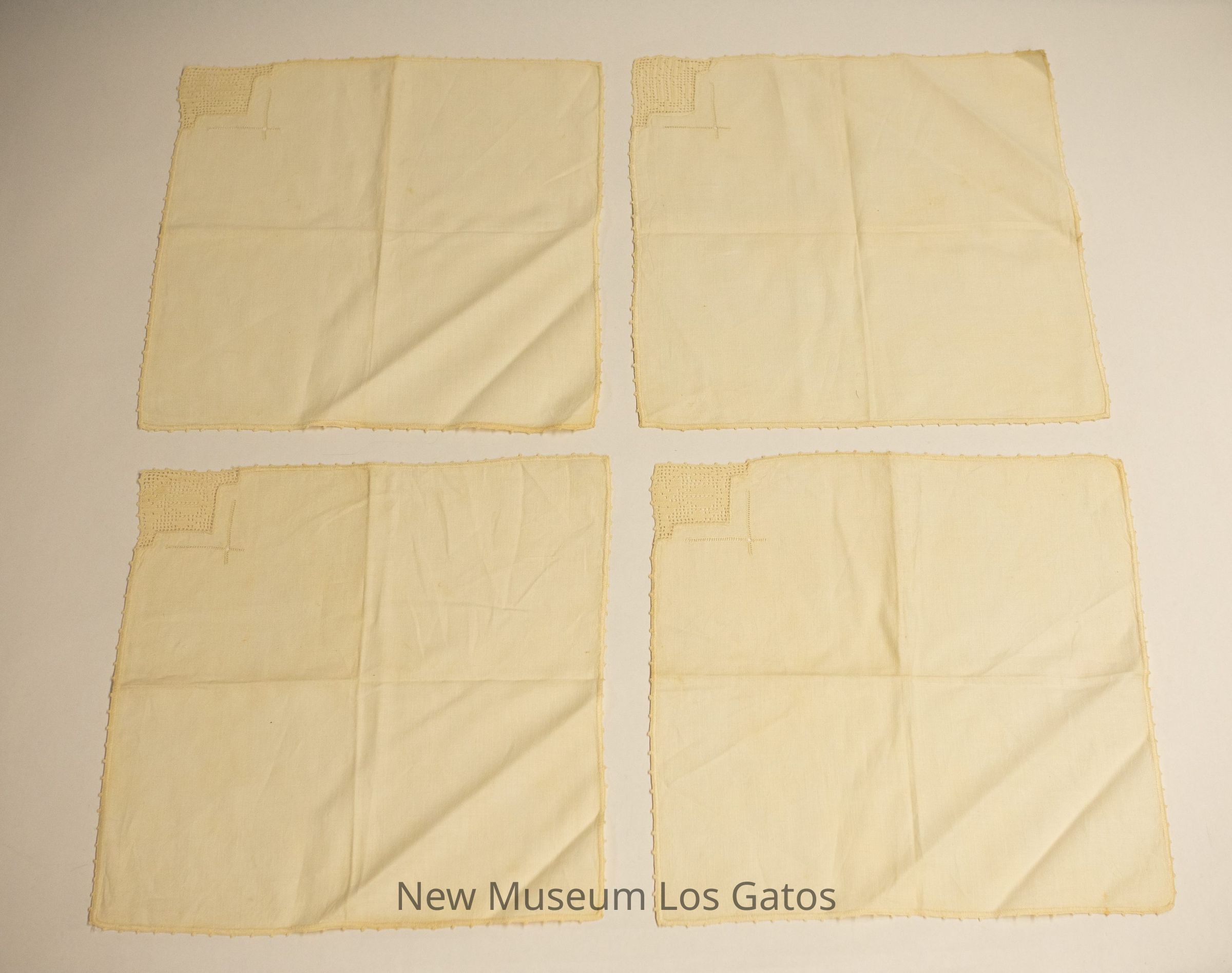 A set of four identical square, decorative napkins. Each napkin is ecru in color, and has embroidered edges with small dots. Each napkin also has a decorative, handmade corner with two lines of decorative eyelets accenting it.Collection