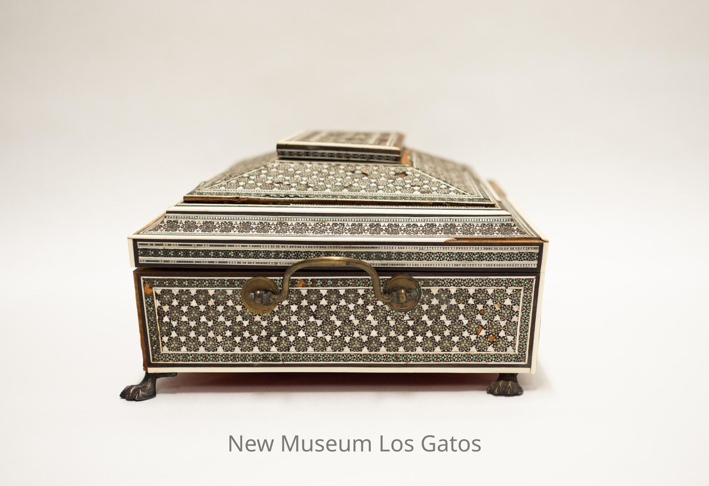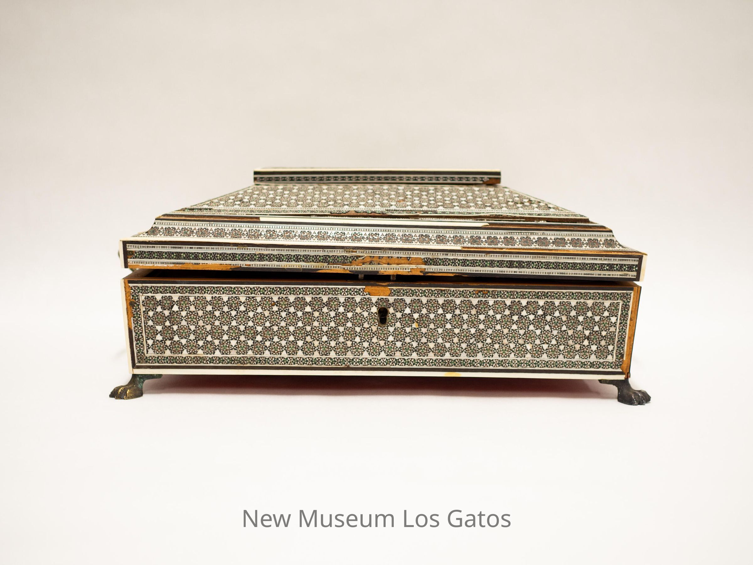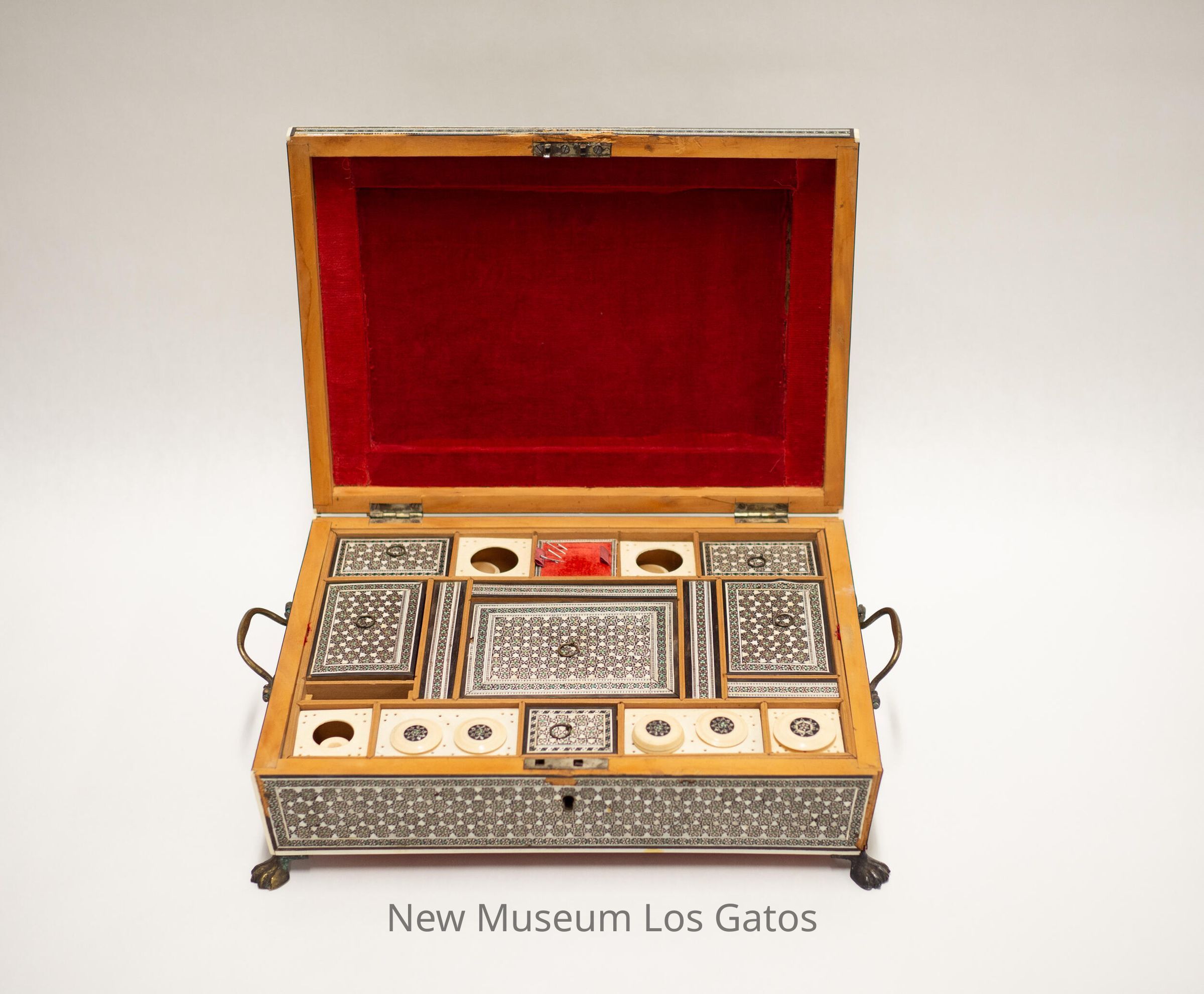 A large, rectangular wooden box with claw-foot metal legs and two metal handles. The lid is stepped, and hinges open. The box is covered in a star-patterned tile decoration. Inside, the lid is covered in red velvet, and the box itself is divided up into 17 compartments. Some of the compartments have lids that are covered in the same tile pattern as the exterior. Some of the compartments have circular holes with stoppers inside, and the lids of the stoppers have the same tile pattern as the rest of the box, but some of these compartments are missing the decorative stopper lids. And one compartments is red velvet, with five pins stuck in it. The bottom of the box is also covered in red velvet.Collection