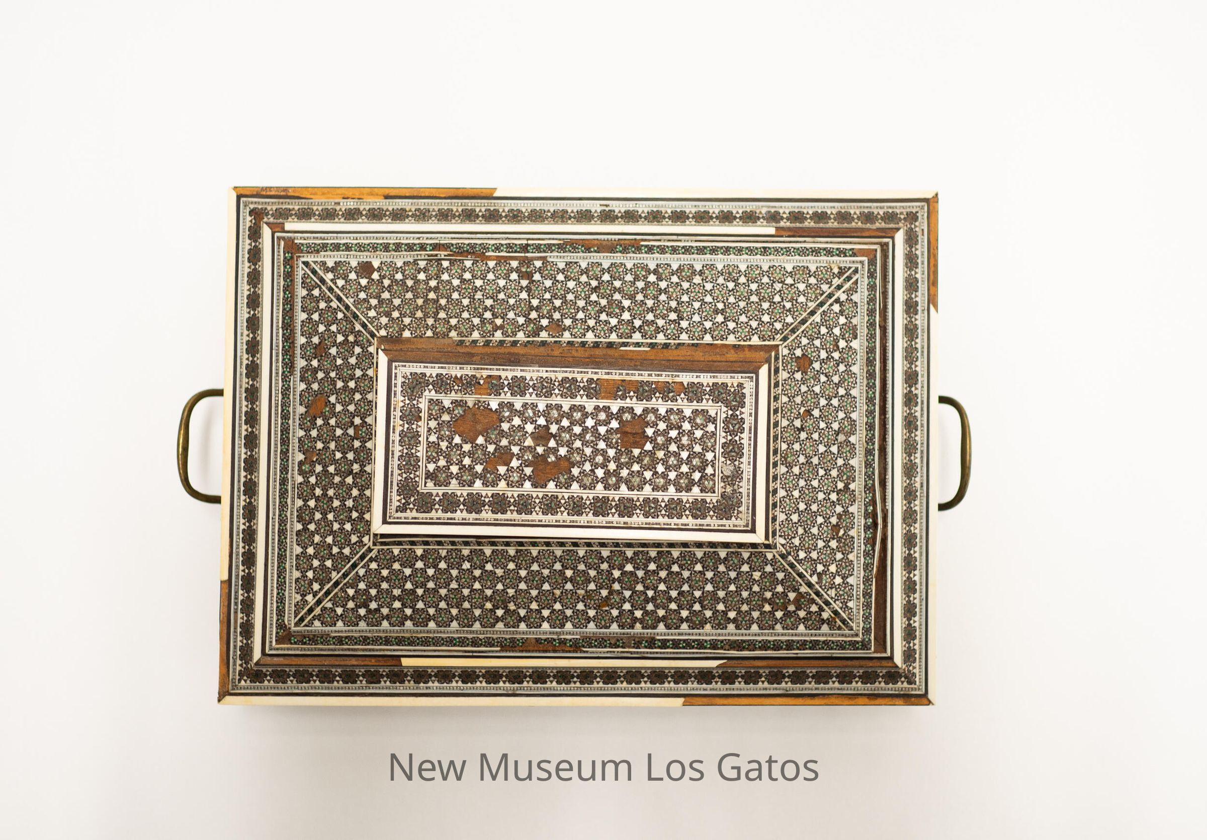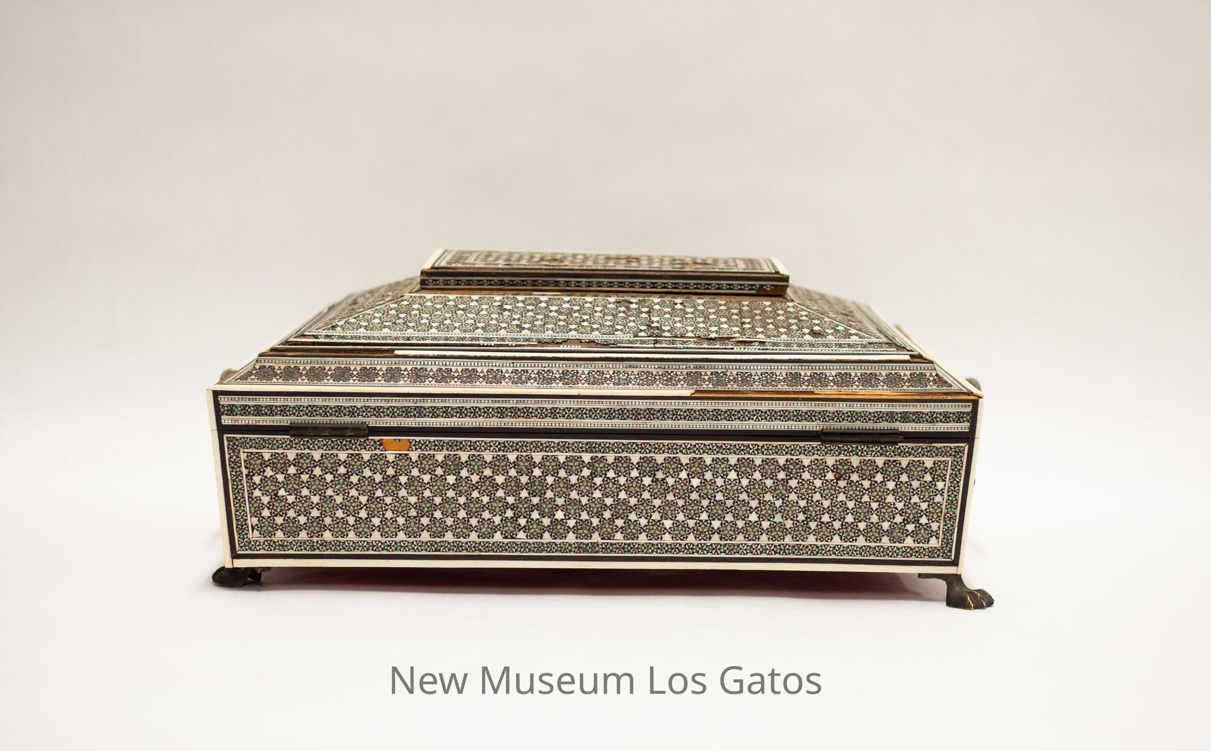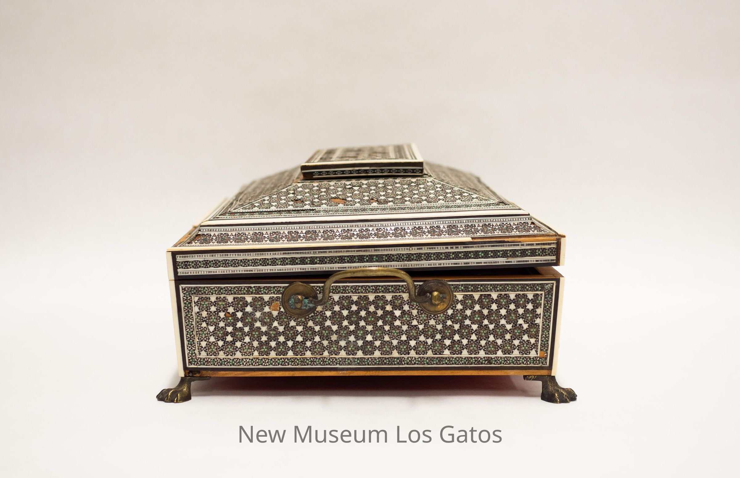 A large, rectangular wooden box with claw-foot metal legs and two metal handles. The lid is stepped, and hinges open. The box is covered in a star-patterned tile decoration. Inside, the lid is covered in red velvet, and the box itself is divided up into 17 compartments. Some of the compartments have lids that are covered in the same tile pattern as the exterior. Some of the compartments have circular holes with stoppers inside, and the lids of the stoppers have the same tile pattern as the rest of the box, but some of these compartments are missing the decorative stopper lids. And one compartments is red velvet, with five pins stuck in it. The bottom of the box is also covered in red velvet.Collection