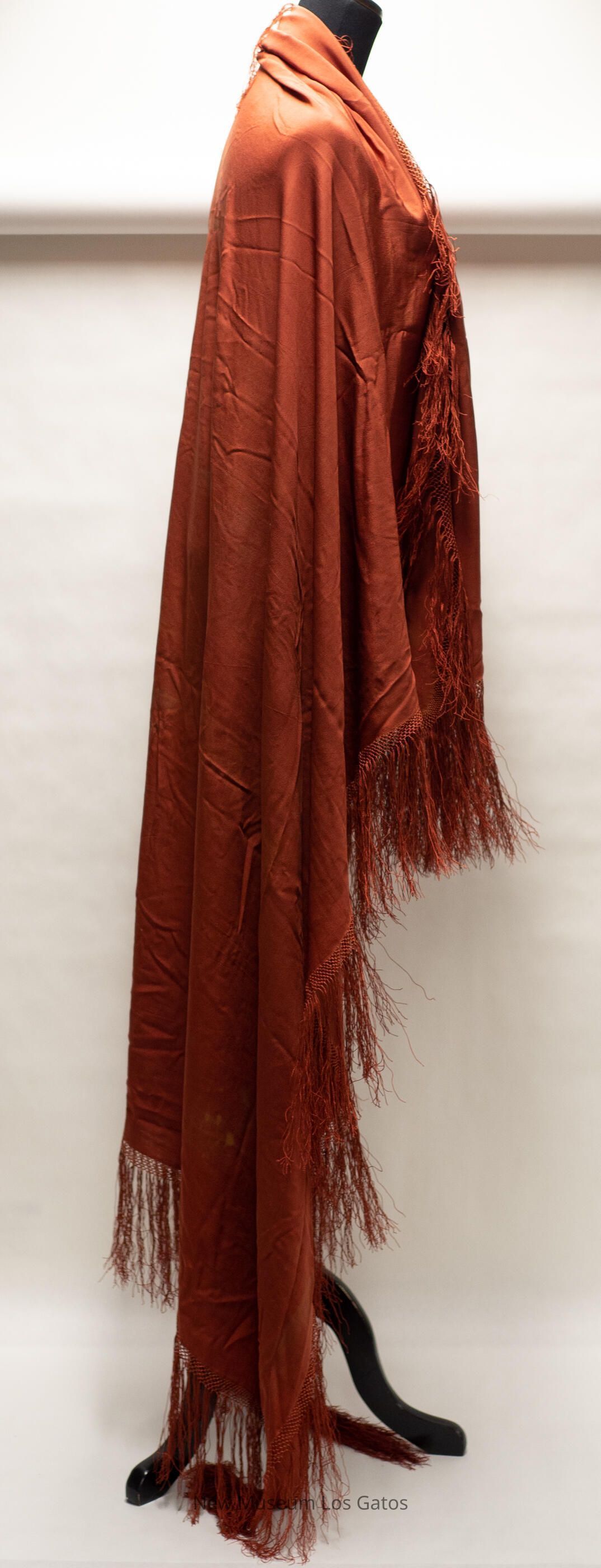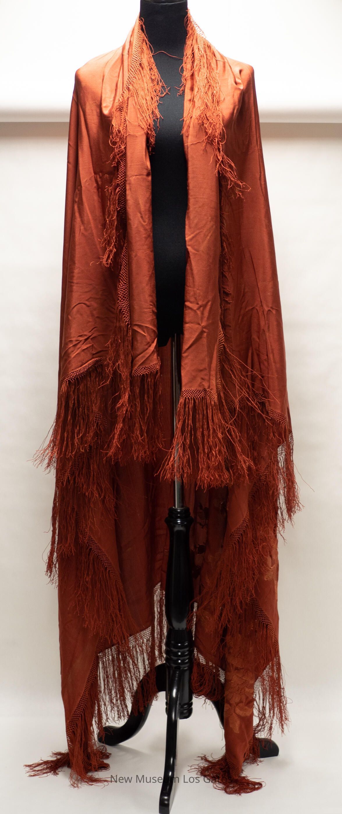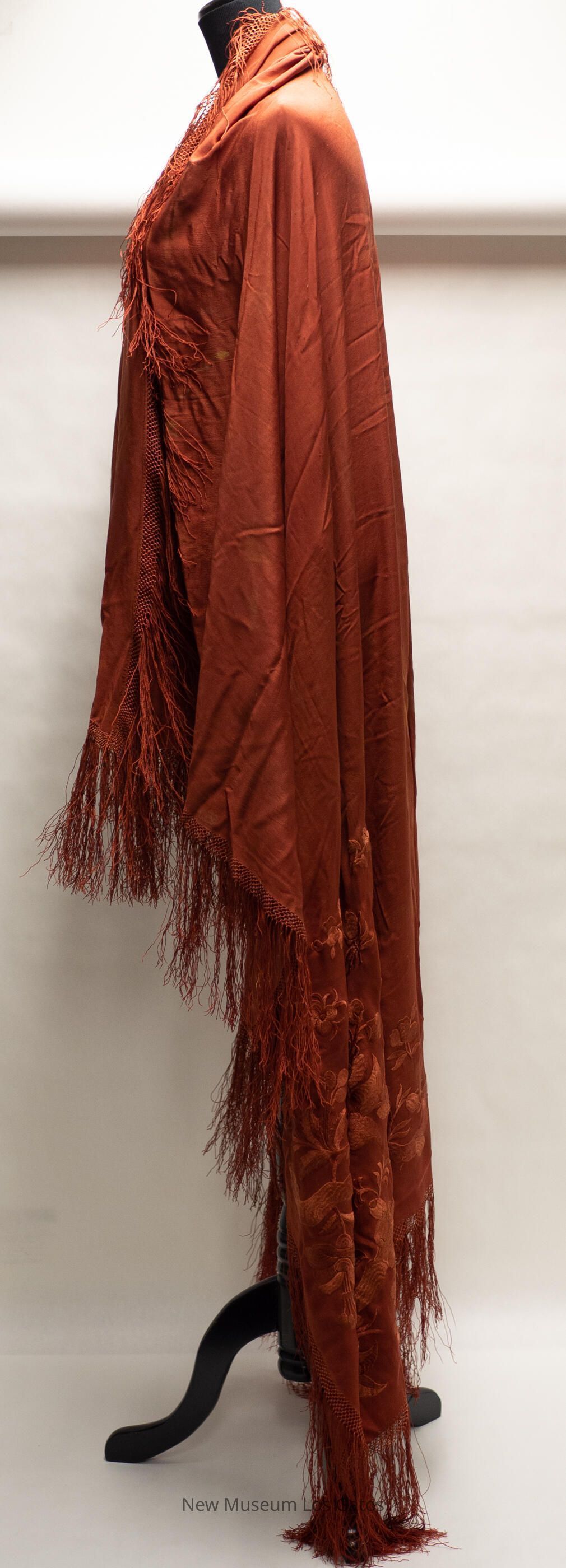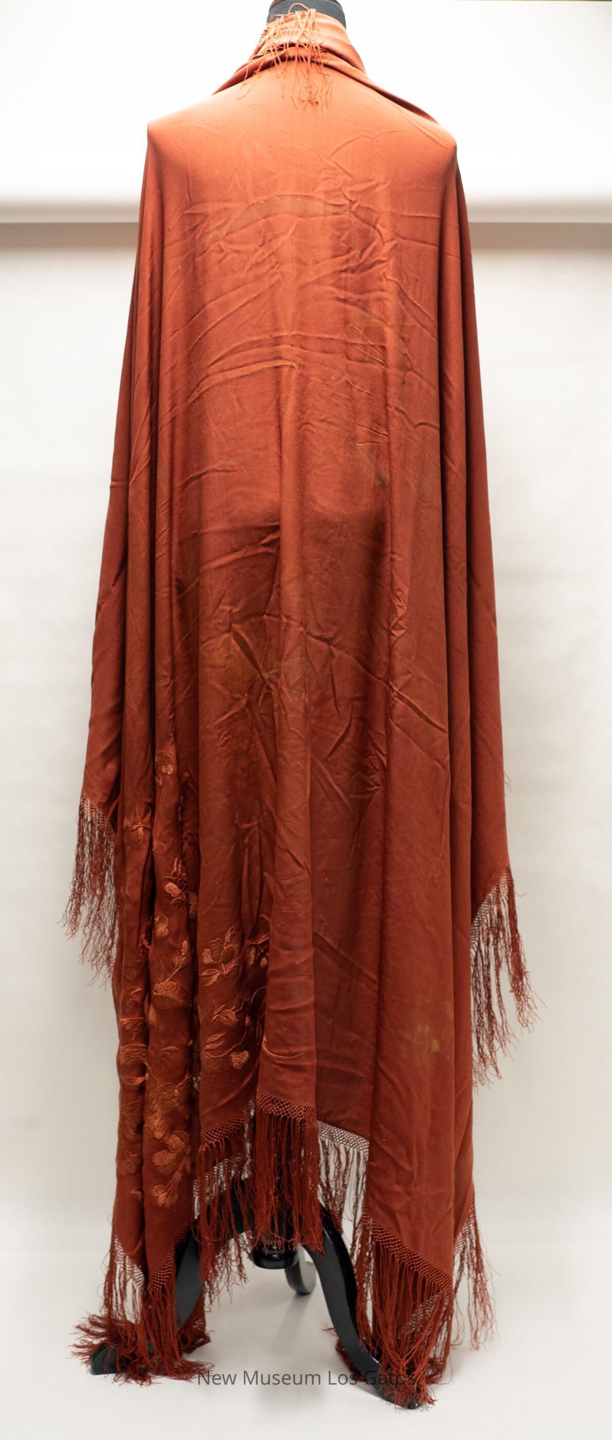A large, square rust-colored shawl. There is fringe along every edge of the shawl. There is also floral, embroidery decorating one corner of the shawl.Collection