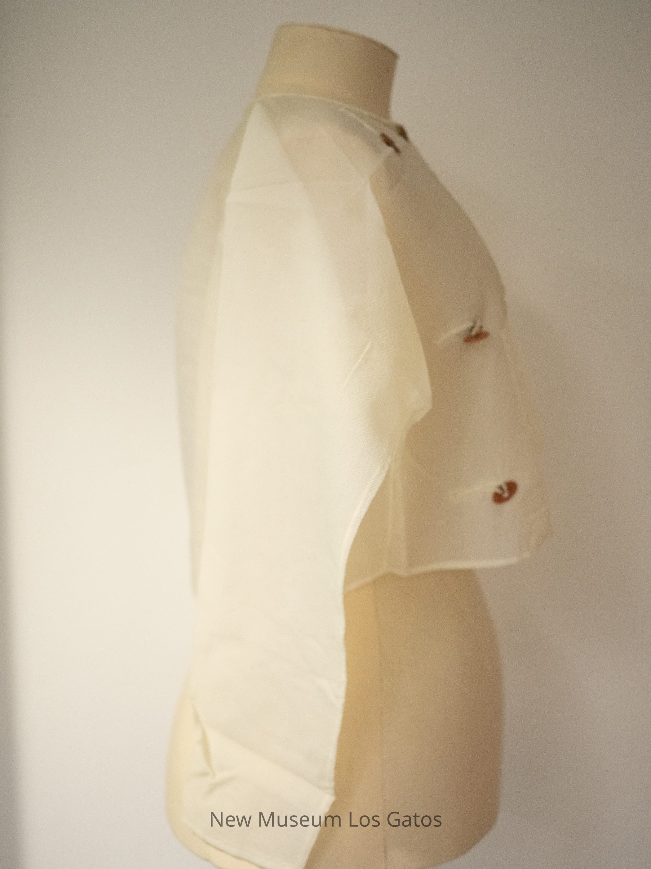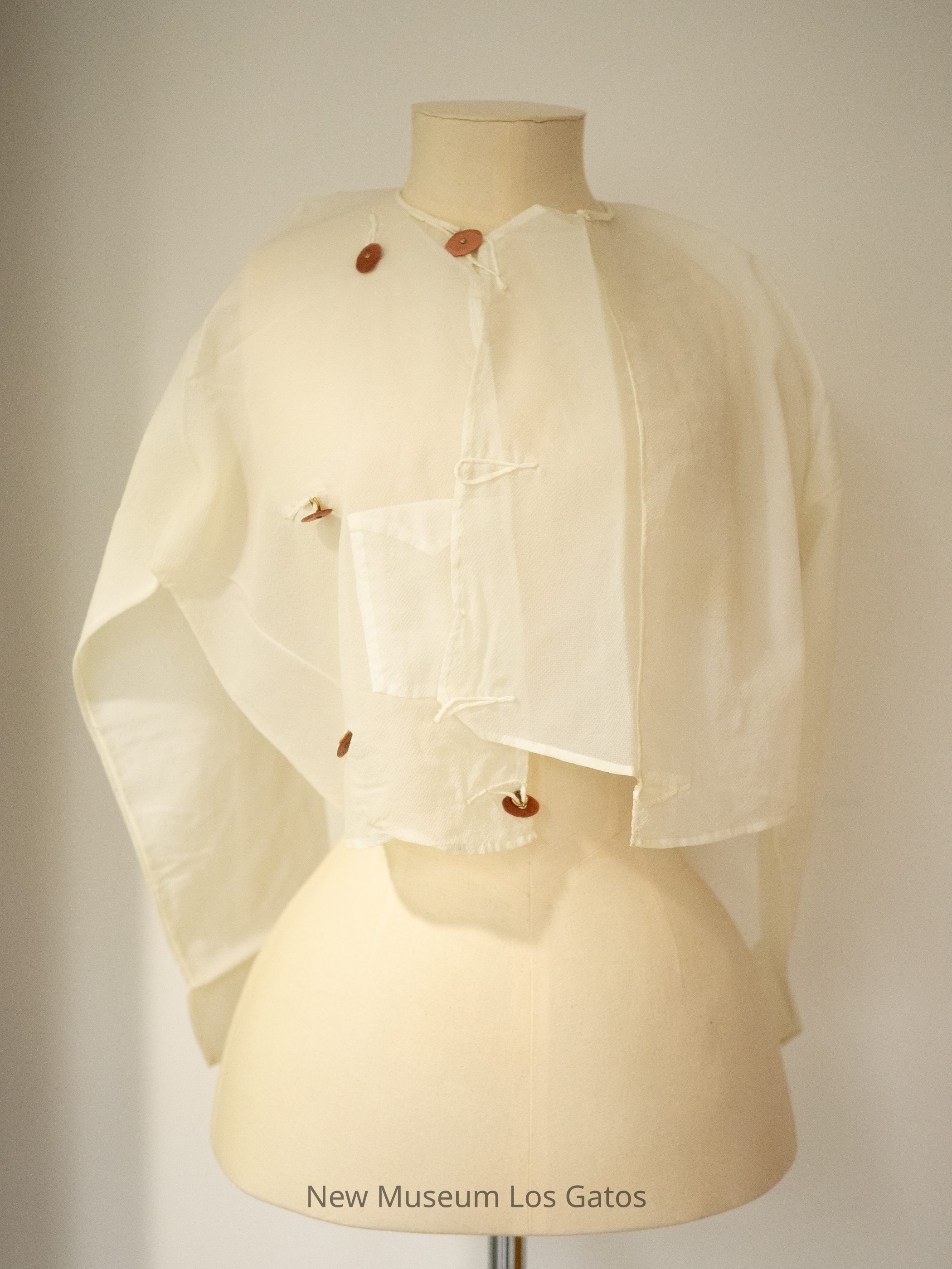 A women's loose-fitting sheer top, with a pocket on the left side and brown buttons for closure on the same side.