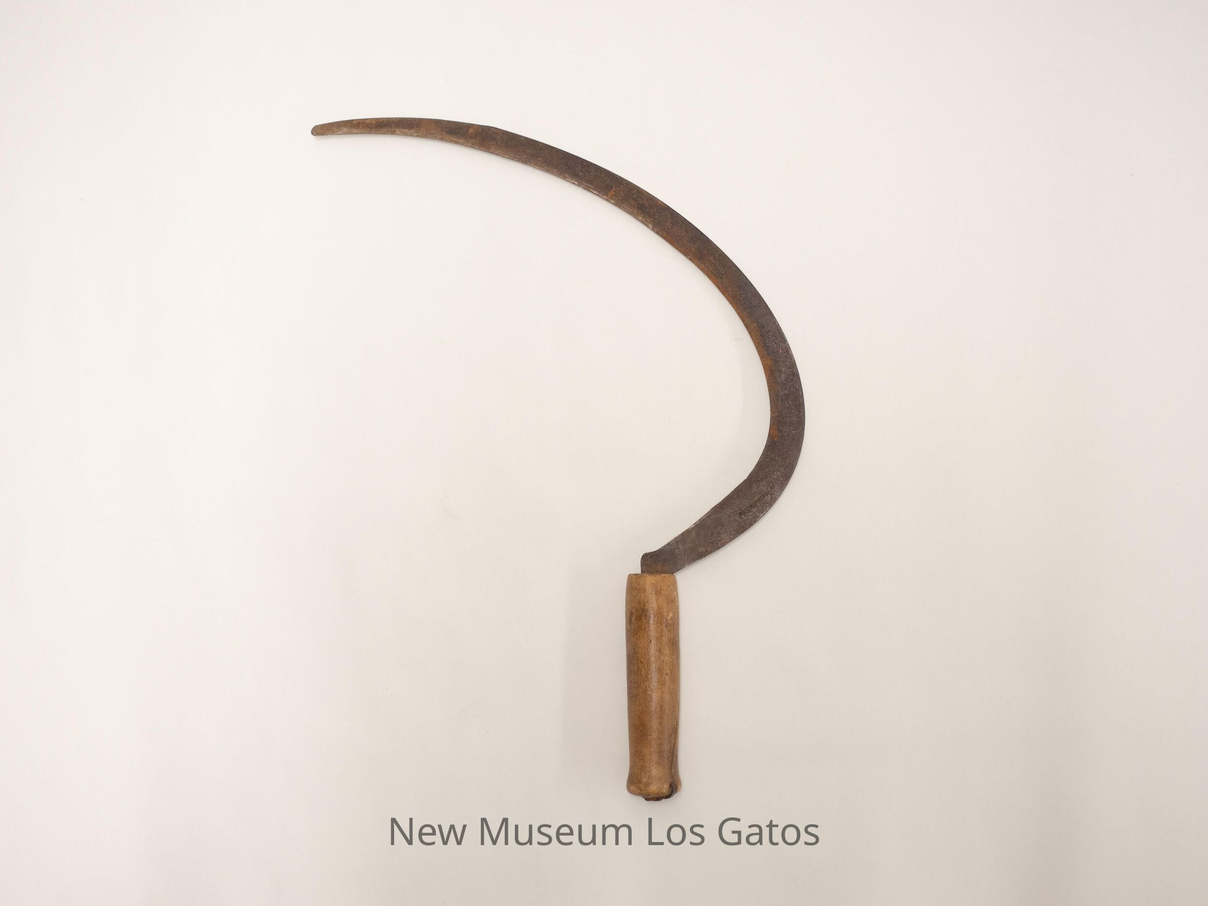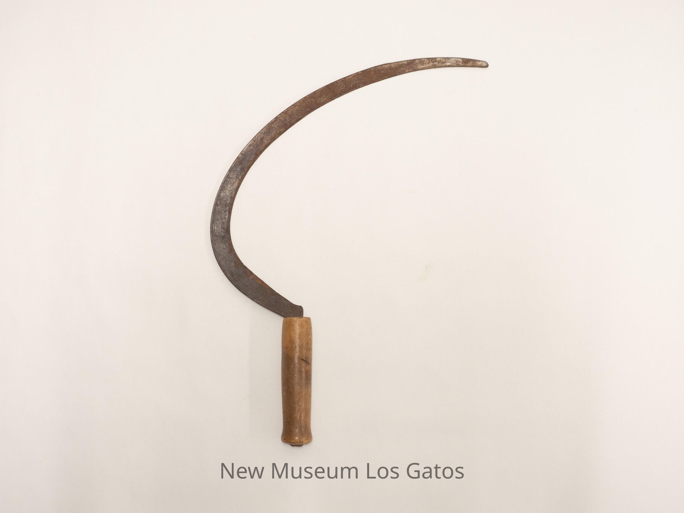 A sickle, consisting of a curved metal blade and a wooden handle.