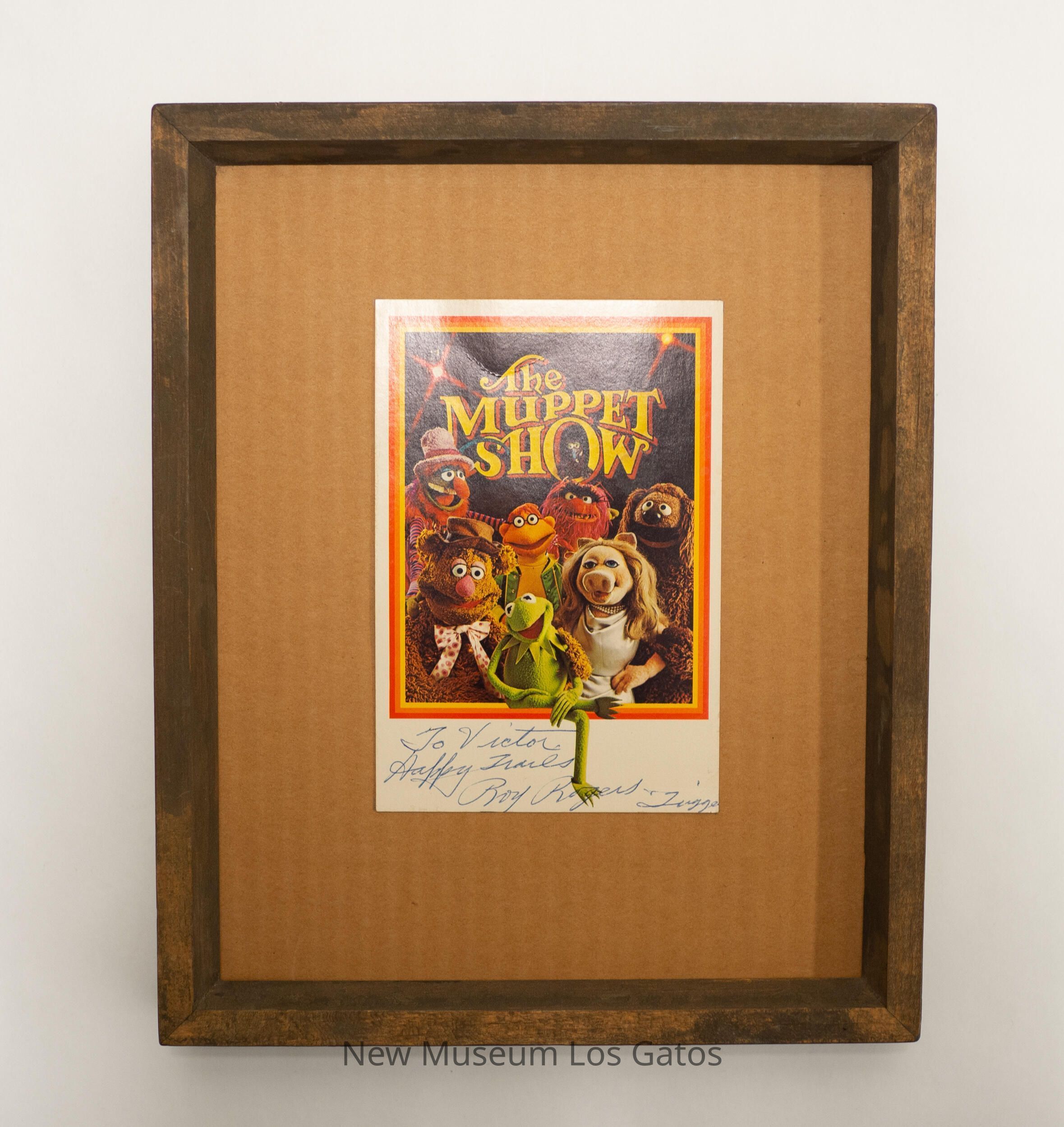 A Roy Rogers signed color postcard featuring eight of the Muppets from The Muppet Show, including Kermit the Frog, Miss Piggy, Fozzie Bear, Rowlf the Dog, Scooter, and Animal. There is a yellow, orange, and red striped border around the Muppets. Roy Rogers' signature is below the image. The postcard is mounted to a piece of cardboard inside a plain wooden frame.