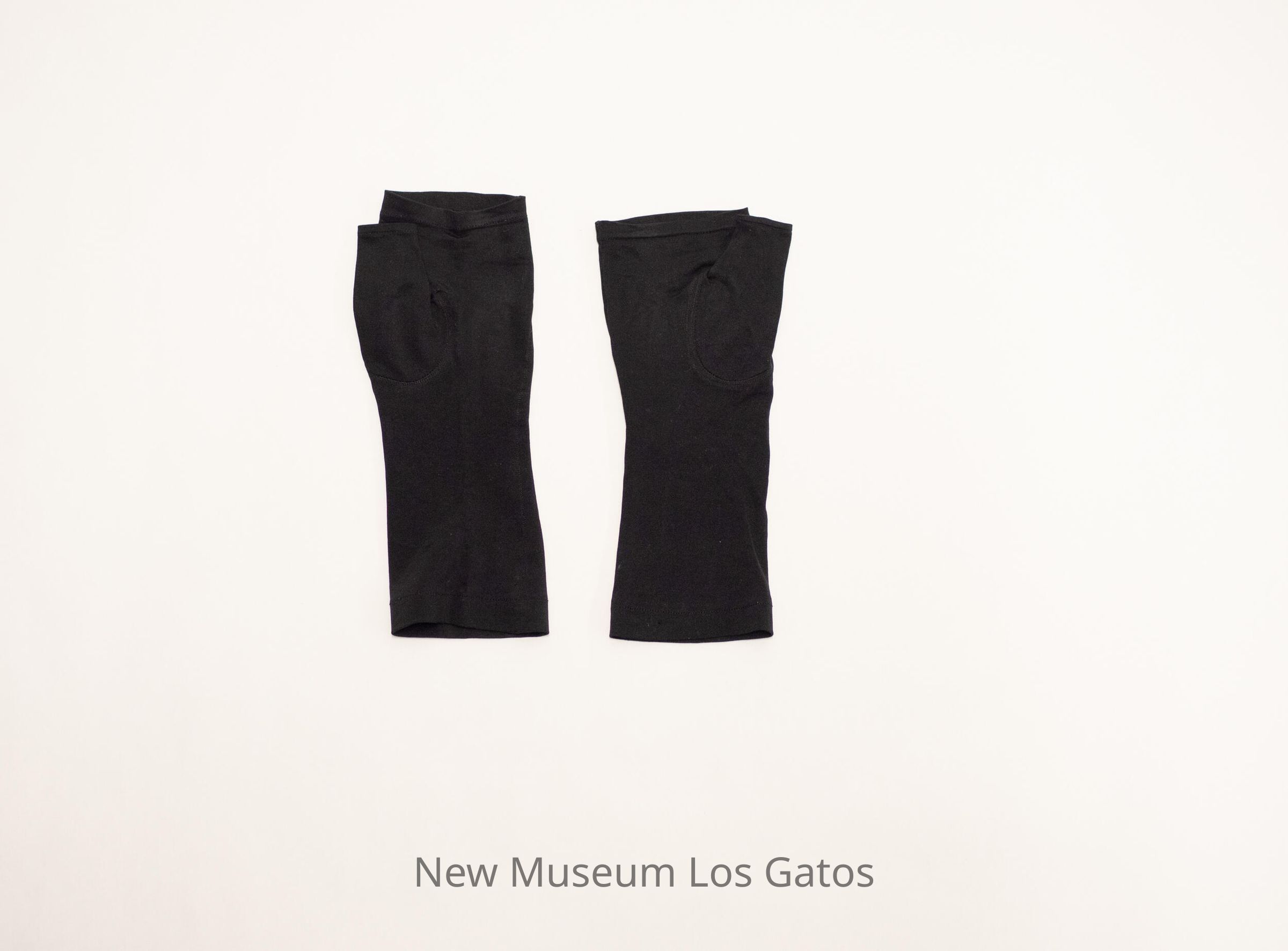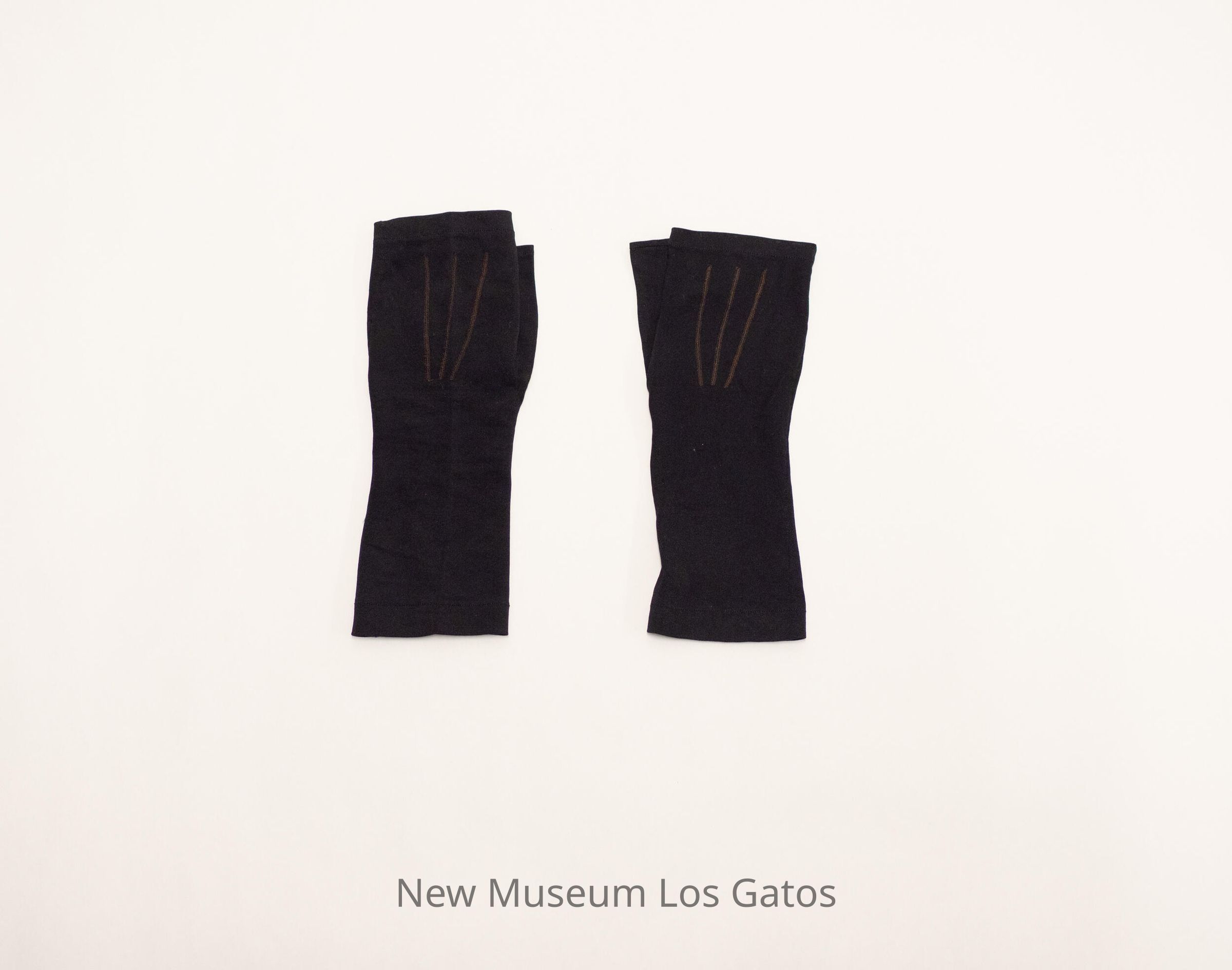 Pair of black silk mittens, with the ends of the thumb portion and the space for the other fingers exposed. There are three decorative brown stripes along the back of the hand area.Collection