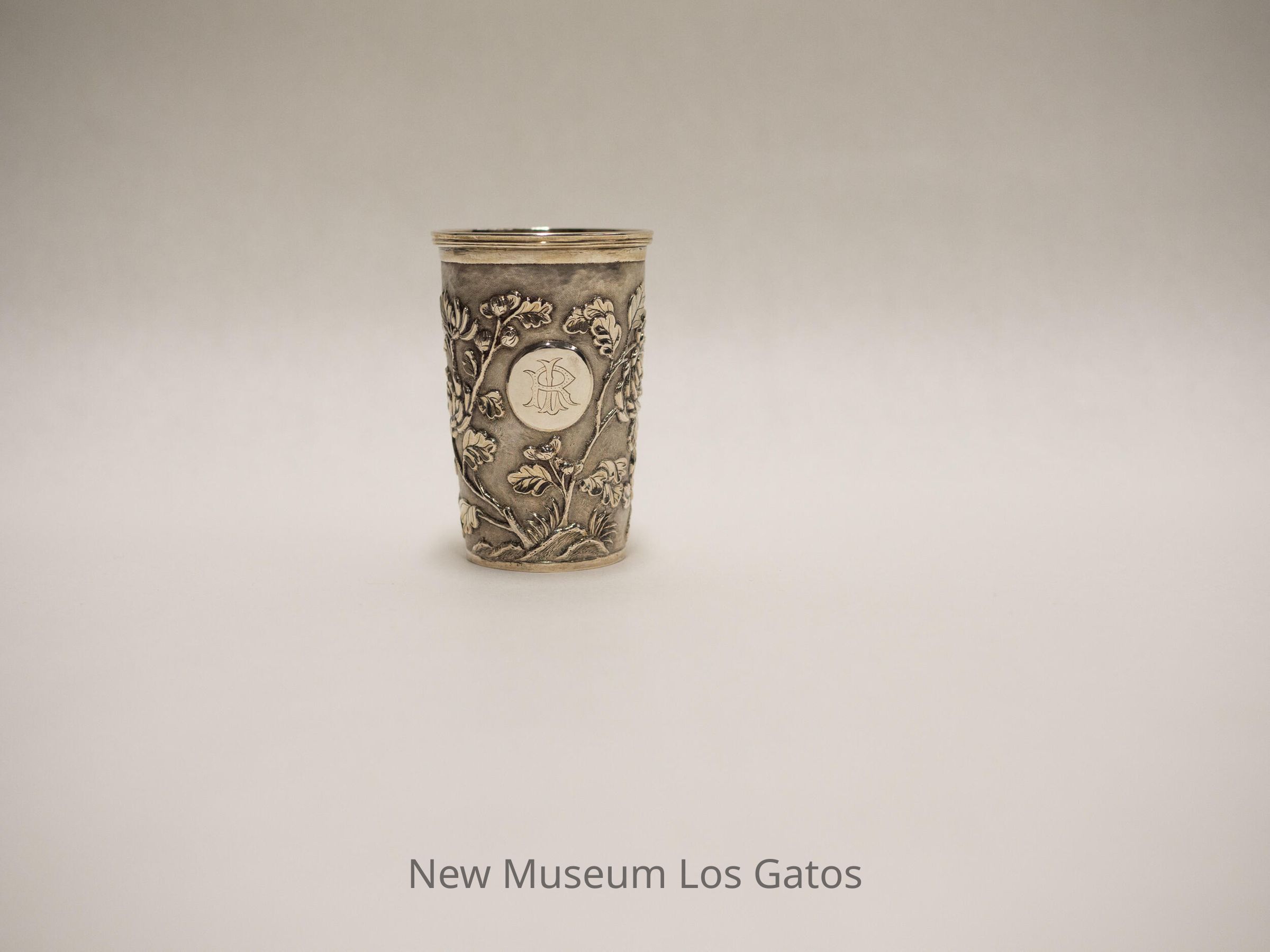 A silver candle holder, with flowers and leaves decorating the face of the cup. The initials "L" and "R" are engraved on a circle on the face.