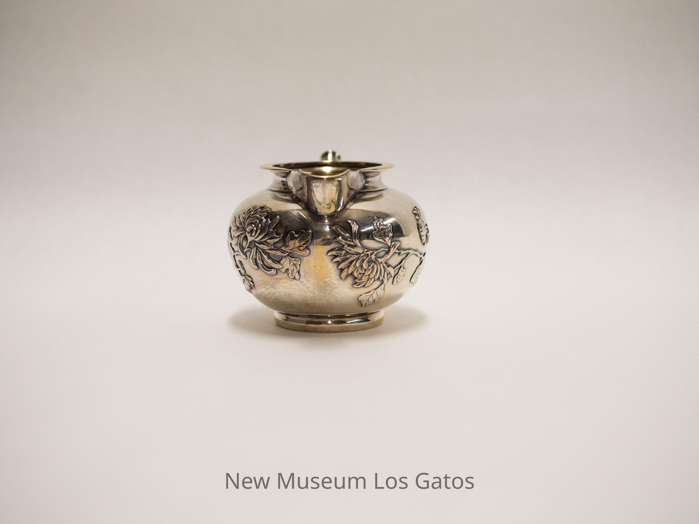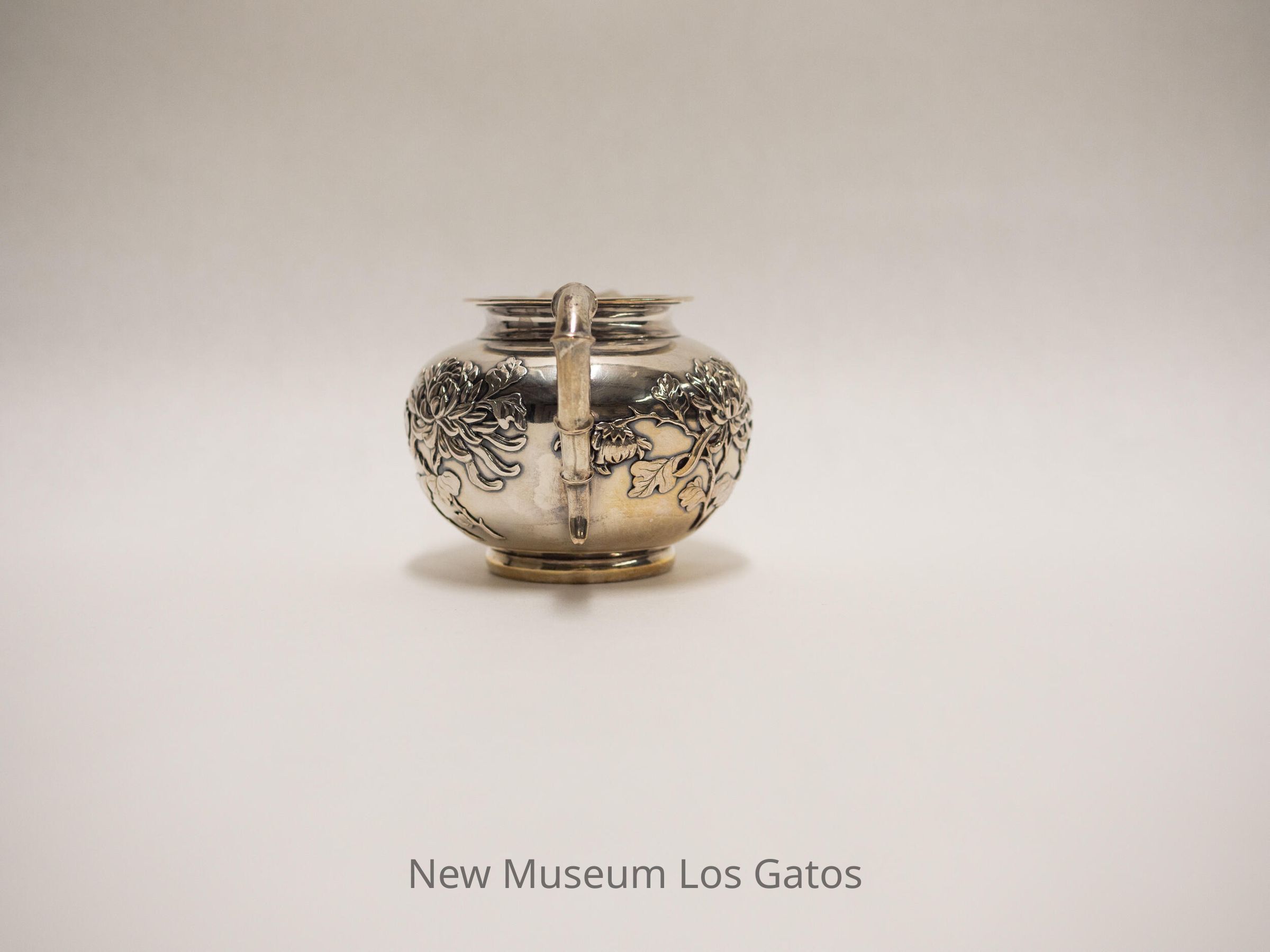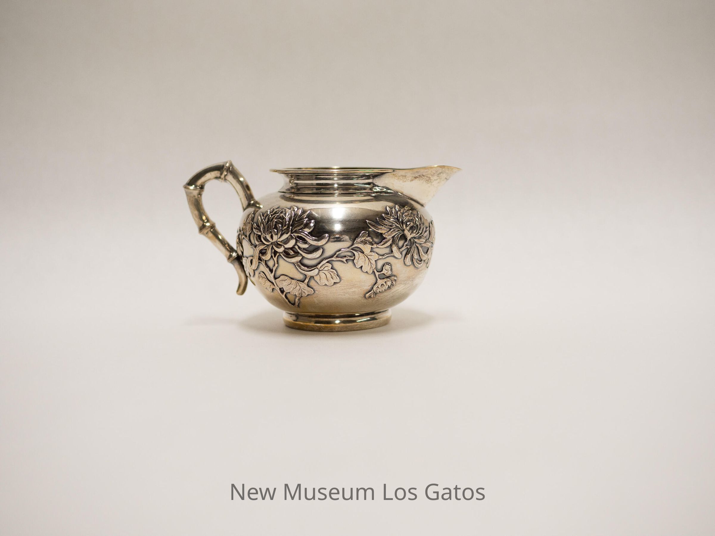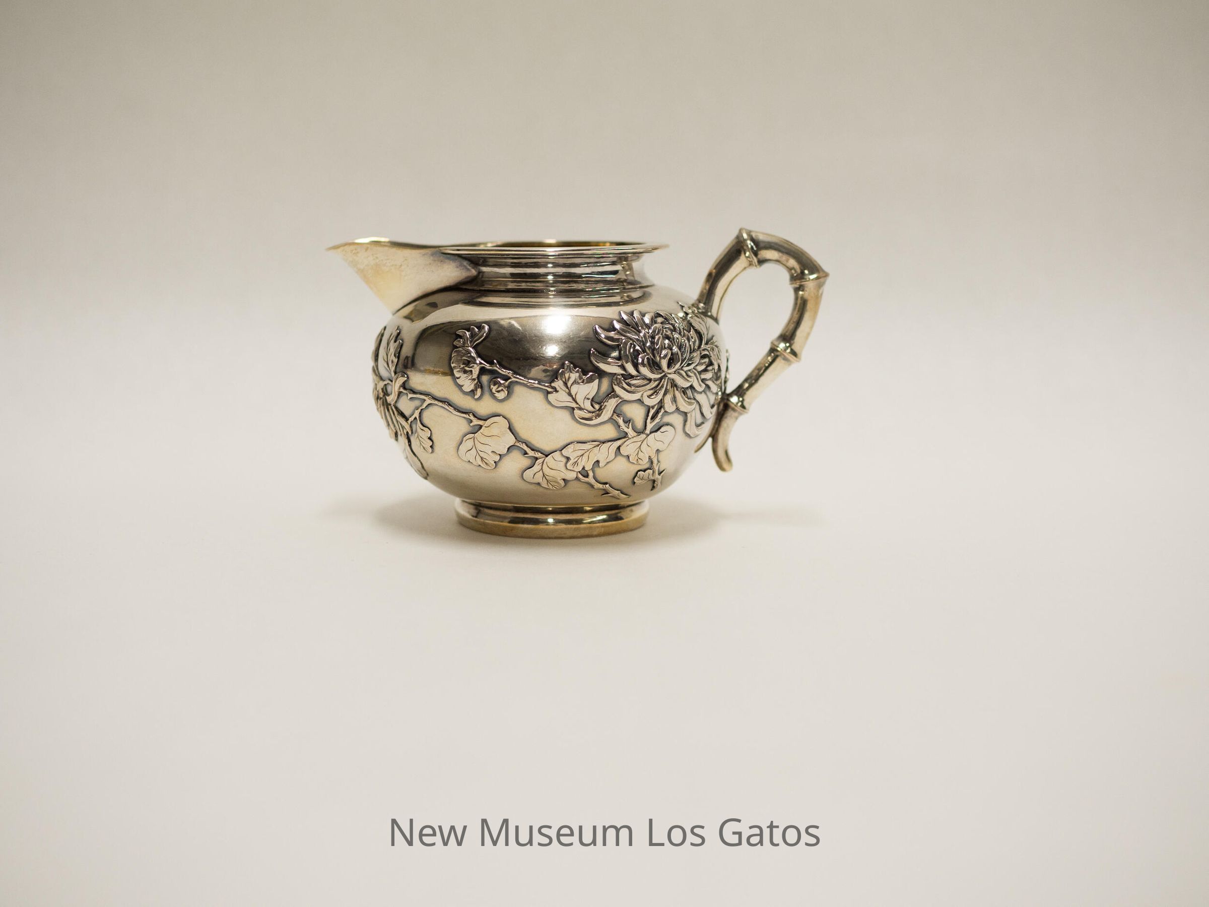 Small silver creamer, with flowers and leaves decorating the outside, and a handle that mimics the shape of bamboo.