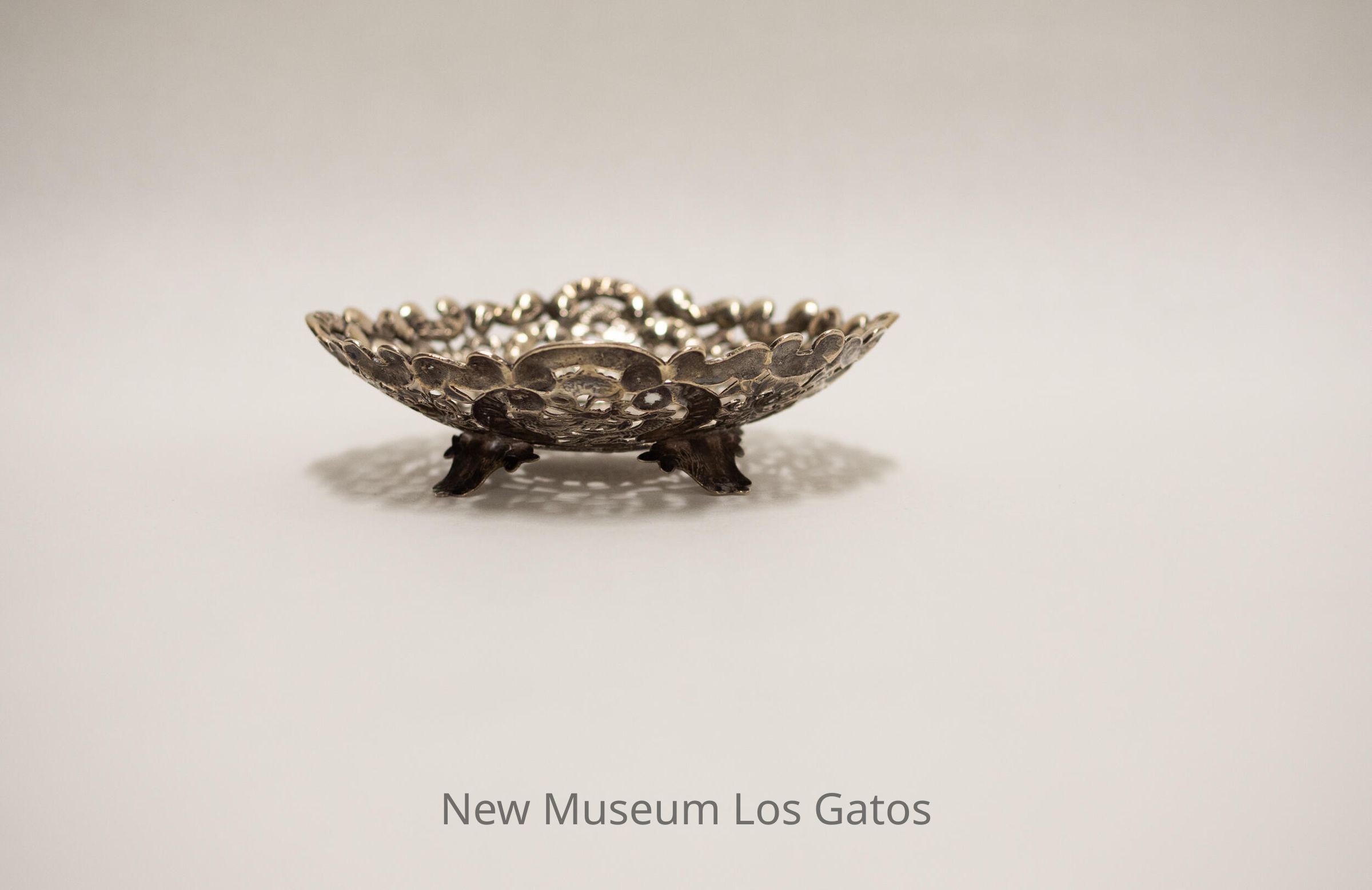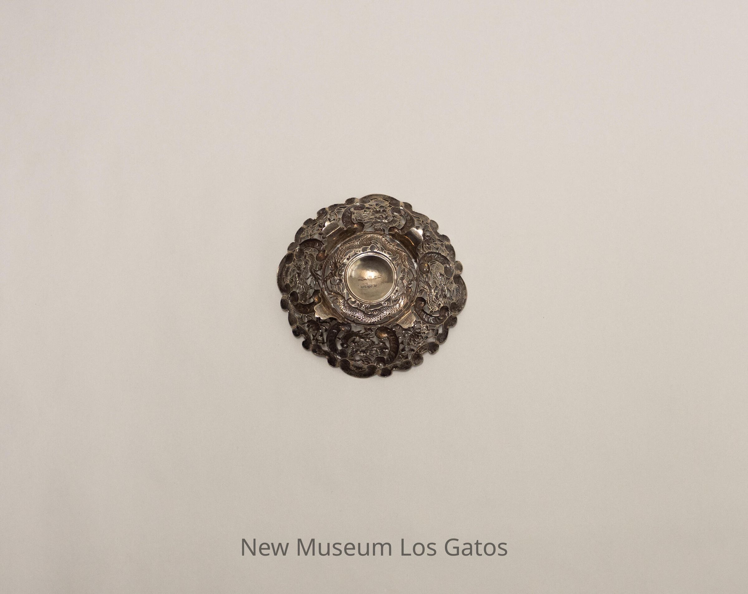 Small, circular silver dish, with openings between the decorations surrounding a solid center. There are two dragons circling the solid center, and a dragon and flower pattern making up the remainder of the decorative elements. The dish's feet are shaped like flowers.