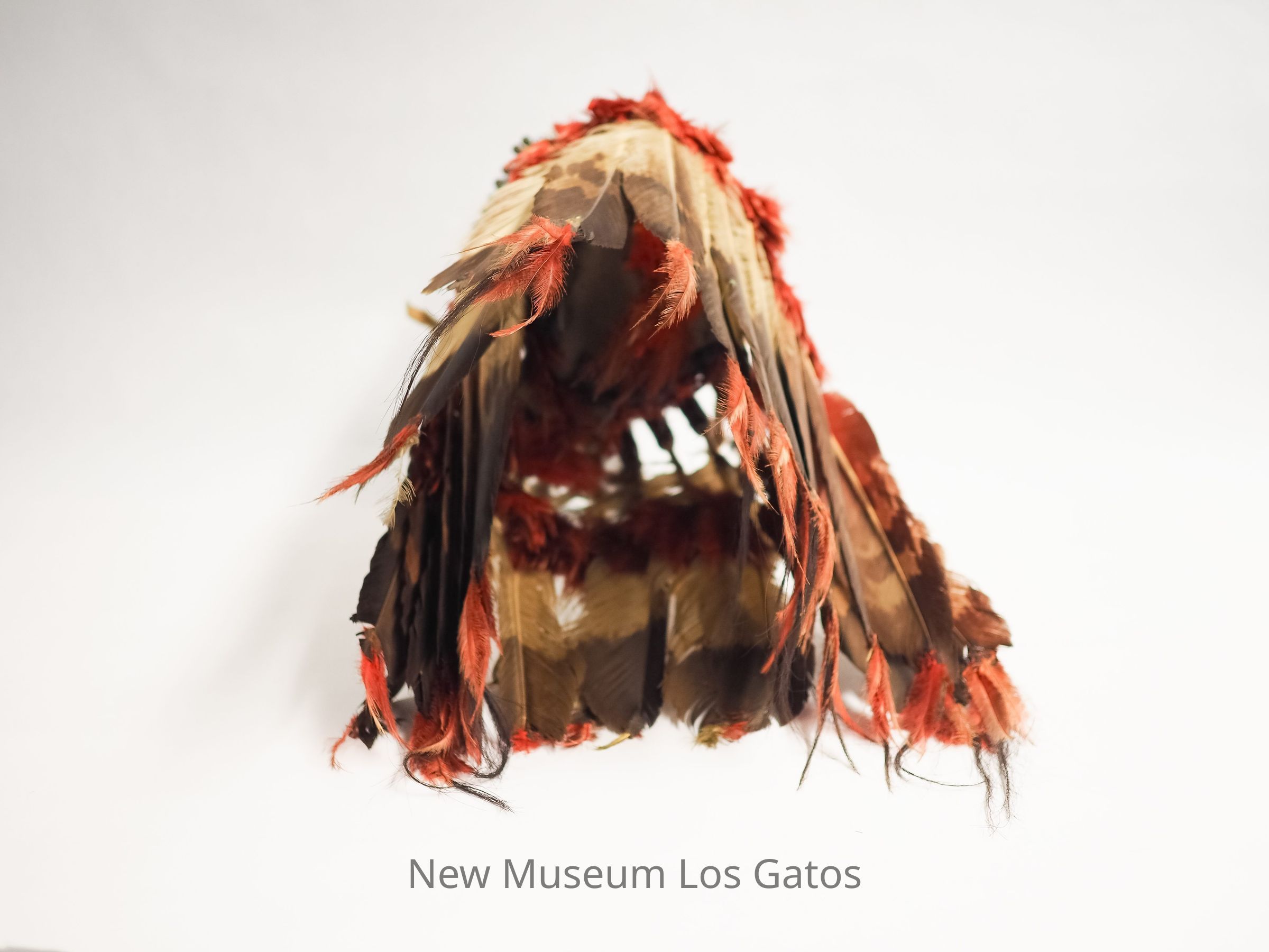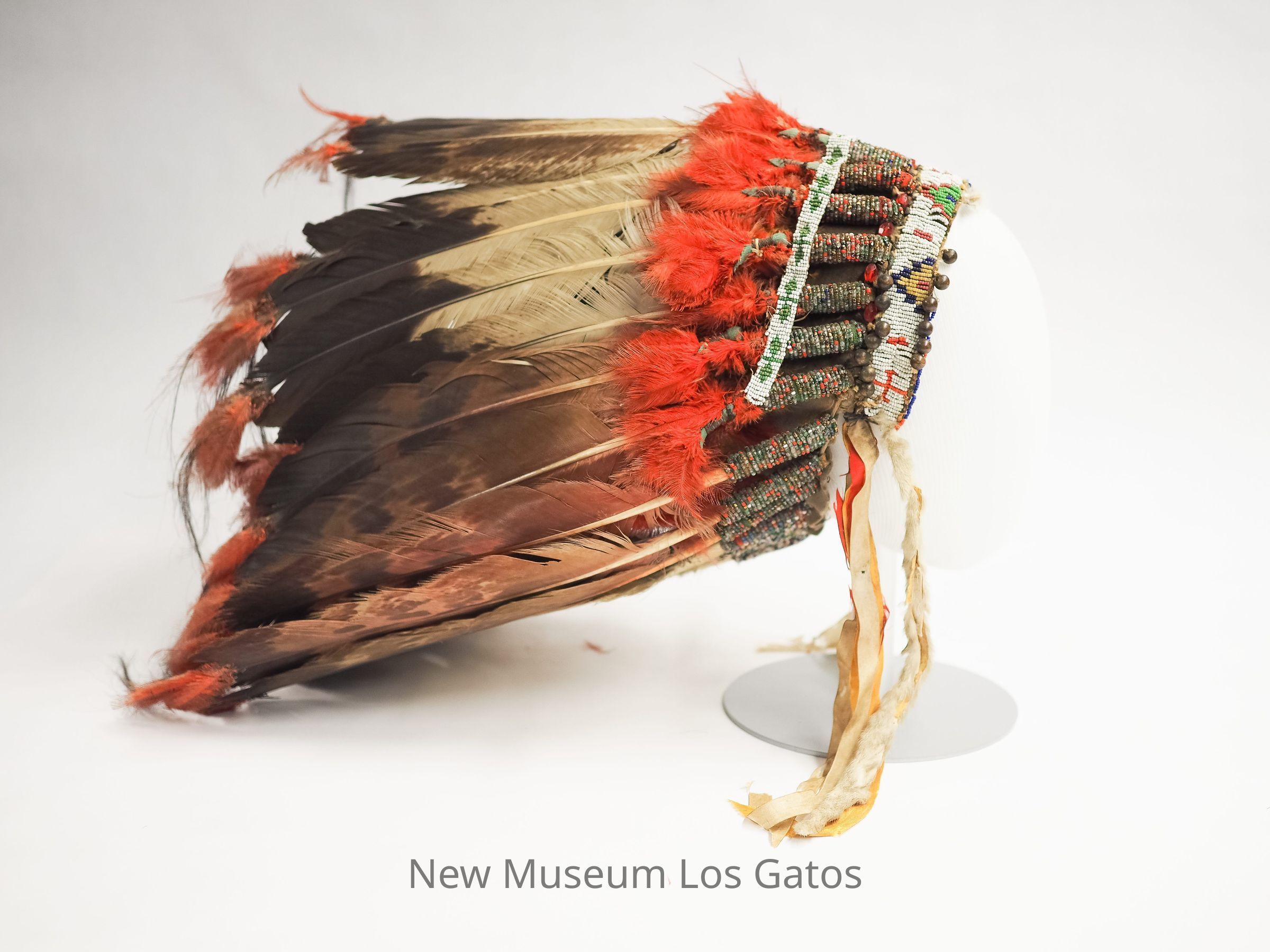 "Turkey feathers trimmed w small red feathers at base and tip - also horse hair tips. quills at base of feathers wrapped w strings of mixed colored seed beads. Ribbons and fur strips hanging from each side. Needs beaded head band sewn to bonnet. Bonnet made on brown of a crown of a felt hat. Upper surface of felt hat is covered with small red and blue feathers."