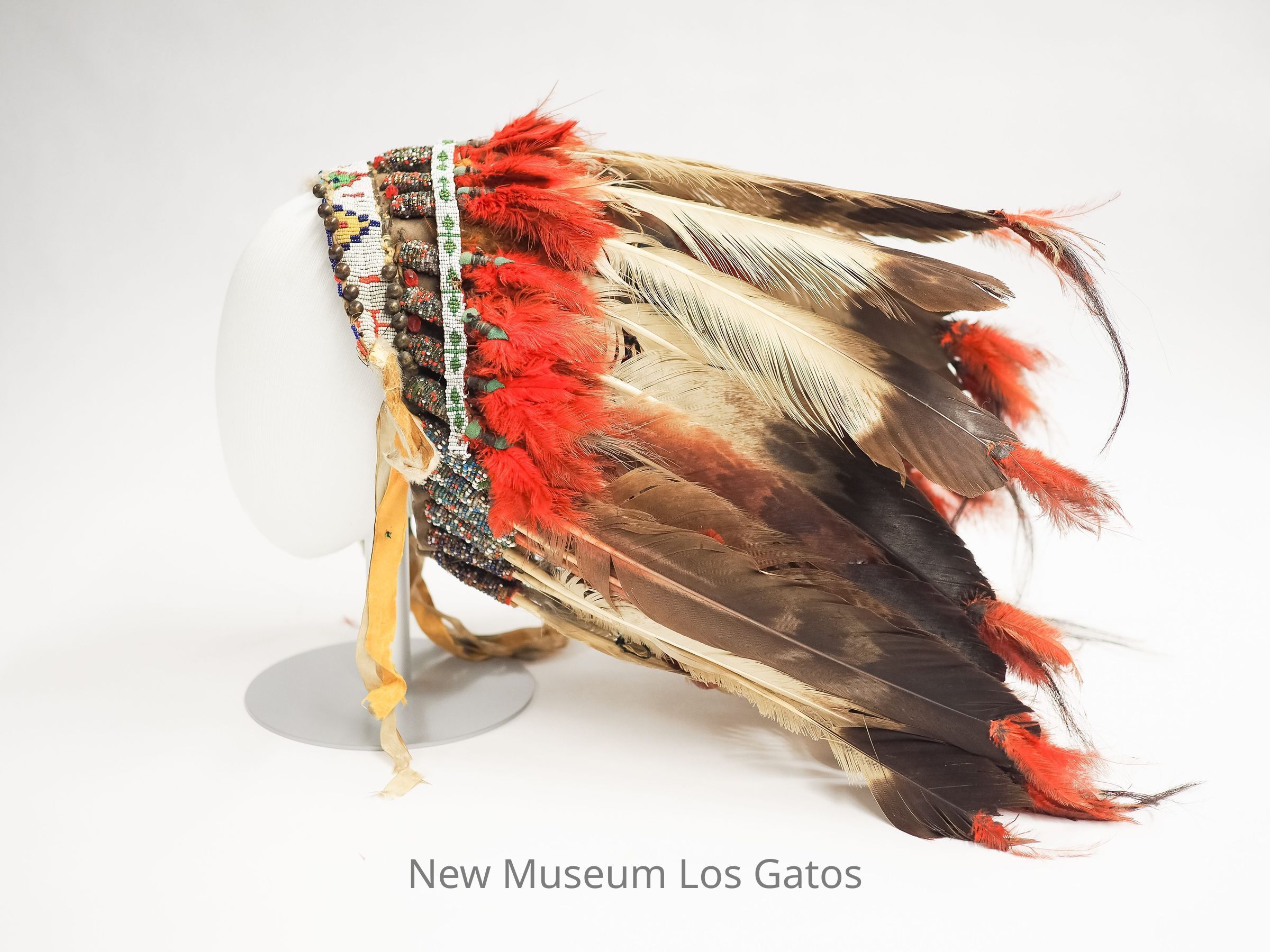 "Backward slope of bonnet marks it as belonging to upper Plains Indians (also Turkey feathers). Some of the seed beads are faceted - green transparent, red, metallic.