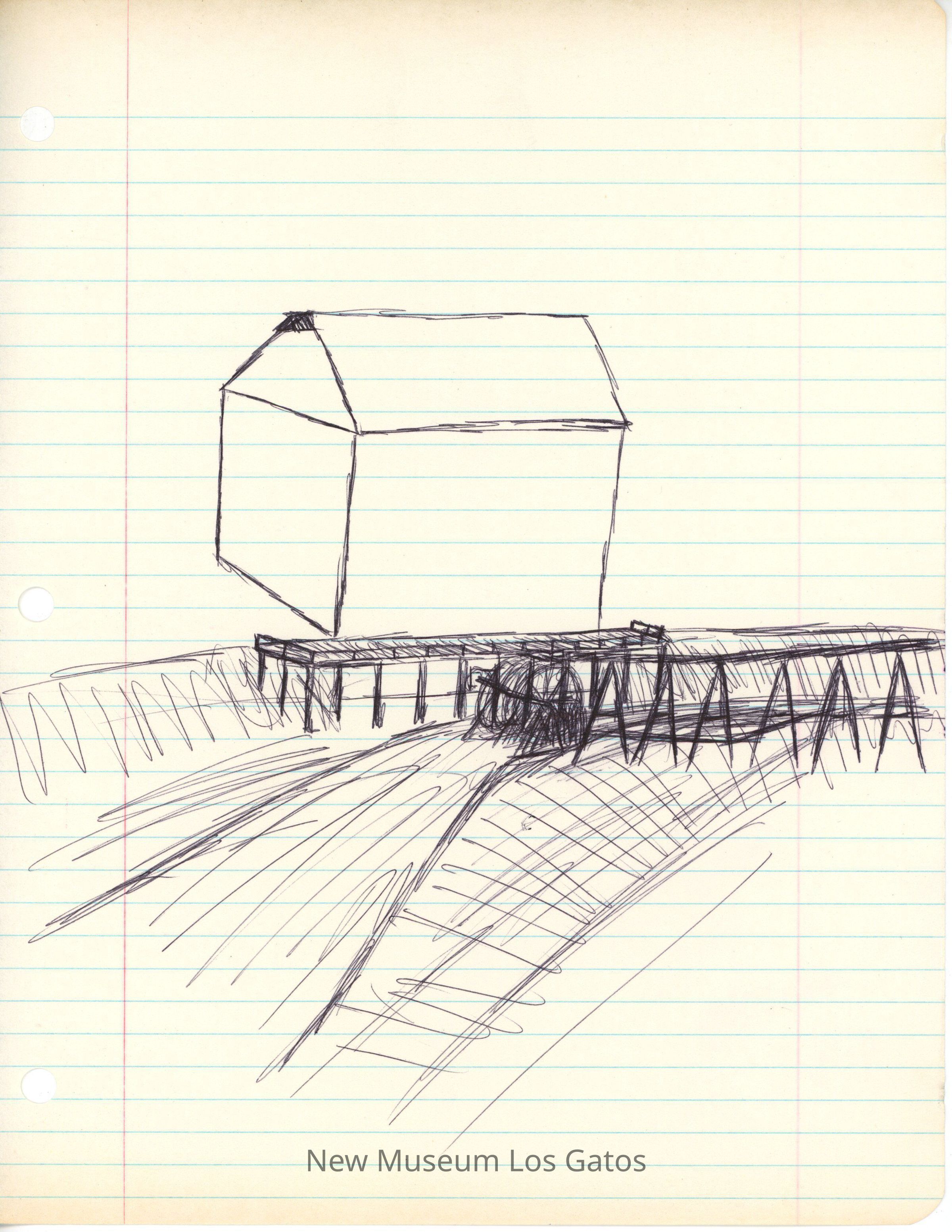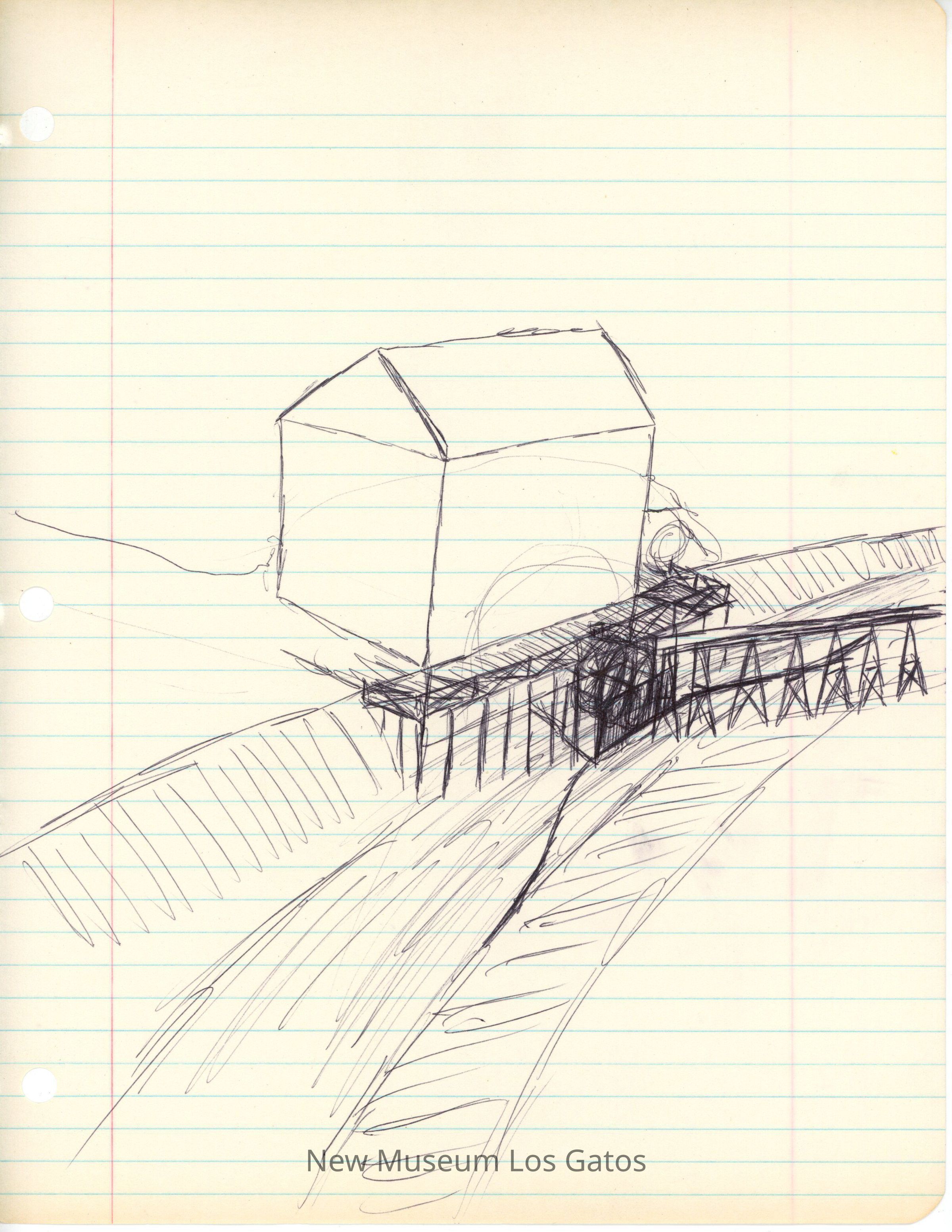 Four sheets of paper, two plain and two lined, with sketches of Forbes Mill from four different angles. The sketches on plain paper are in pencil, and the sketches on lined paper are in pen.Subjects