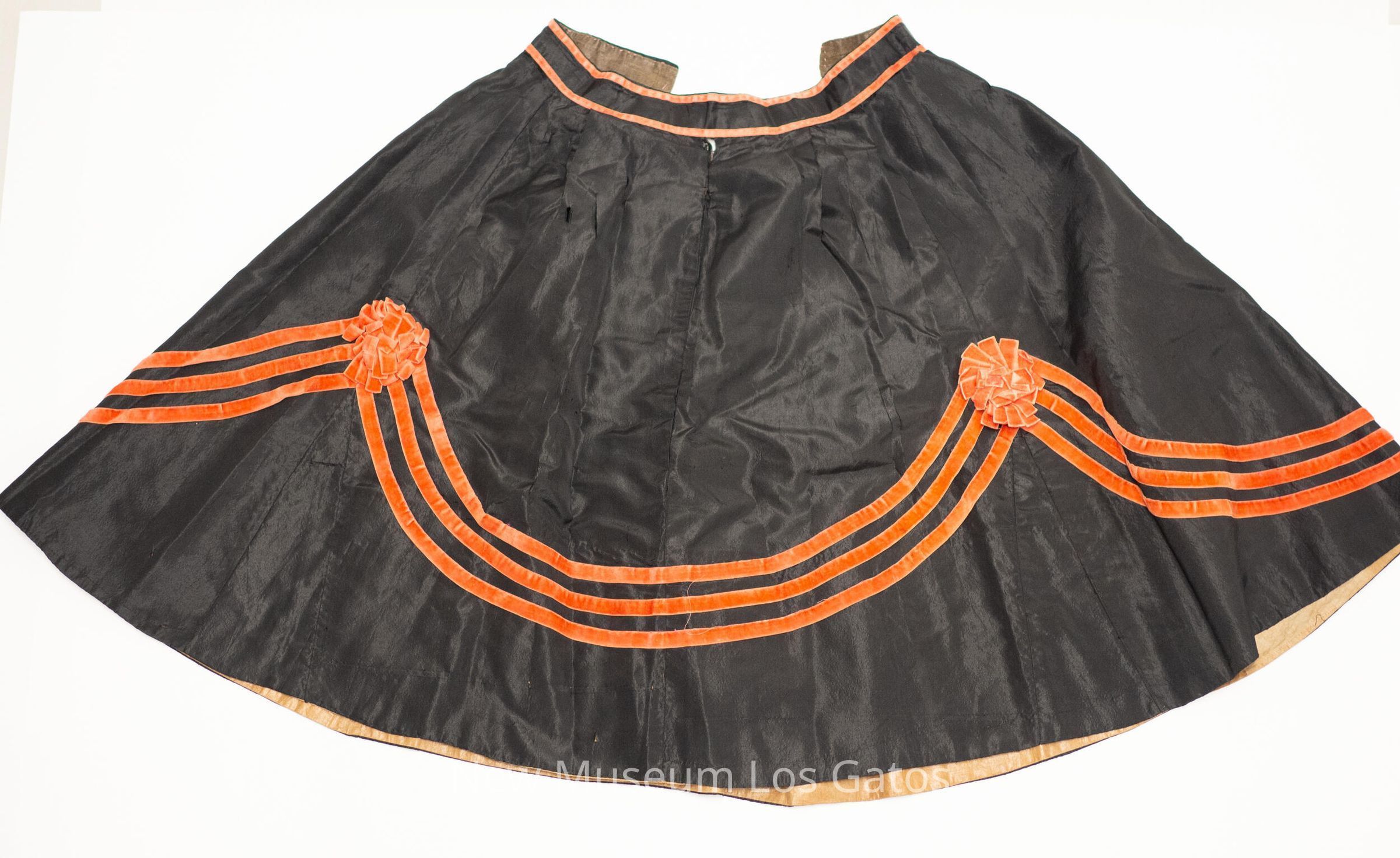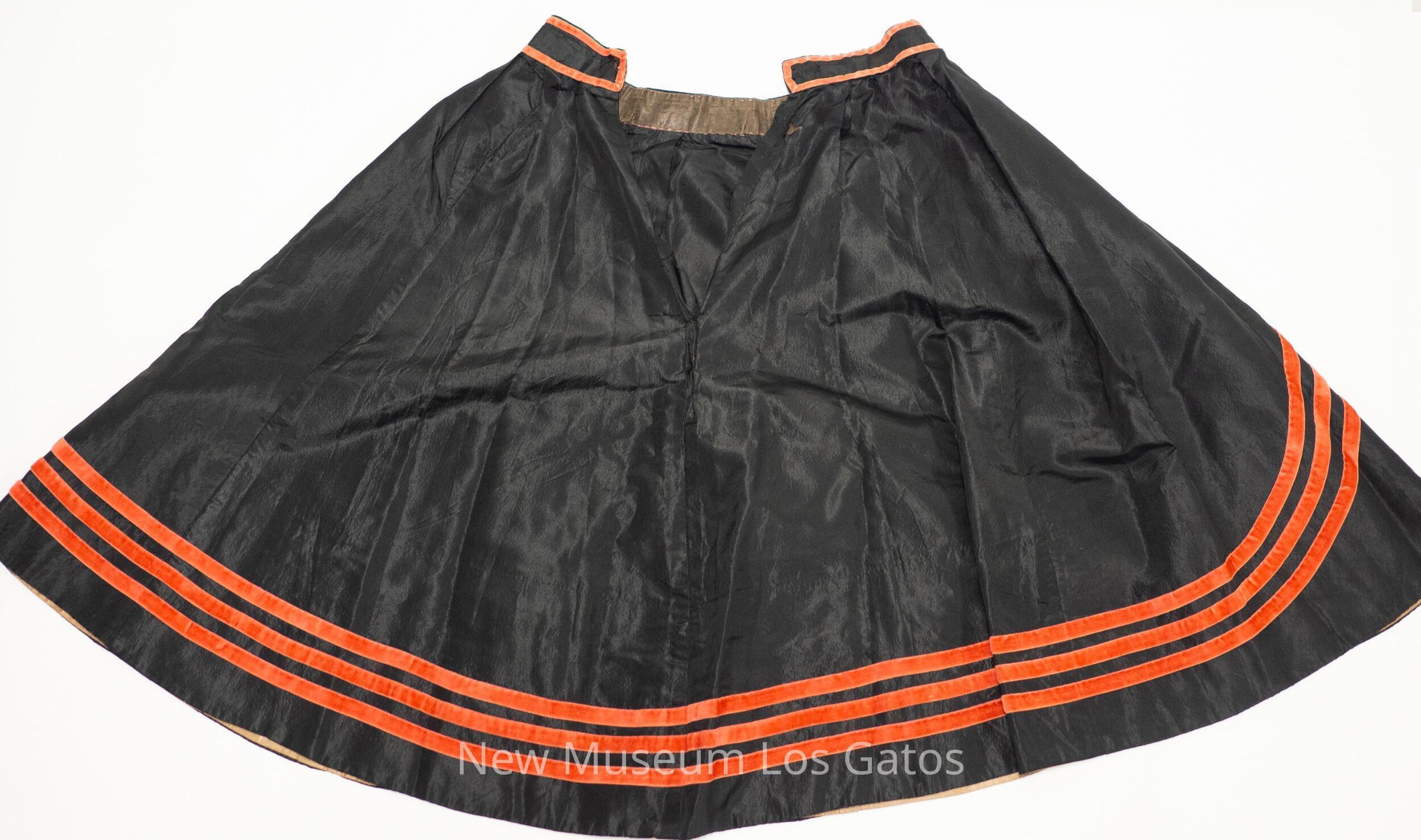 Short, black skirt with two red stripes along the waist, and three red stripes along the bottom, which veer up in the front and have red flowers at the peaks. Inside the skirt, there is a hardier, brown fabric along the bottom.Collection