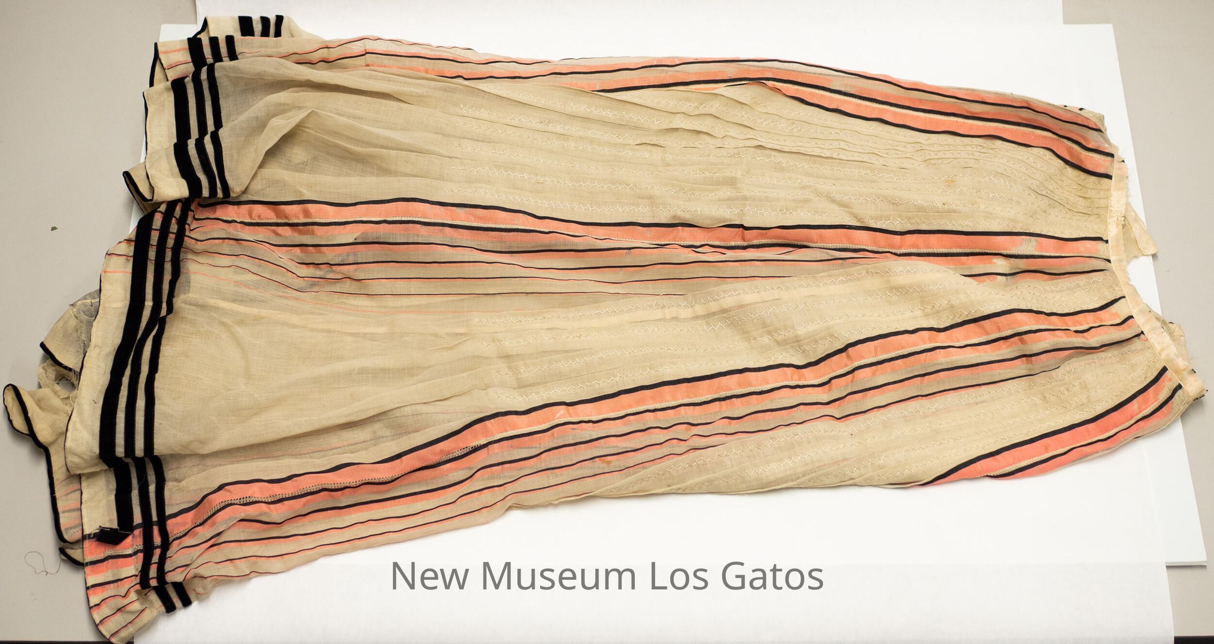 A long, sheer beige linen skirt. There are vertical pink and black stripes throughout the skirt, with zig zag embroidery detailing in between the stripes. There are three horizontal black velvet stripes along the bottom of the skirt. The skirt opens in the back, and closes at the top with hook and eye clasps.Collection
