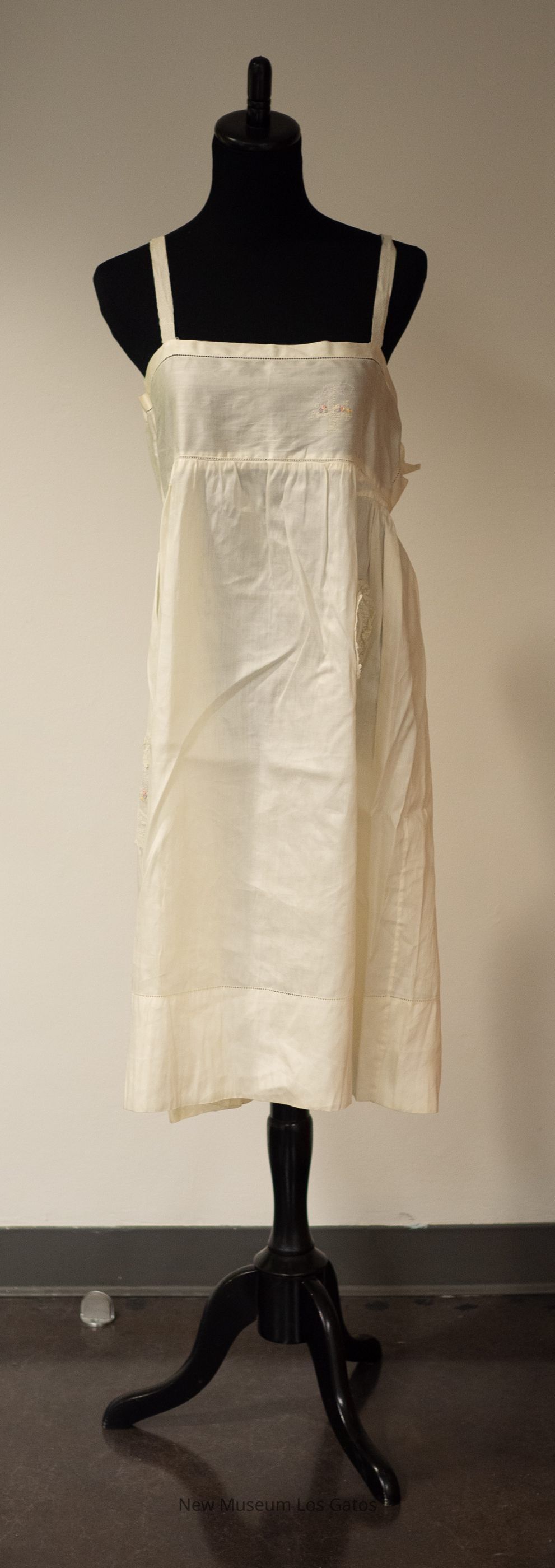 A white slip. The slip is sleeveless, and has thin white shoulder straps. There is eyelet detailing along the neckline, across the chest, and above the hem line. There are three lace appliqués with colorful floral embroidery in the center throughout the skirt, and just the colorful floral embroidery decorating the chest.Collection