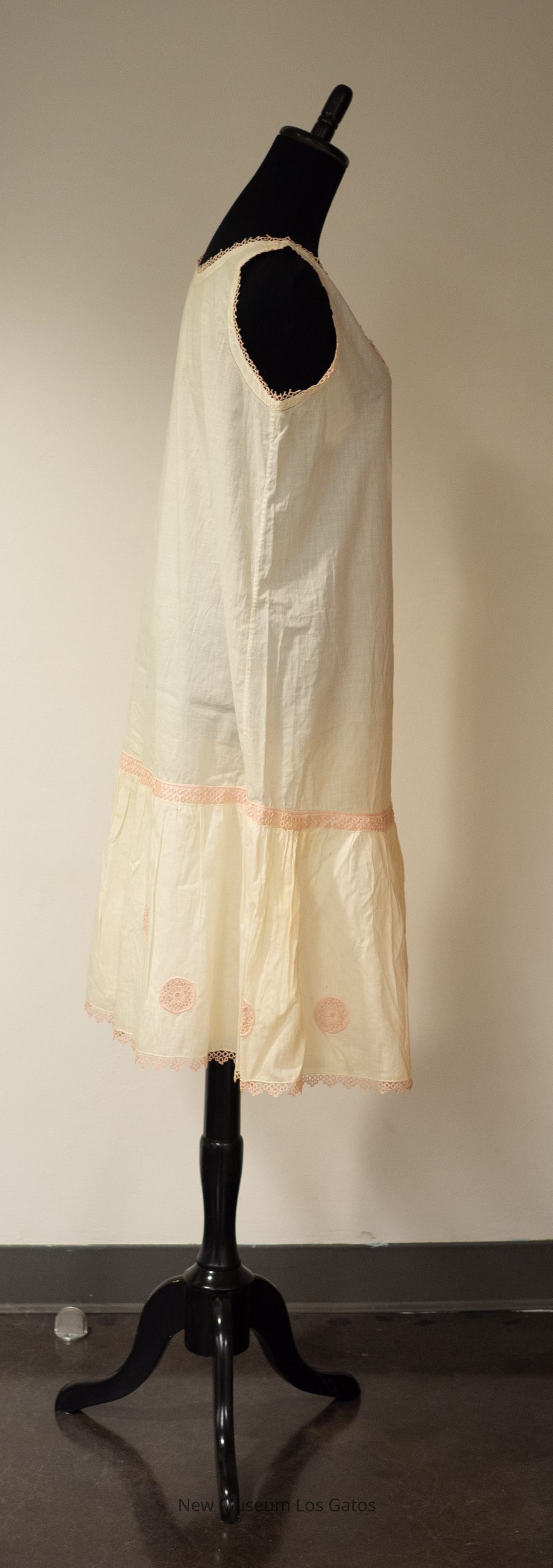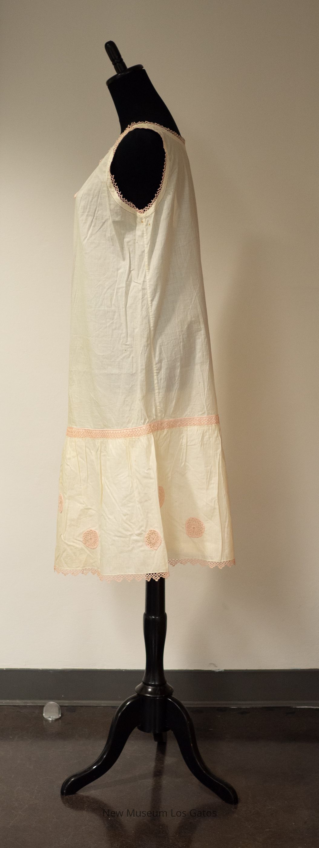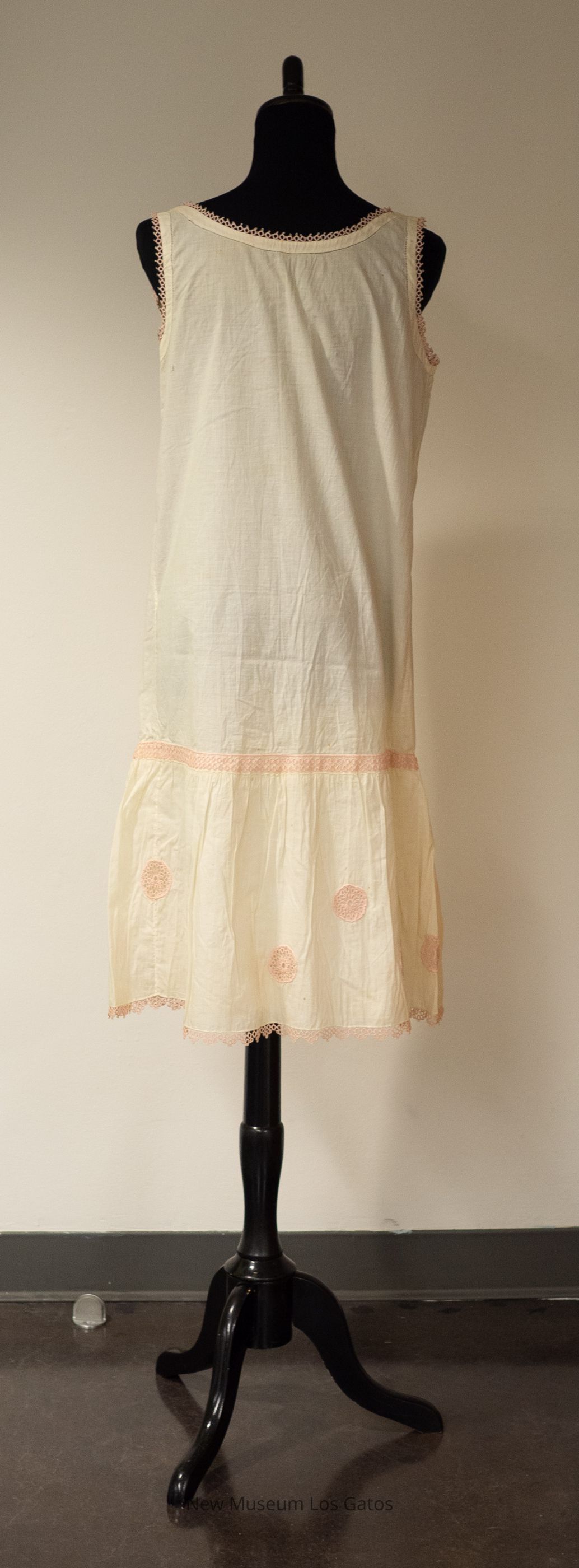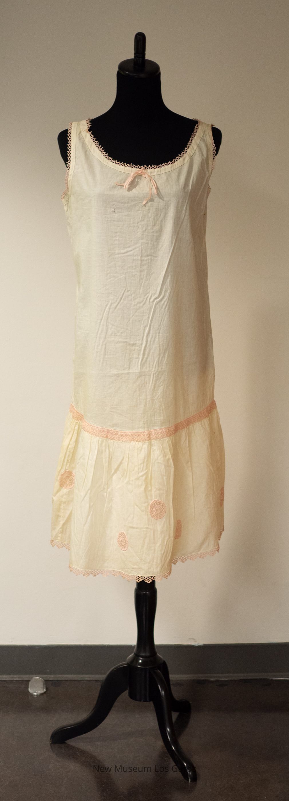 A white, sleeveless slip. There is pink tatting detailing along the hem, the neckline, and the arm holes; there is also pink tatting inset as a horizontal band near the bottom of the slip, as well as in pink circles between the band and the hem. There is a decorative pink ribbon bow attached to the center of the neckline.Collection