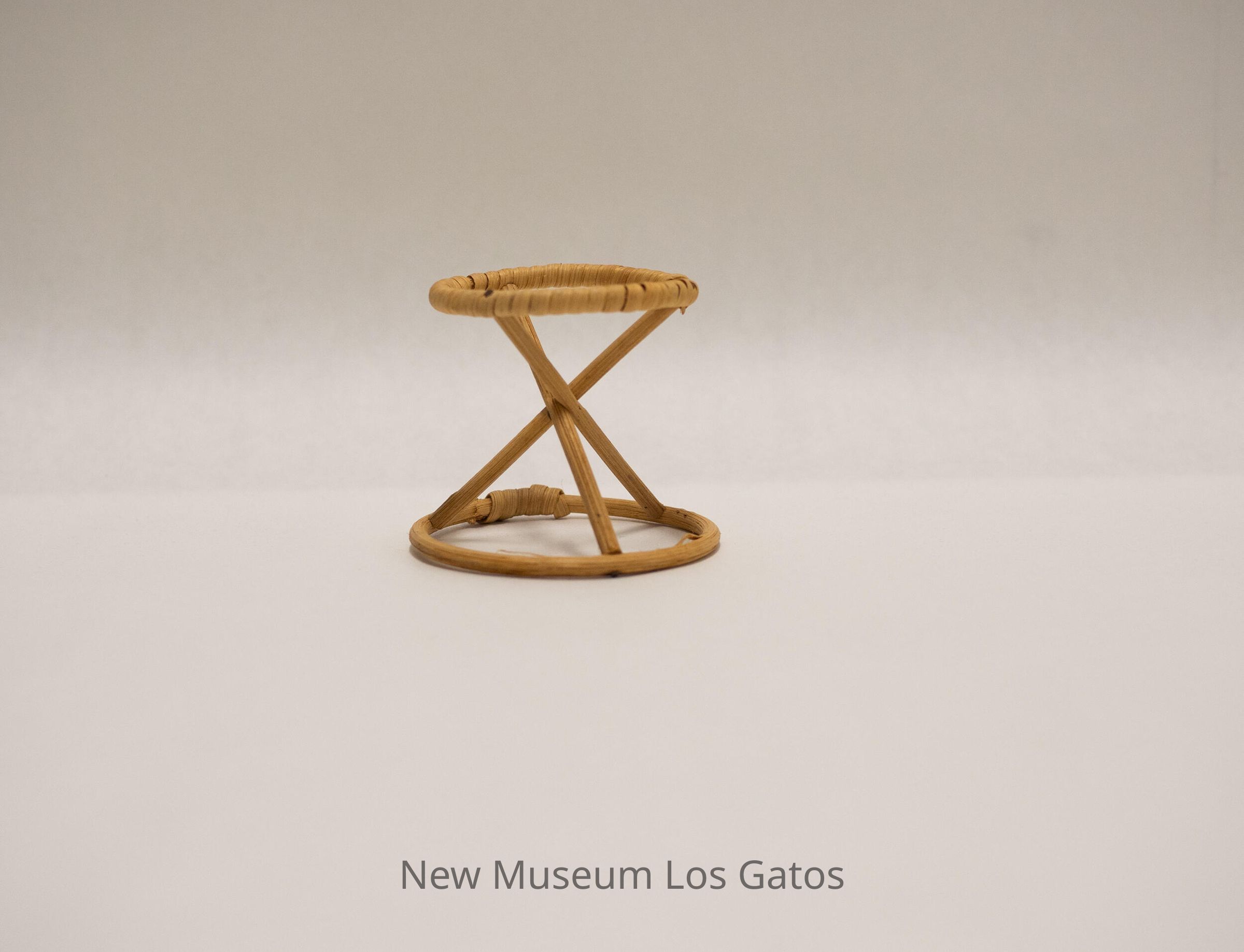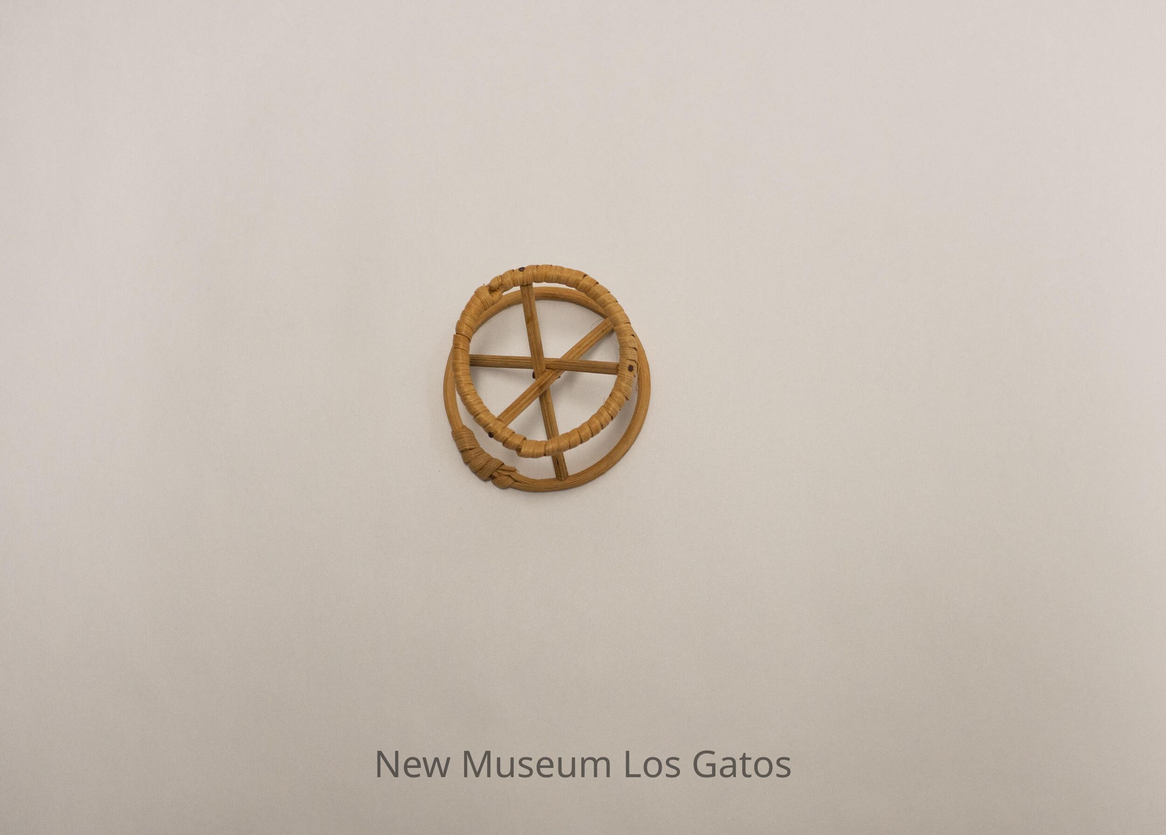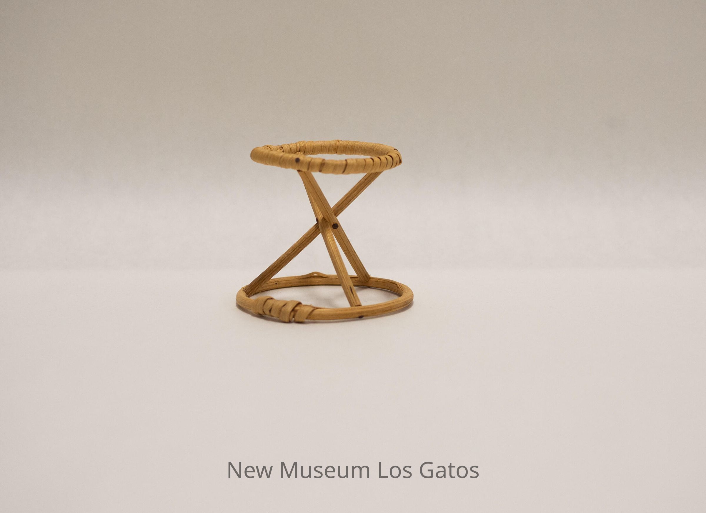 Small wooden stand in an hourglass shape, with a small circle attached to a larger circle, connected by three criss-crossing sticks.Collection