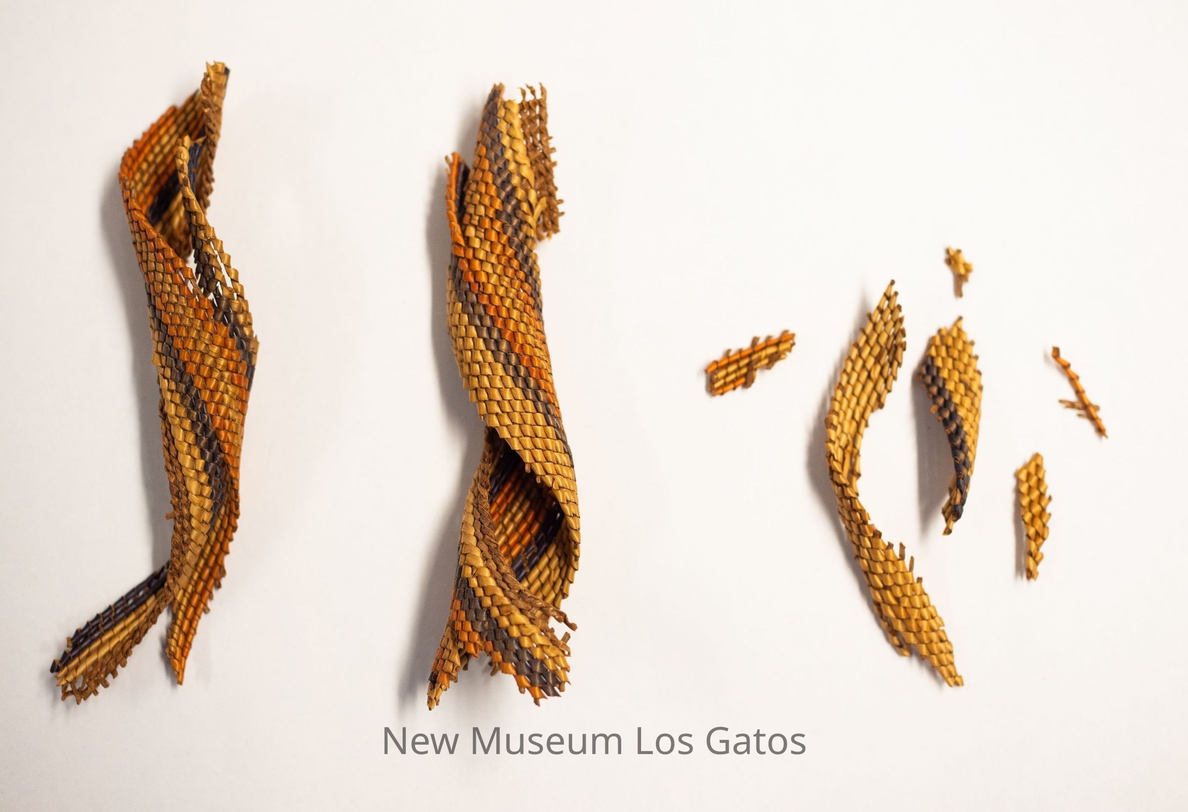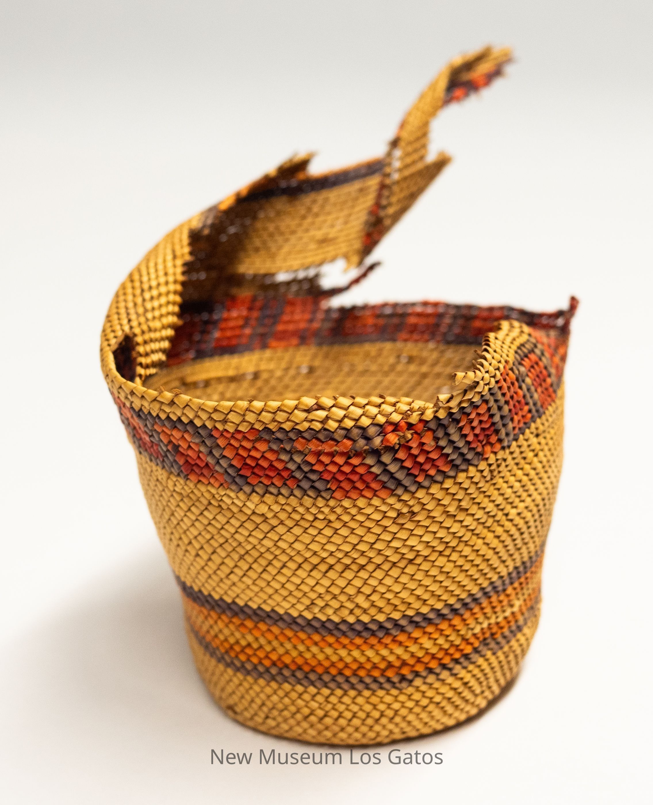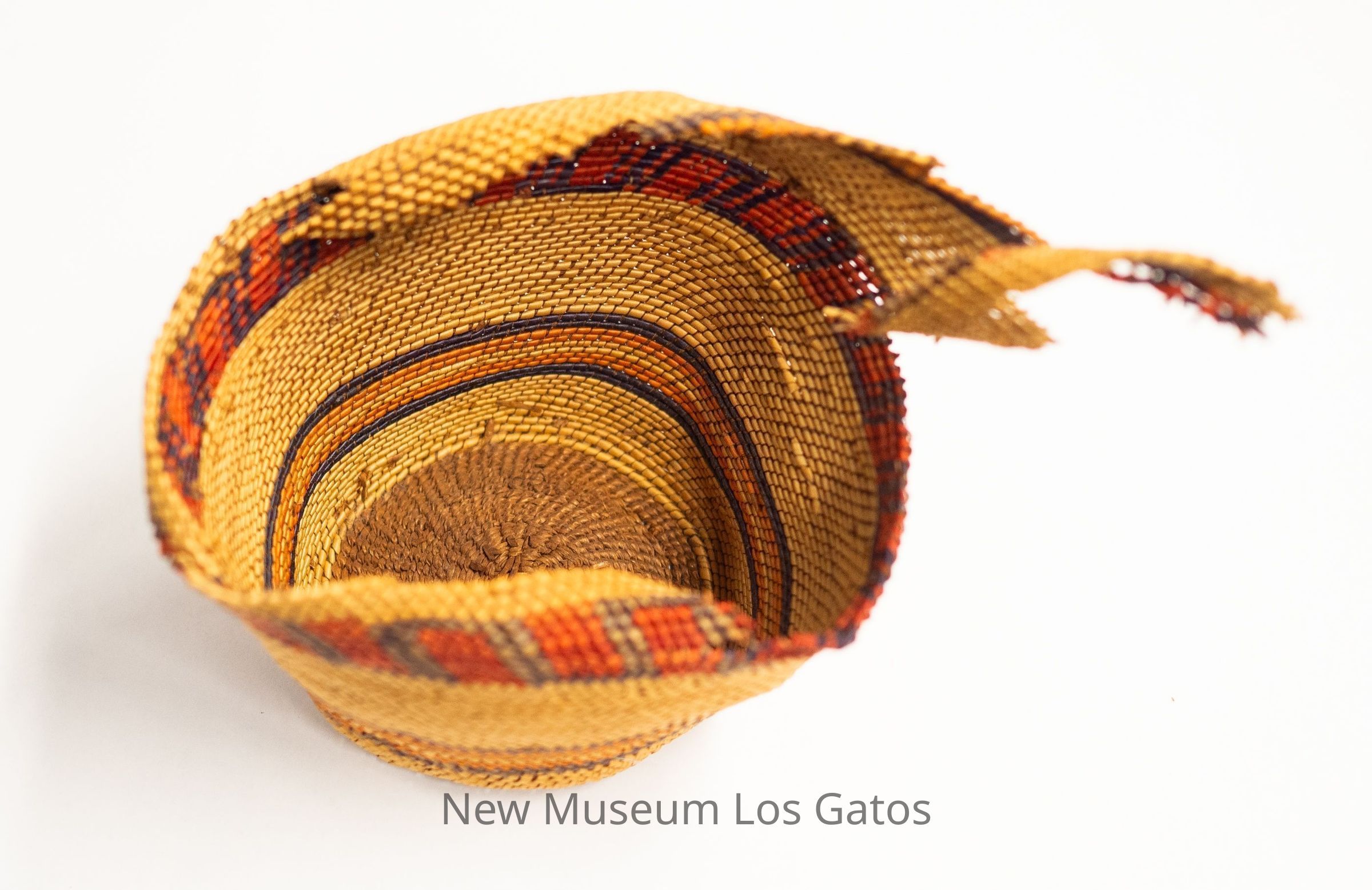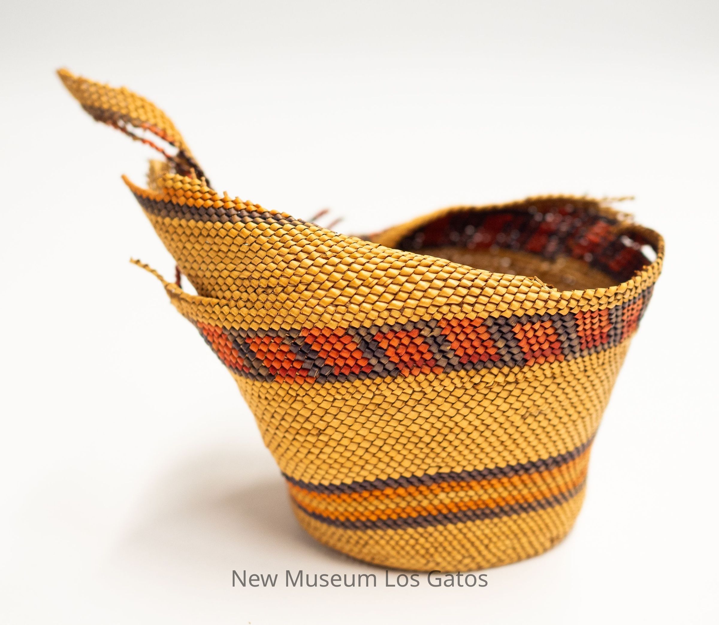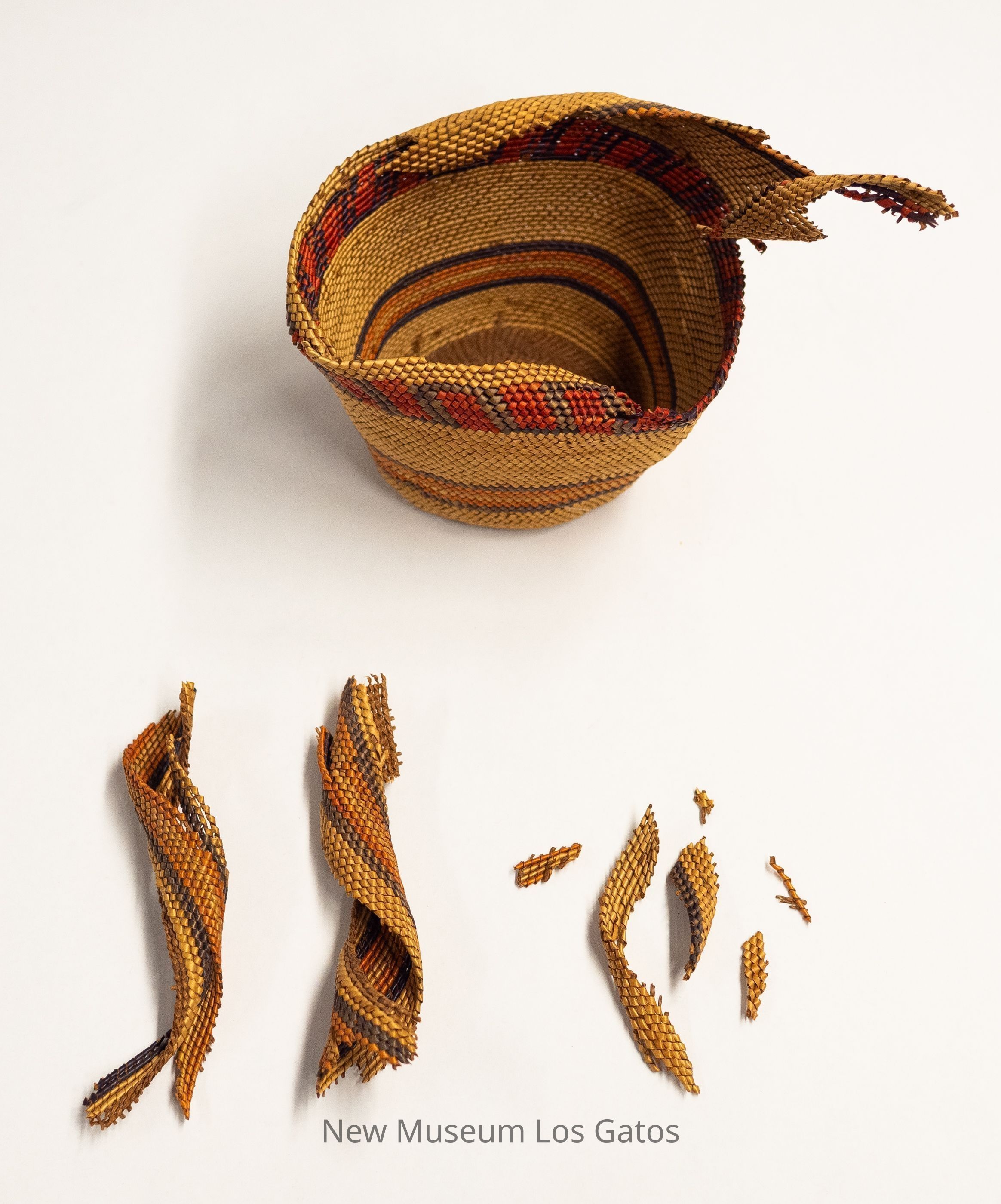 A small woven basket, in pieces. The basket is primarily yellow with alternating bands of color, including red with purple, and orange.Collection