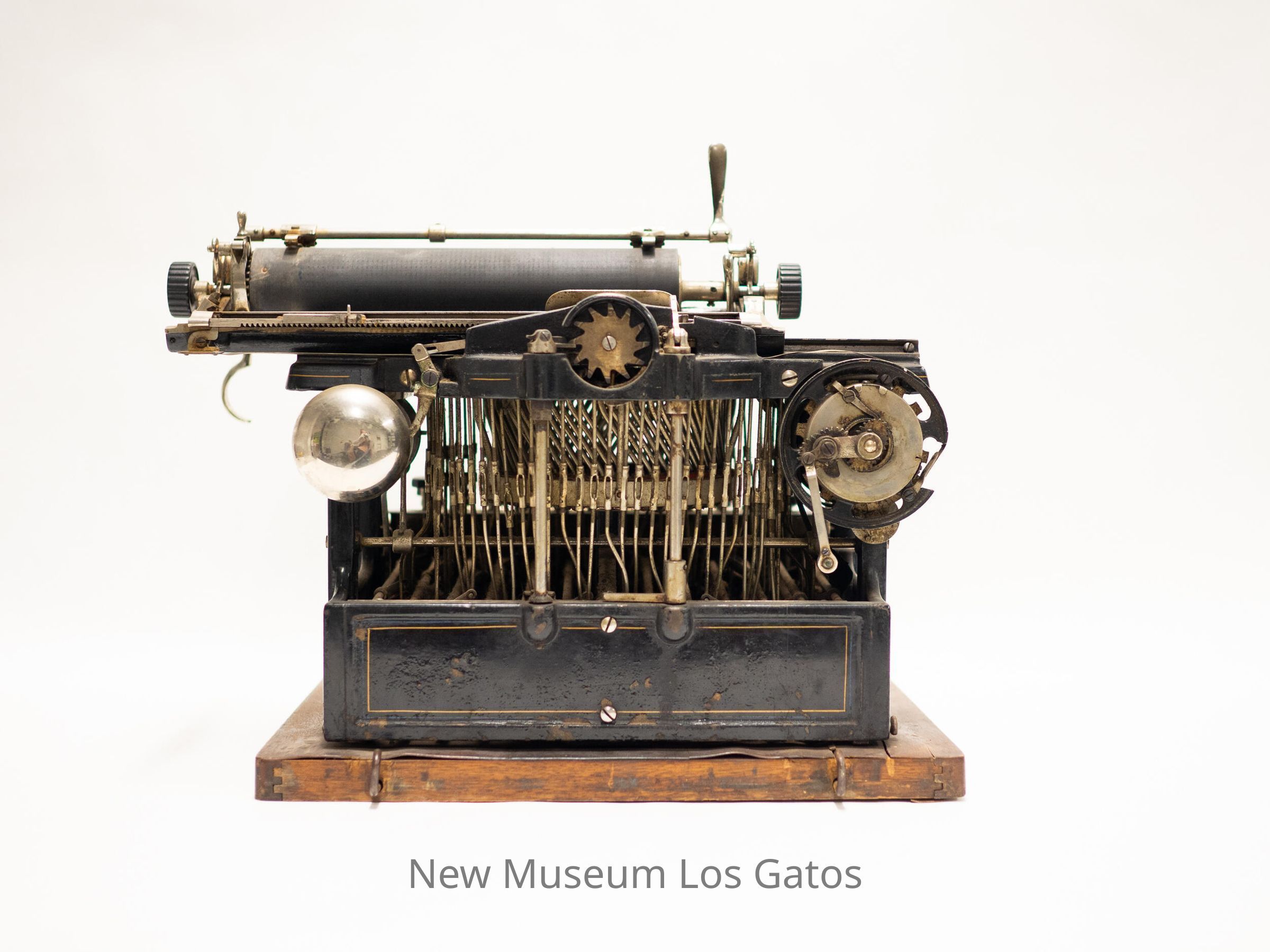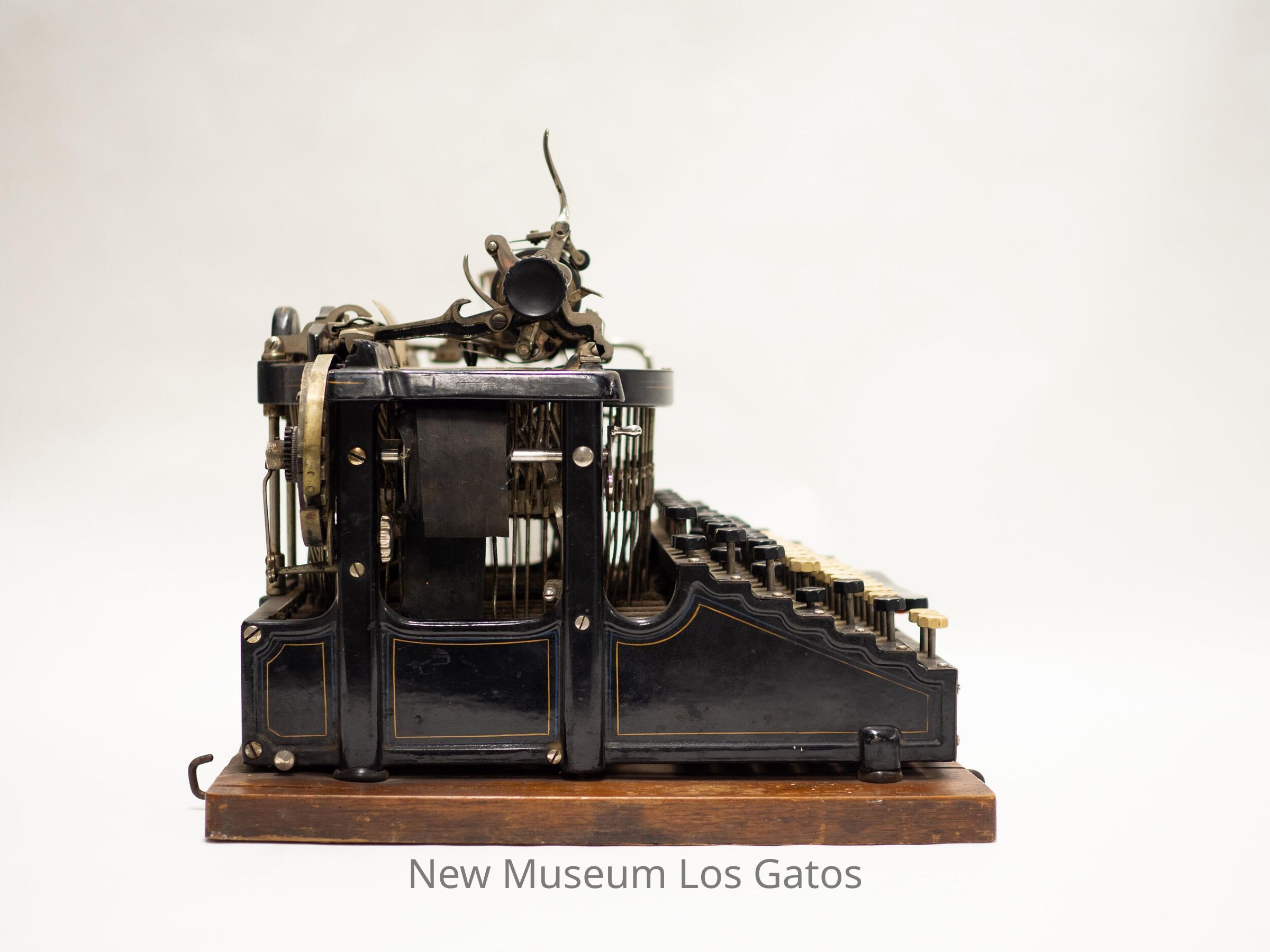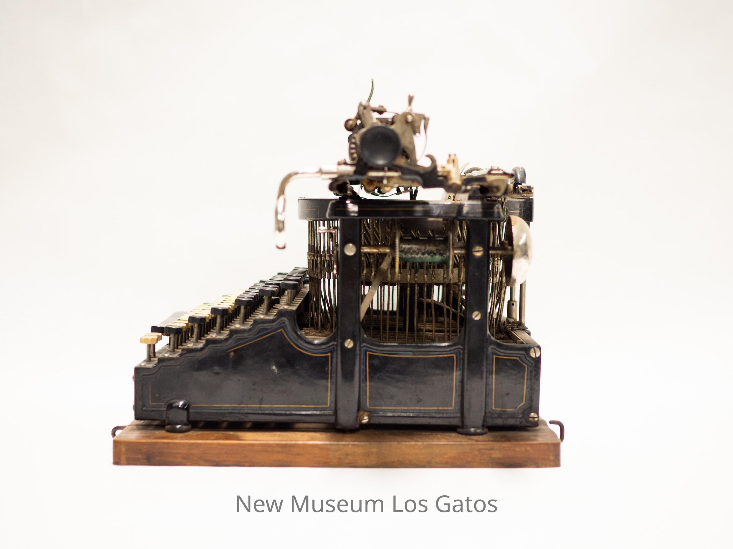 A Smith Premier No. 2 Typewriter mounted on a wooden board. Typewriter appears to be completely intact, with white keys for lowercase letters, and black keys for uppercase letters.Collection