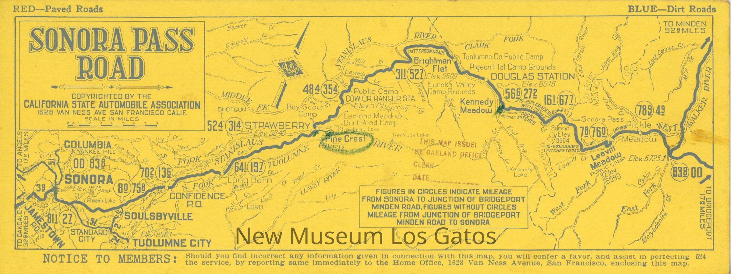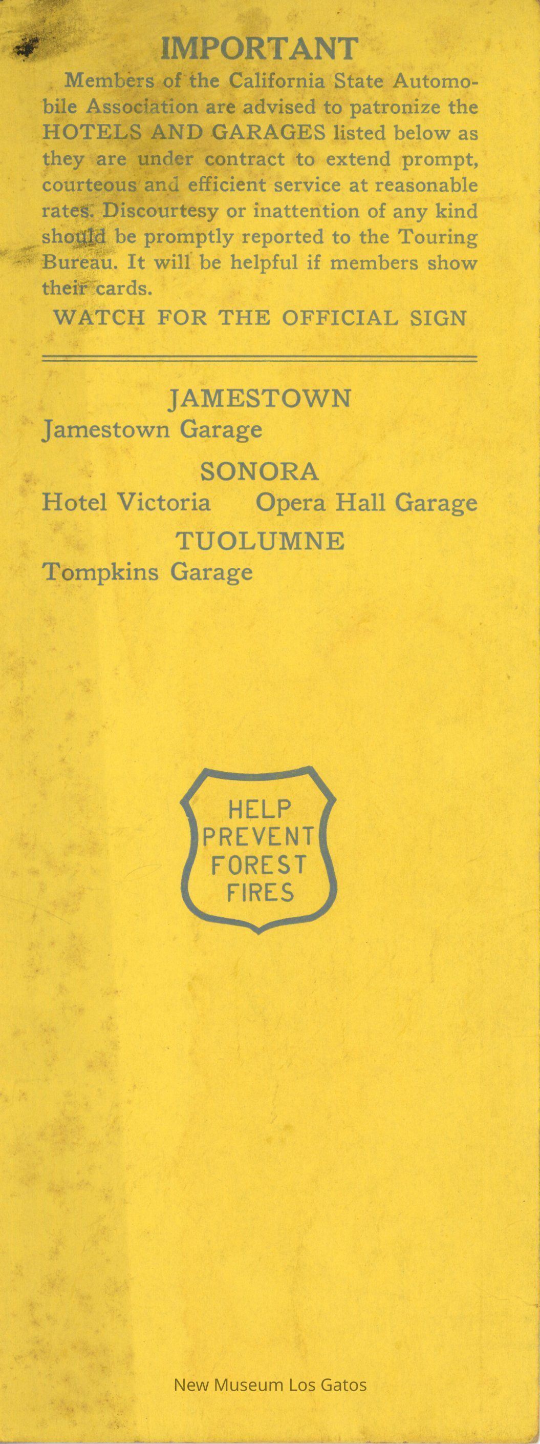 A small, single-sheeted cardstock map, depicting the roads, both paved and unpaved, that go through the Sonora Pass area. There is also information about approved service stations and hotels in that area on the back.Collection