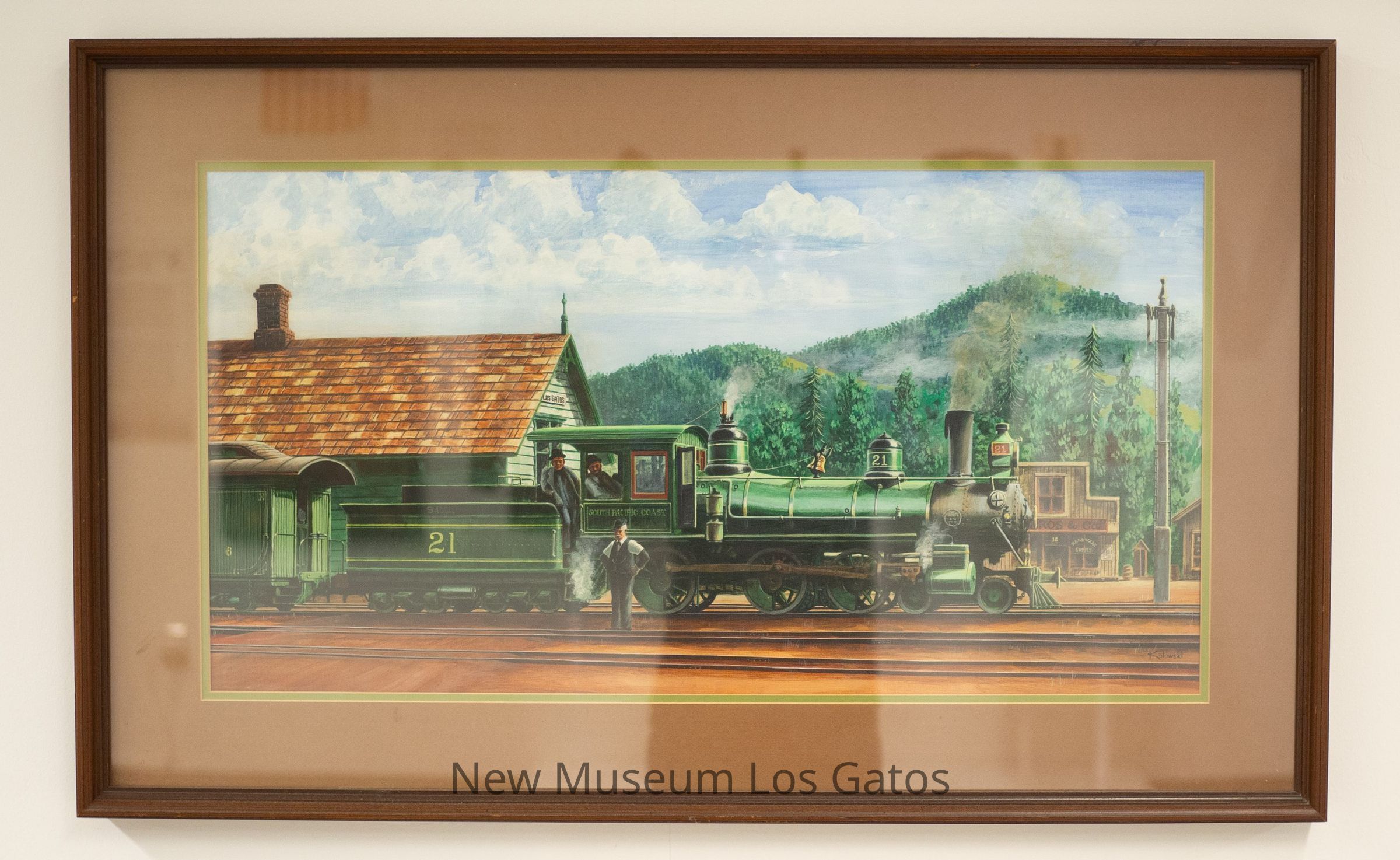 A painting, depicting the Los Gatos train station, with a train pulled in at the station. The Southern Pacific Railroad train features a green locomotive with a green train car. The green train station is behind the train, to the left. There are additional train tracks in the foreground, with stores and tree-covered hills in the background. Two men are inside of the locomotive, while one man is standing out side of the locomotive. The painting is matted and framed.Artwork Details