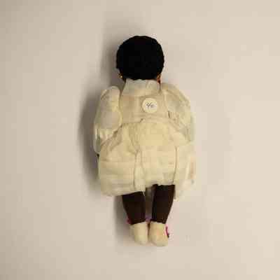 A fabric female doll. The doll is wearing a white organdy dress, with a magenta bow at her neck. She is also wearing white felt shoes, also with magenta bows. She has short black hair, and has two golden hoop earrings.Collection