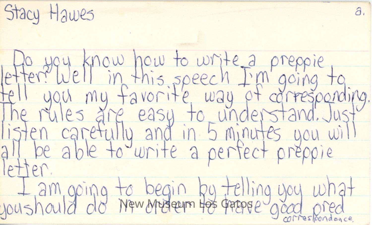 A single, lined index card with the first part of a speech on writing a preppie letter. The index card is marked 'a' in the upper right corner.