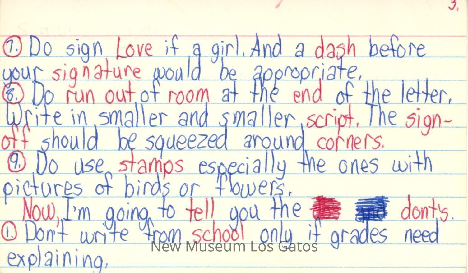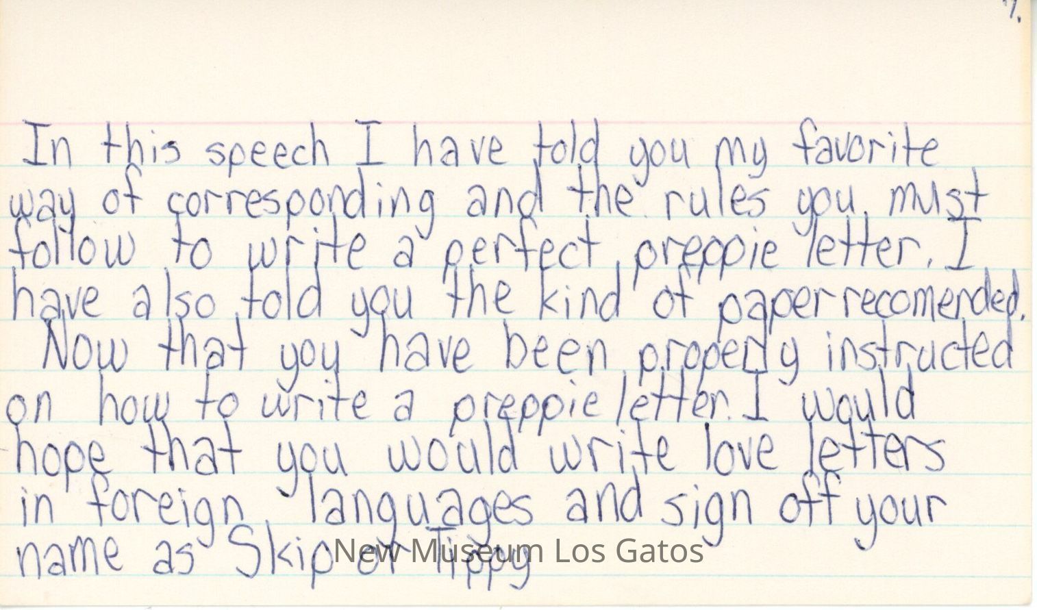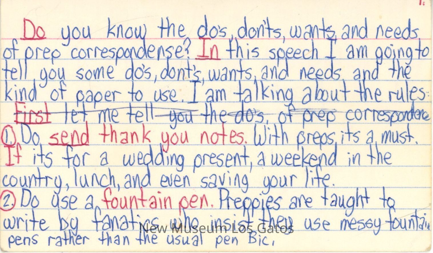 Seven lined index cards with what appears to be a speech or presentation script, written in blue and red ink. The last index card, despite being on the same topic, appears to be from another draft.Collection