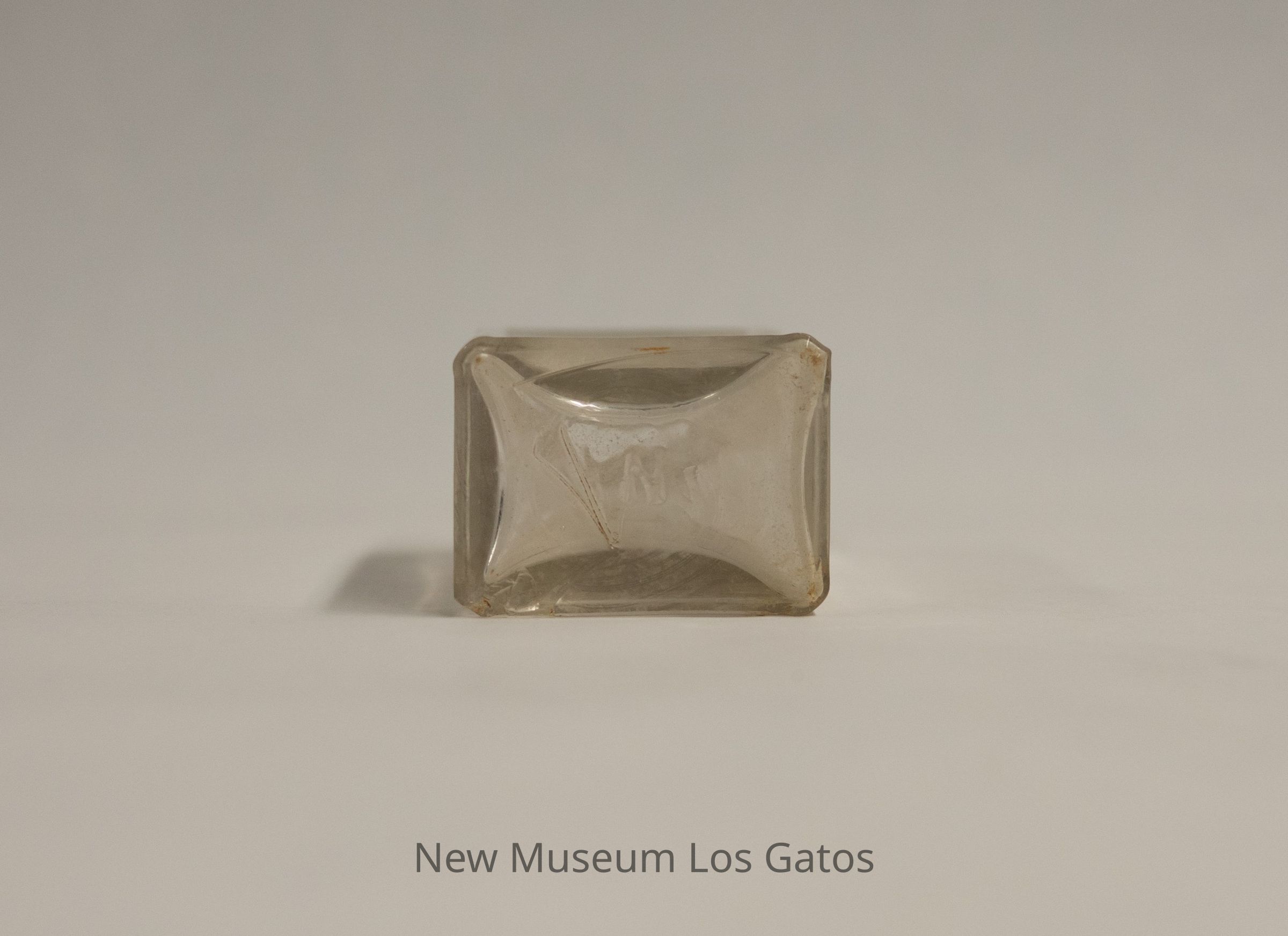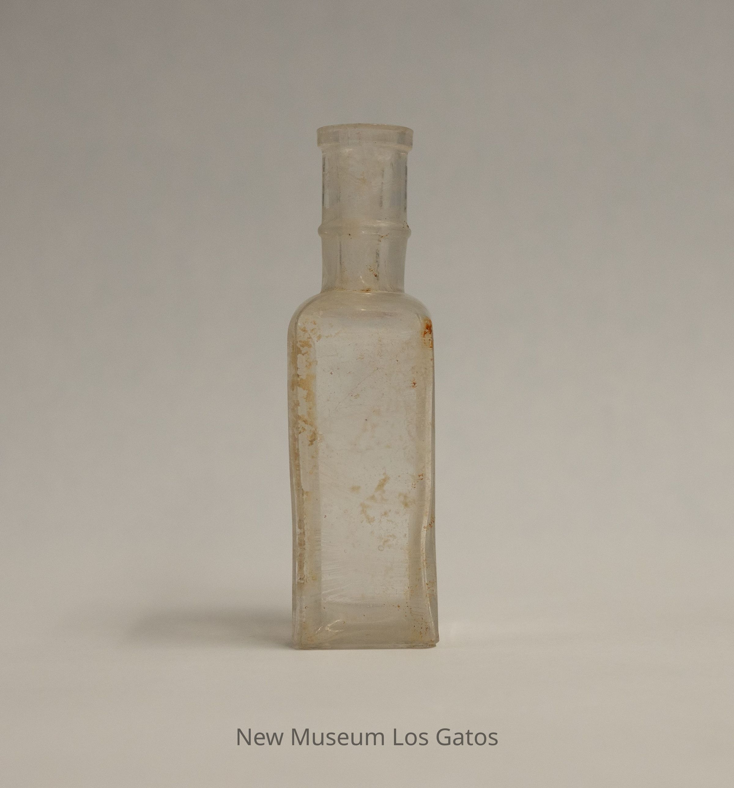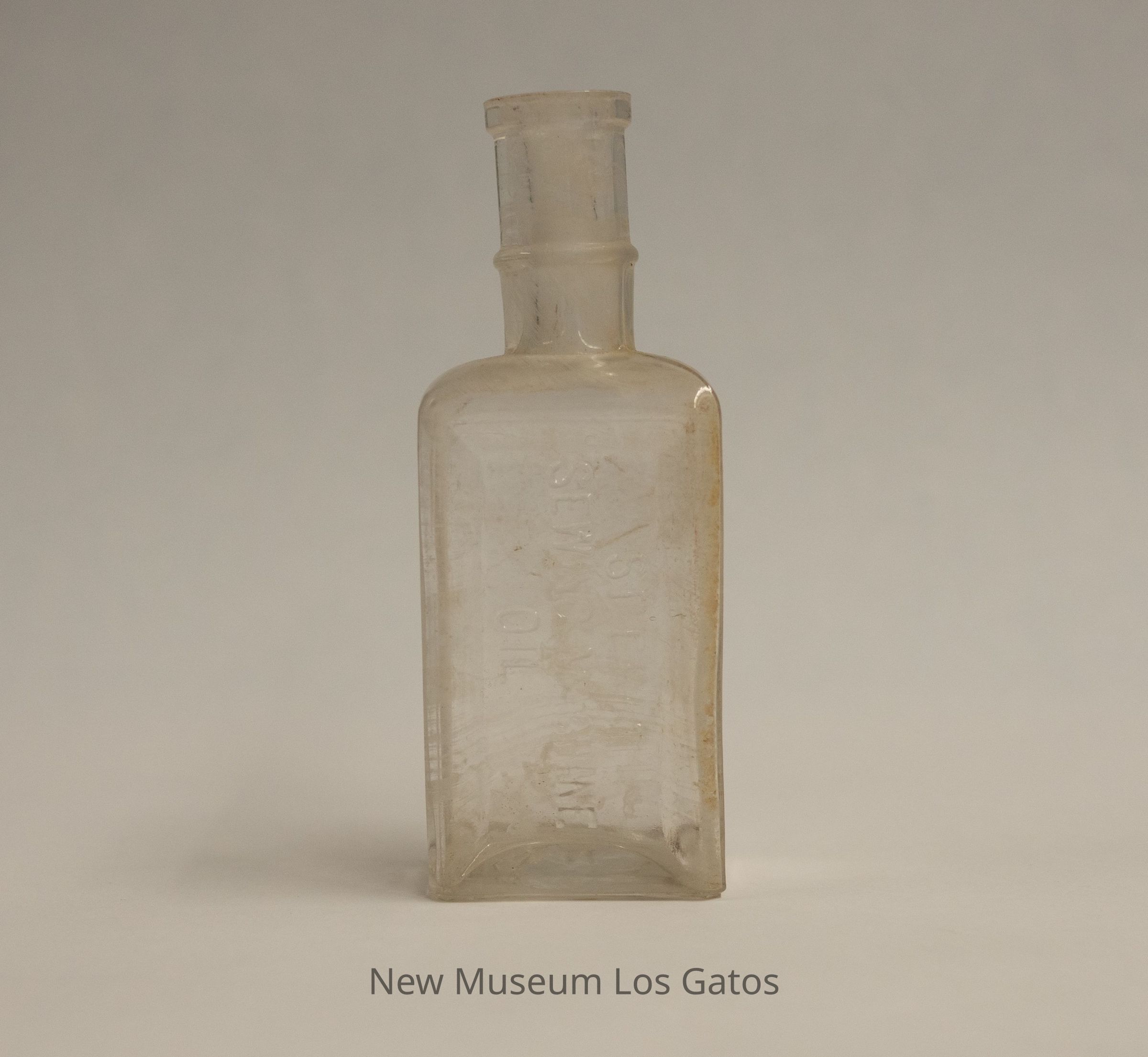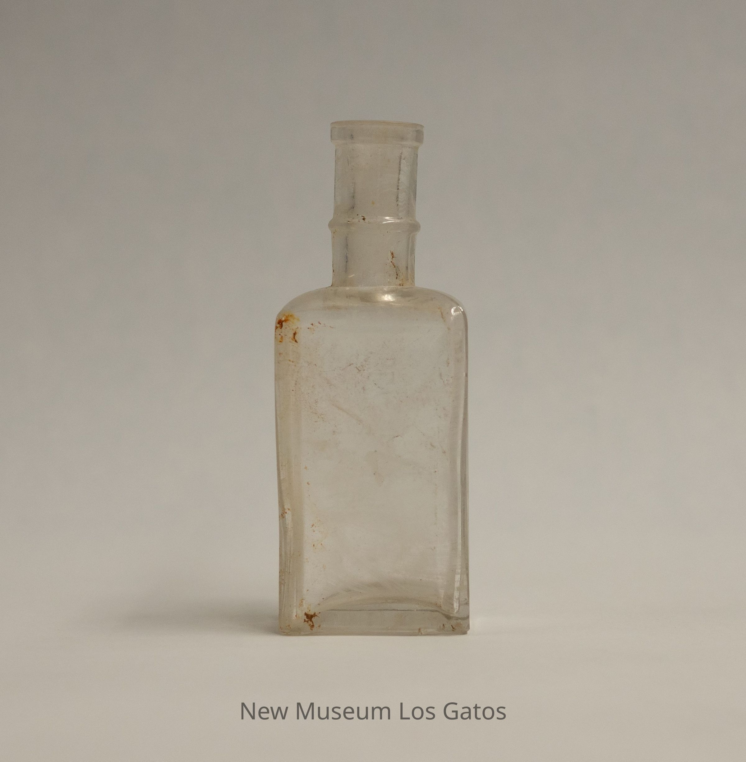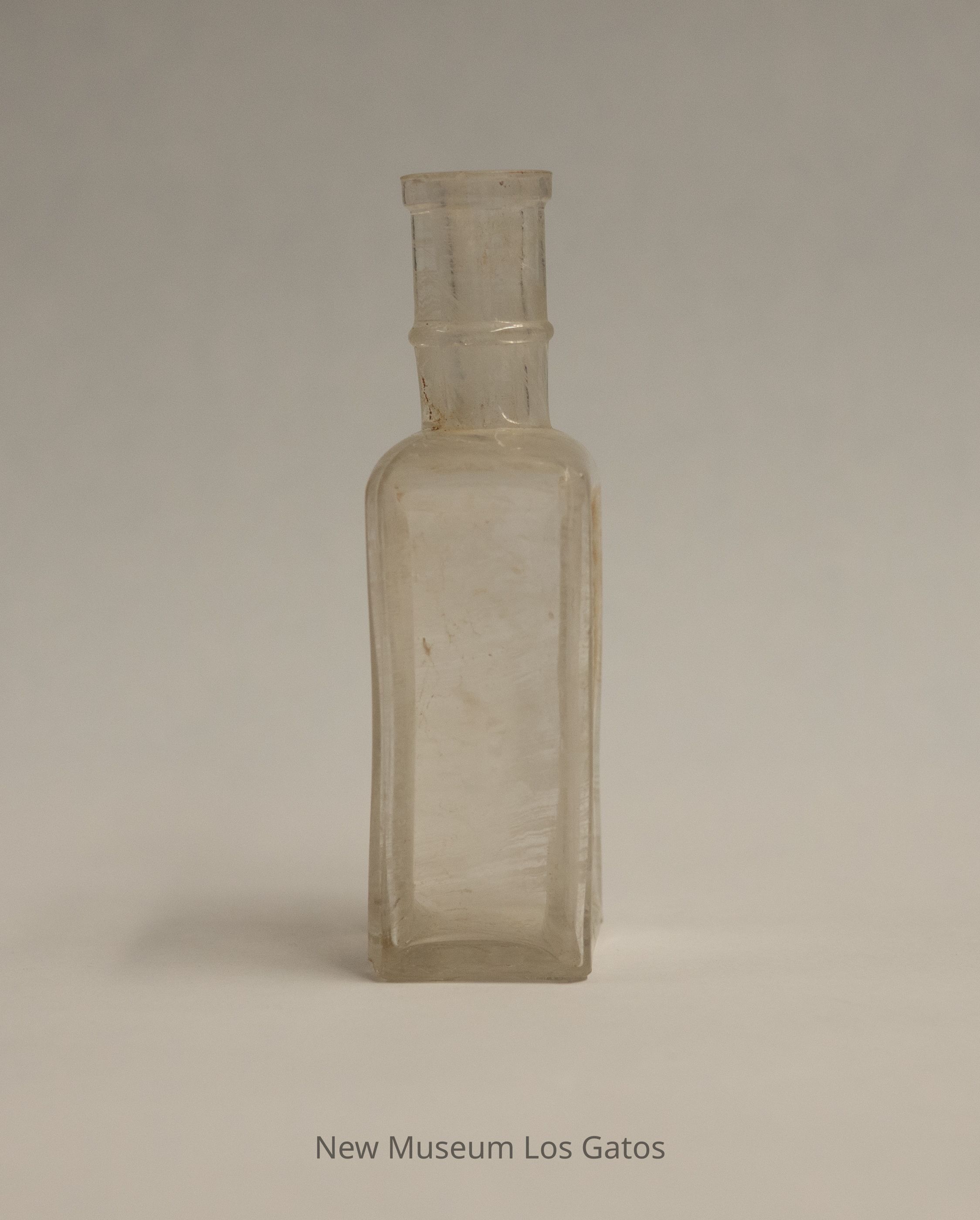 A clear, rectangular glass bottle. Identifying information is embossed on one of the wider sides. The neck is long, and has a raised band about halfway through.Collection
