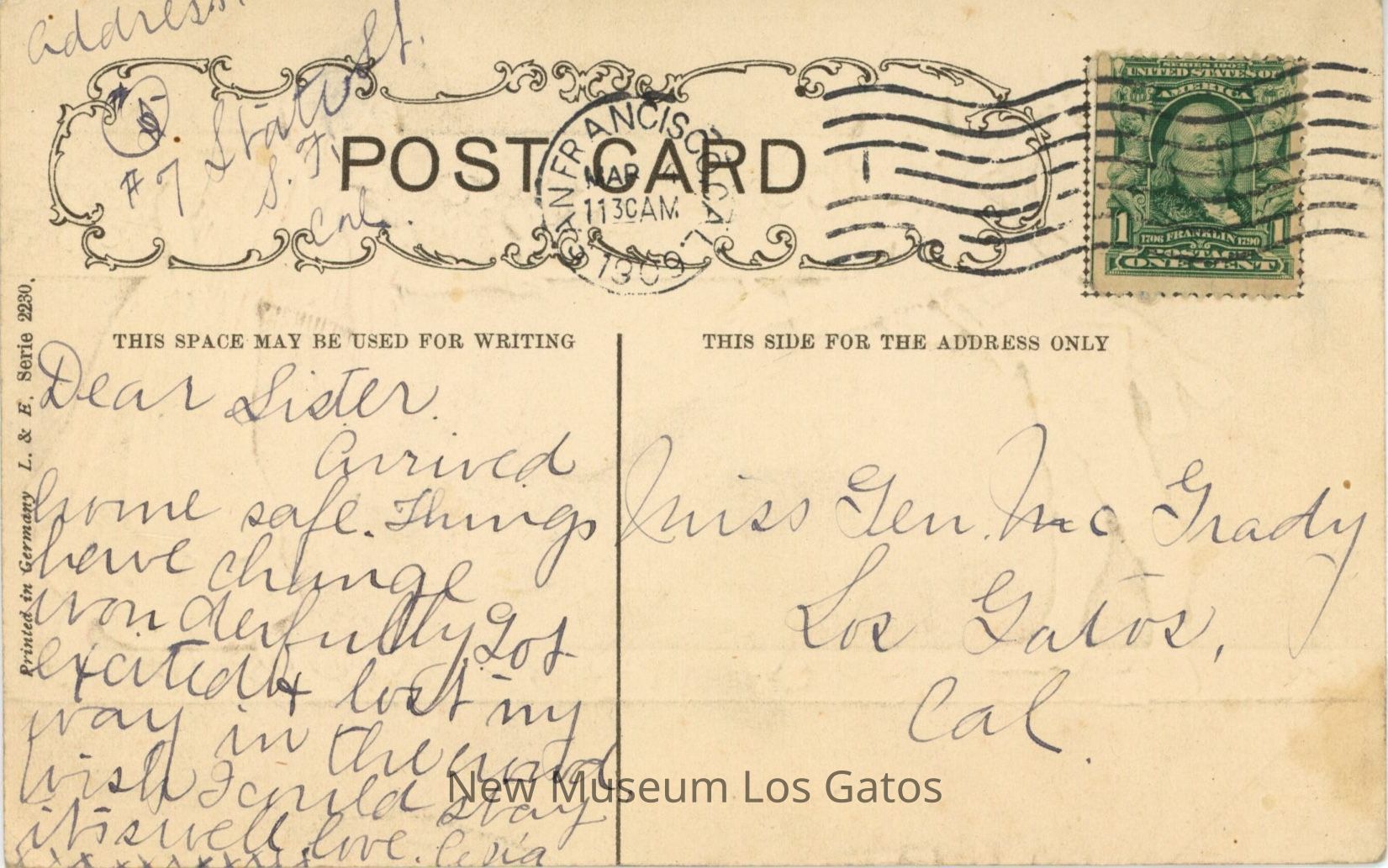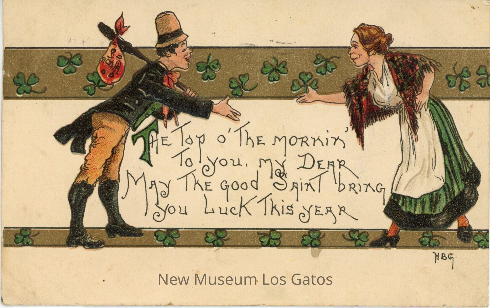 A postcard featuring an illustration of a man and a woman standing on either side of a short inscription, with their hands outstretched towards each other. There are two bands of gold with green clovers behind the people.Subject