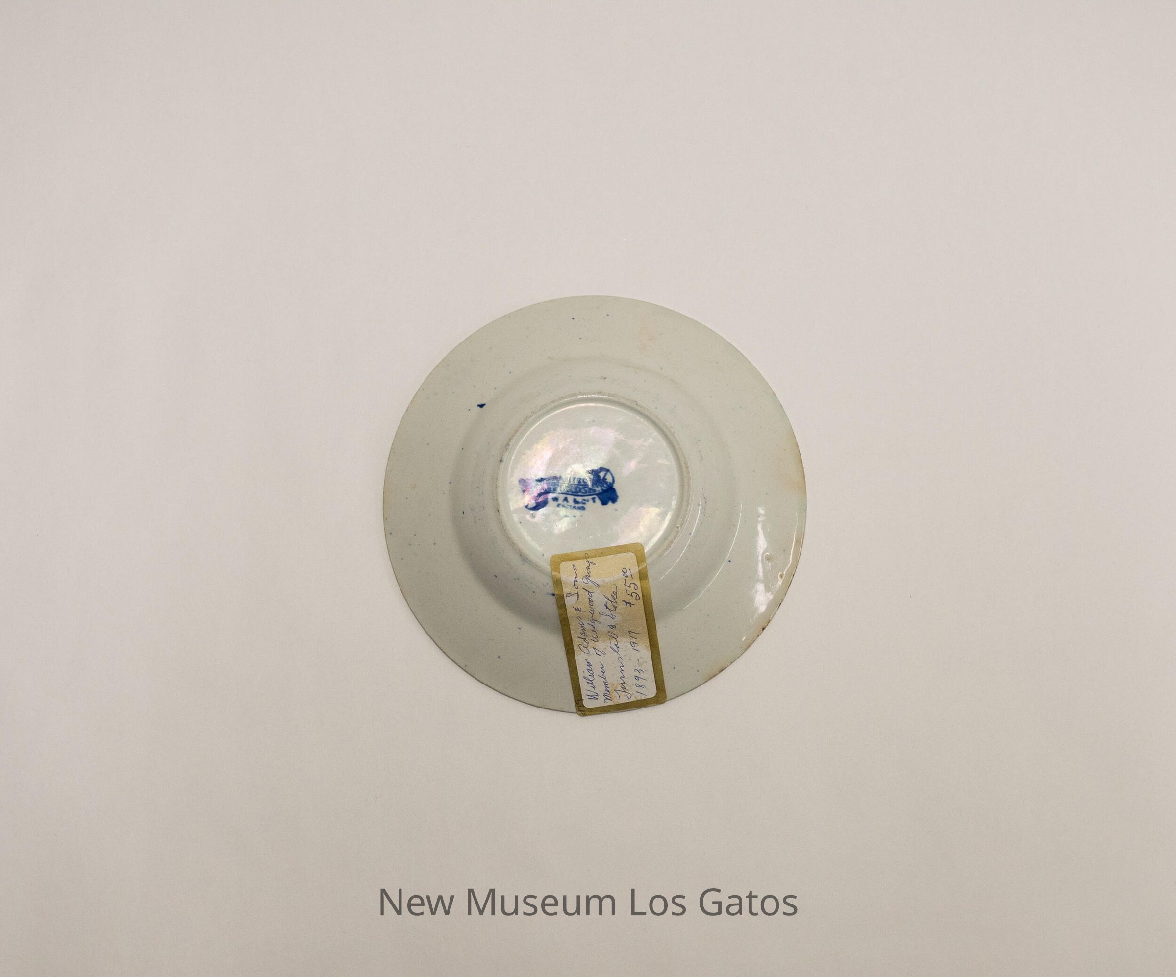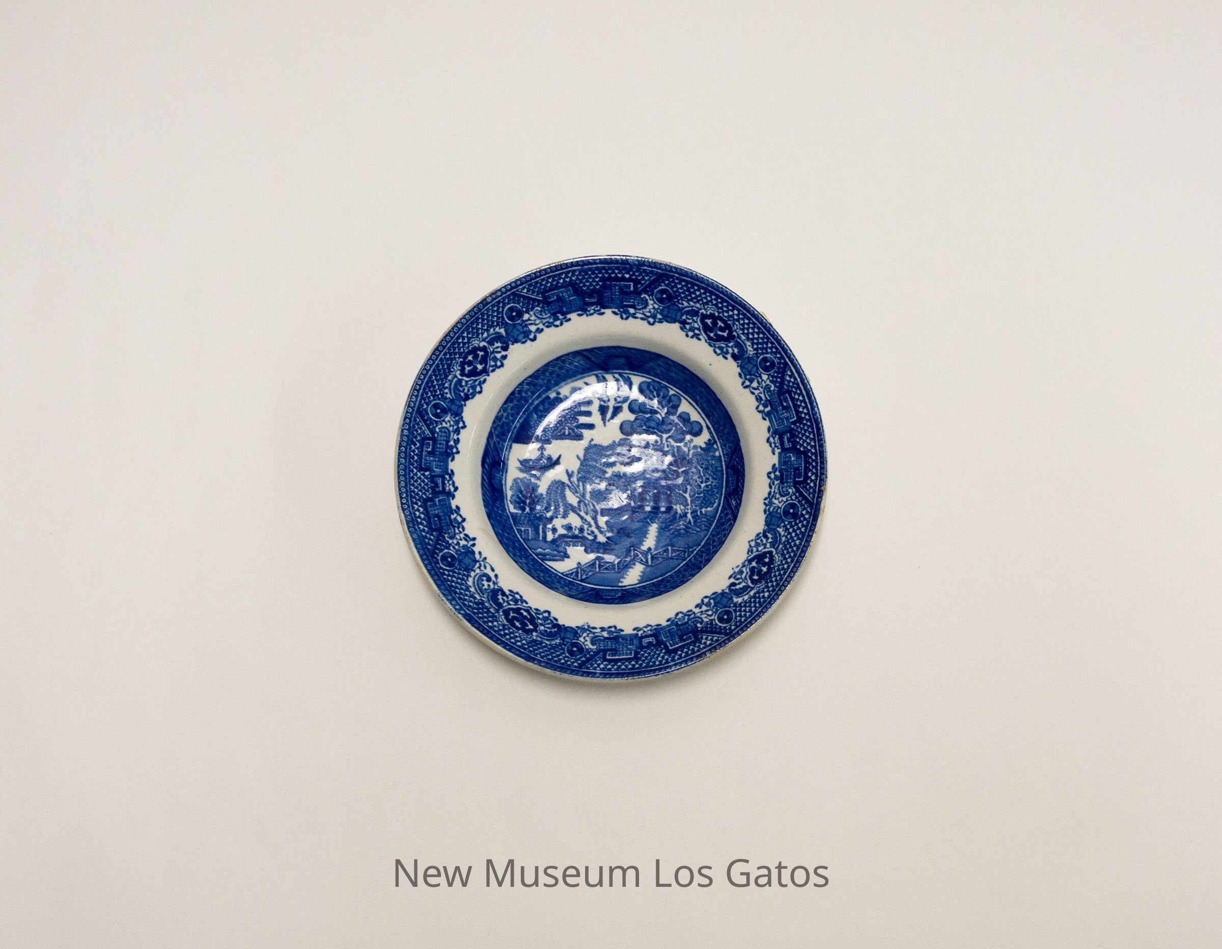 A white ceramic dish with blue patterning and decorations. Around the edge of the bowl, there is a geometric and flower pattern creating a border. On the inside of the bowl, there is a scene with multiple structures, people walking over a bridge, a fence, and a person sailing a boat down a river.Collection