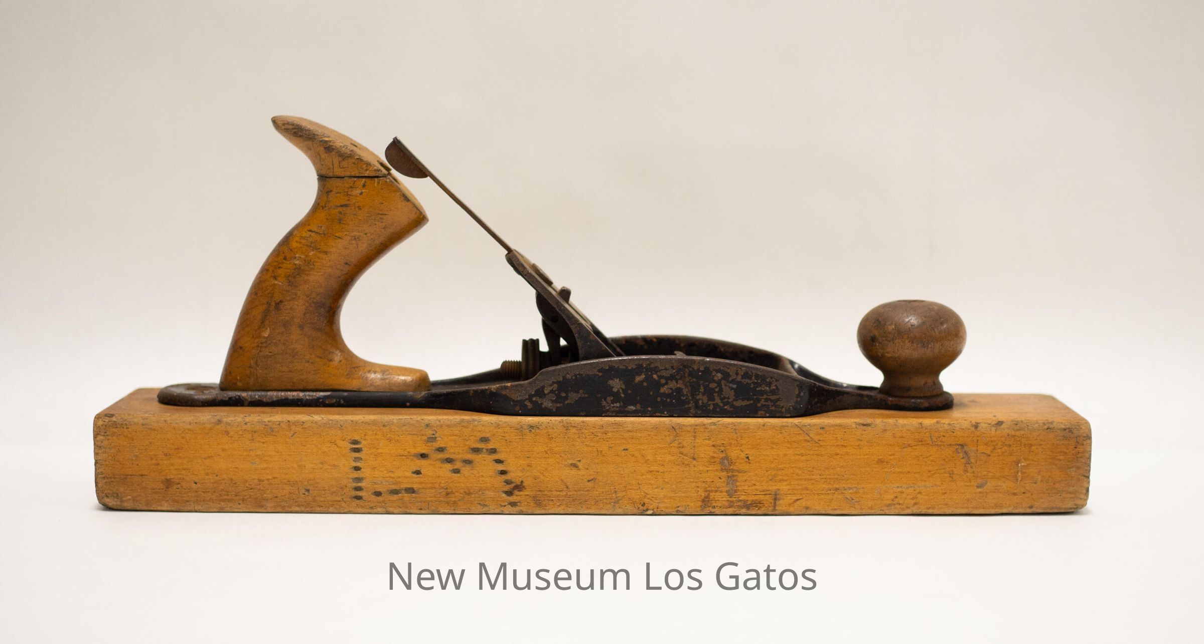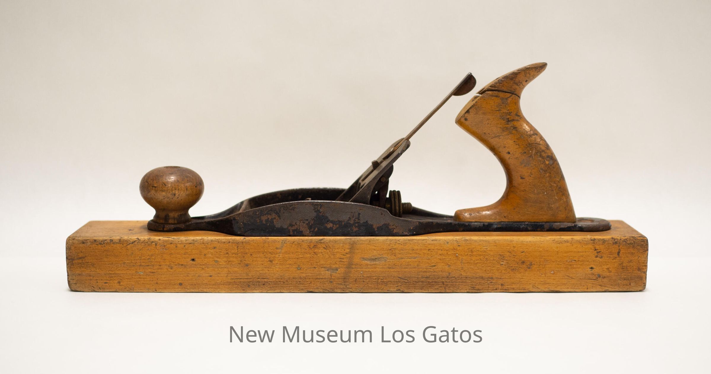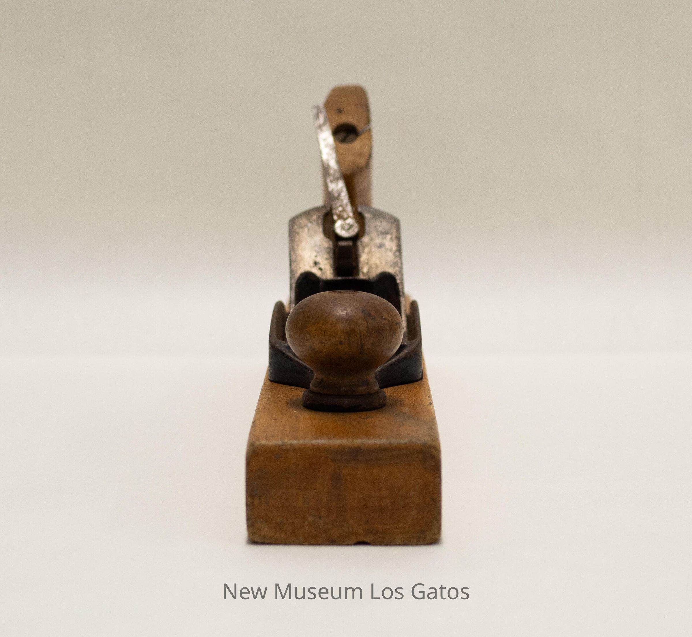 A long, antique transitional plane, with a thin, wooden rectangular base. There is metal on top of the base, with a metal blade and metal chip breaker angled into an opening in the center. There is a wooden knob towards the front of the plane, and a wooden handle towards the back of the plane.Collection