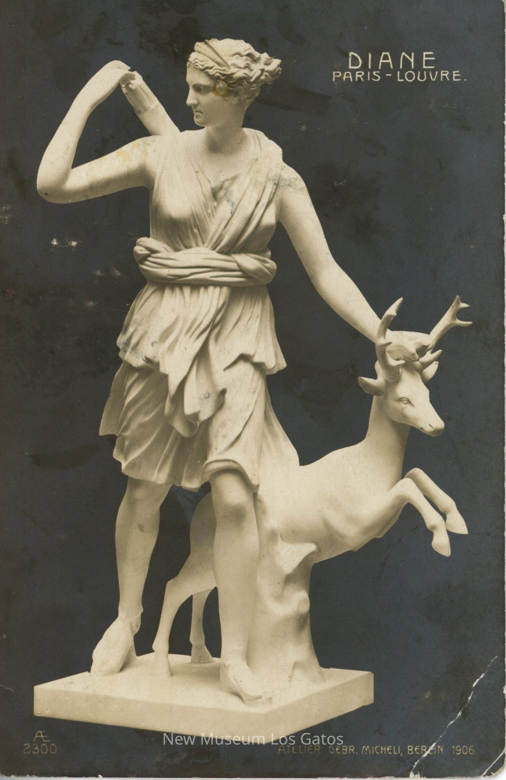 A postcard featuring a photograph of the Diane sculpture in the Louvre Museum in Paris. The background of the postcard is black.Subject Place