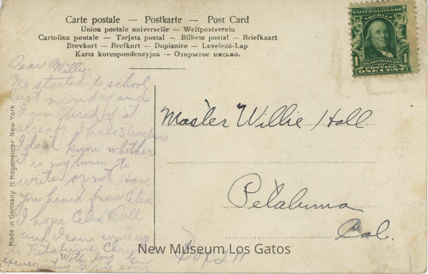 We started to school last Monday and I am tired of it already. I have 3 teachers I don't know whether it is my turn to write or not. Have you heard from Celia I hope Celia Doll and I can come up to Petaluma Christmas