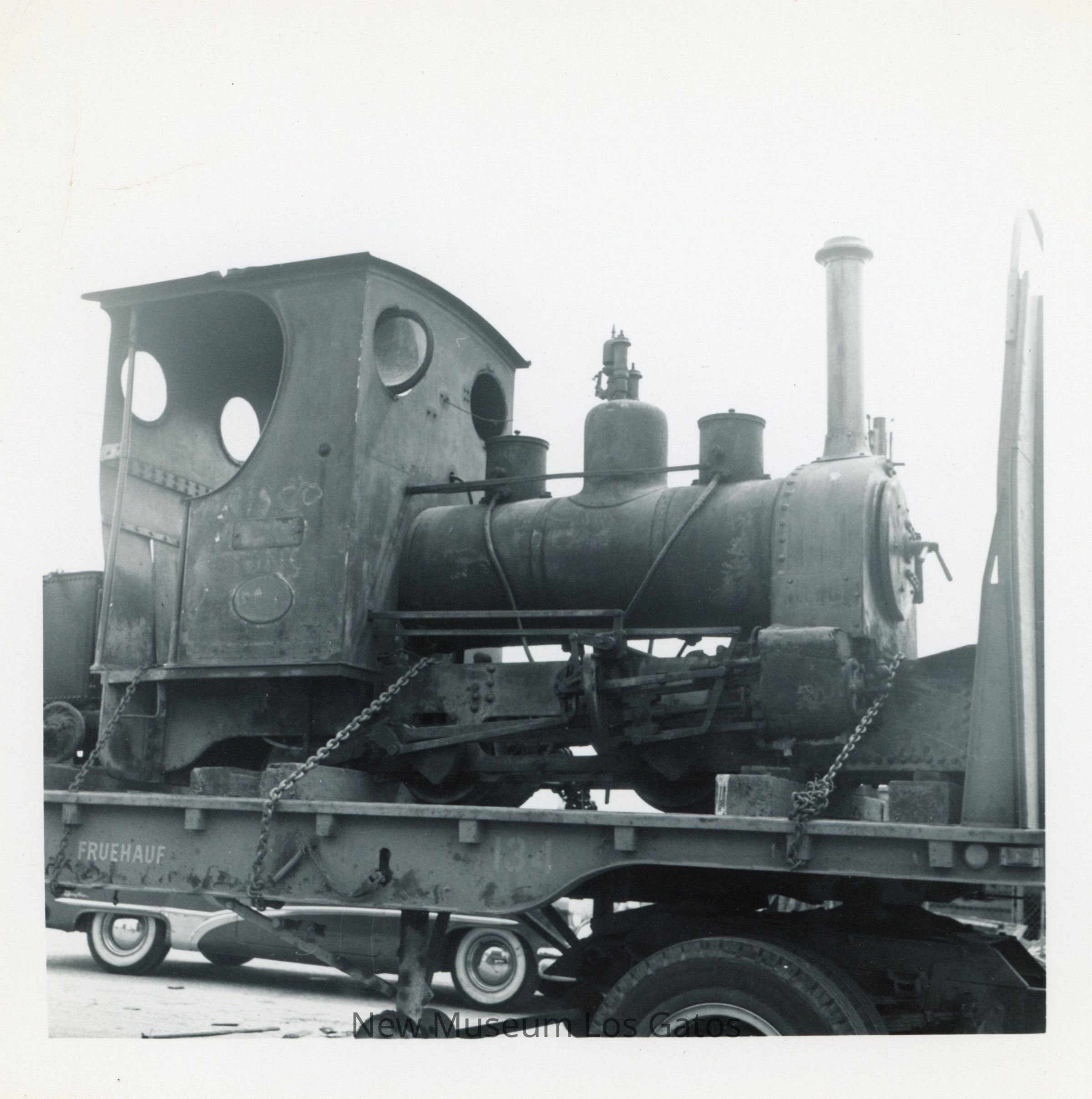 A black and white photograph featuring a close-up shot of a steam engine. The engine is strapped onto the flatbed of a truck with chains. The image is surrounded by a white border.