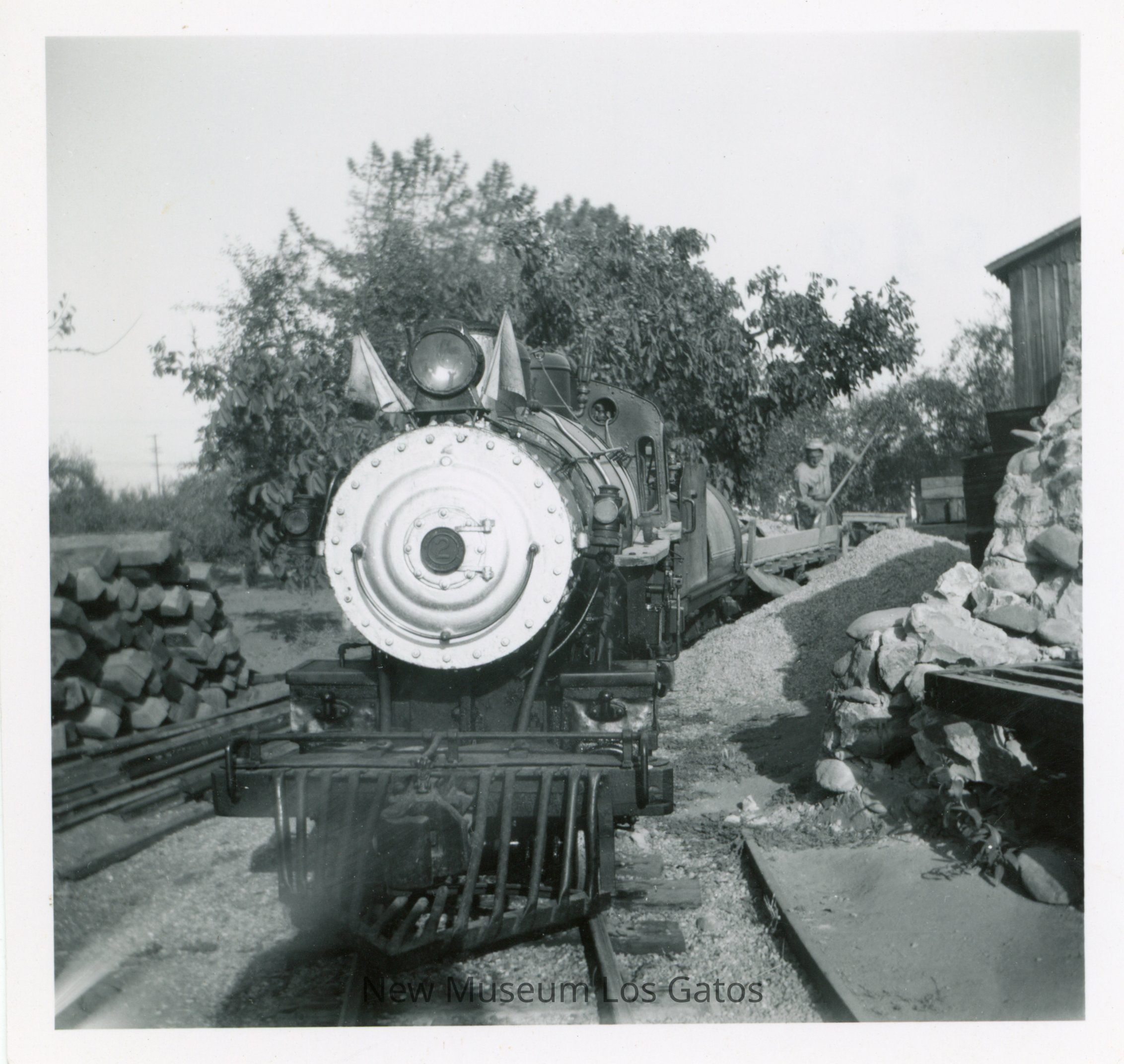 A black and white photograph featuring a steam engine. The engine is in the center of the image, with a building and rubble off to its right, and a stack of wood off to its left. There is a man shoveling gravel behind the engine. The image is surrounded by a white border.