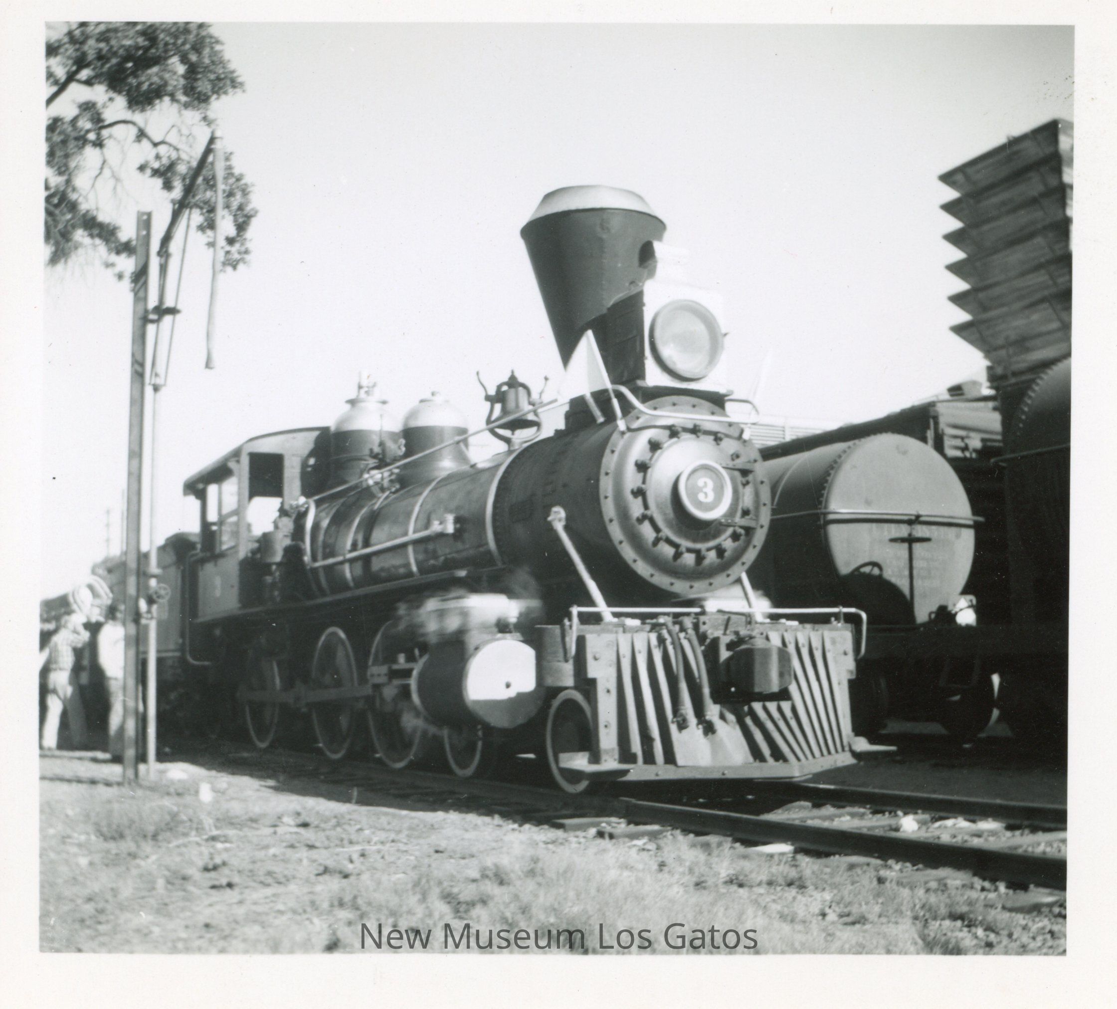 A black and white photograph featuring a steam engine with the number "3" on its front. The steam engine is in the center of the image, with other types of train cars off to its right side. The image is surrounded by a white border.