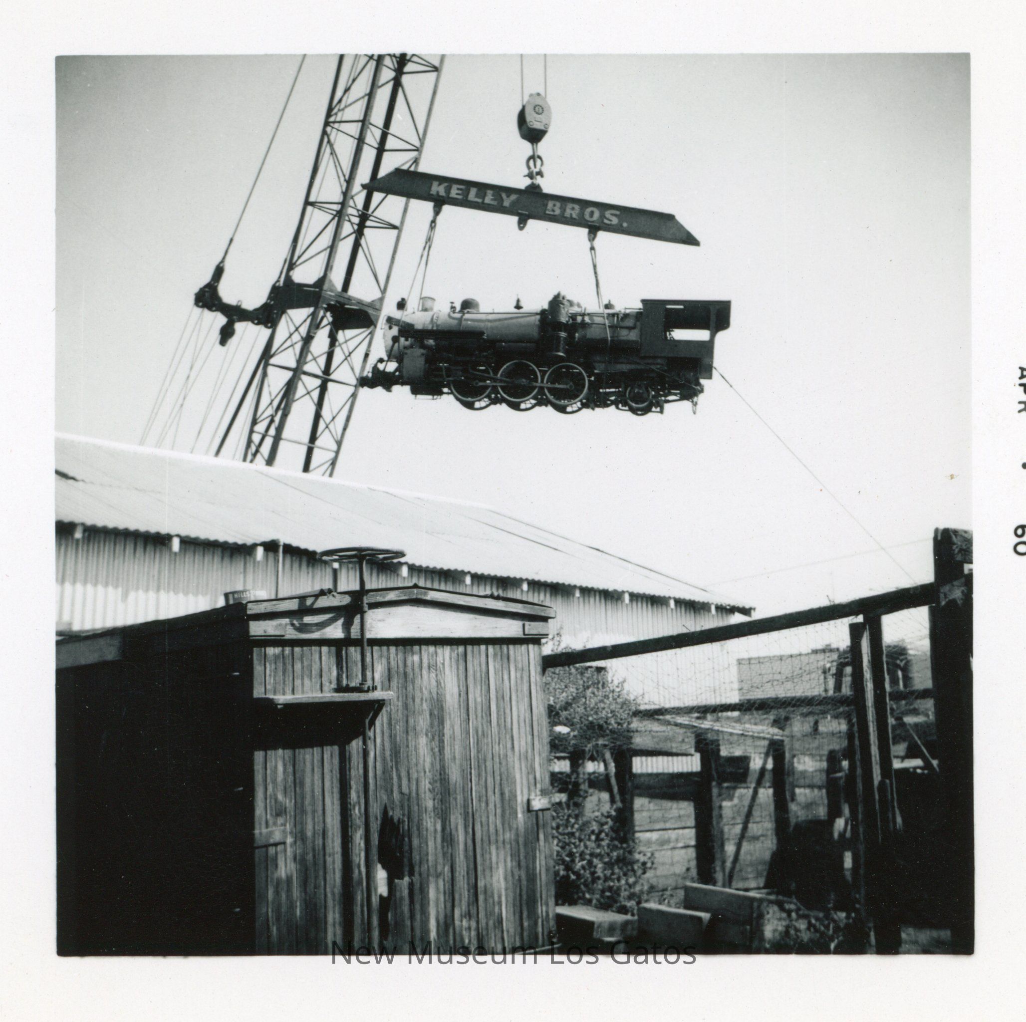 A black and white photograph featuring a steam engine being suspended in the air by a crane. The crane, which bears the words "Kelly Bros.," is holding the dark-colored steam engine above a large metal building in the background and a smaller wooden building in the foreground. The image is surrounded by a white border.Collection