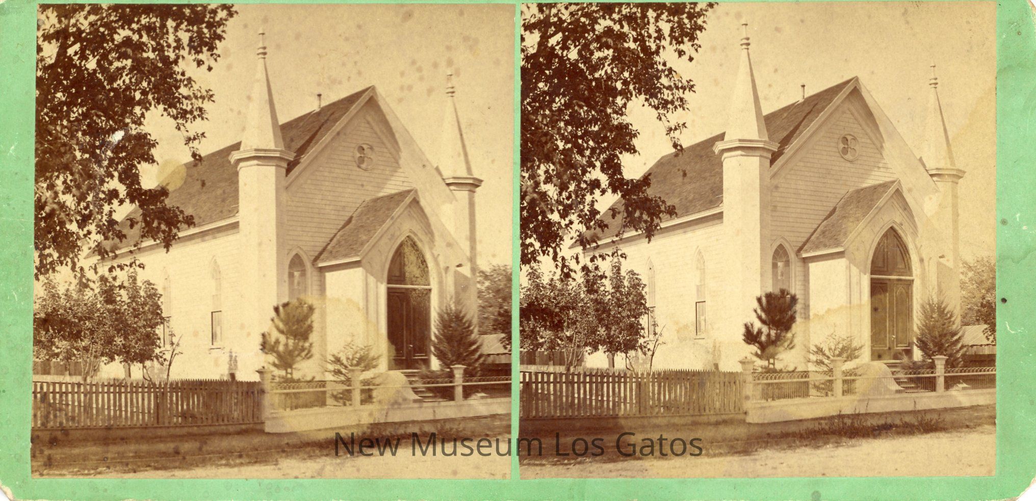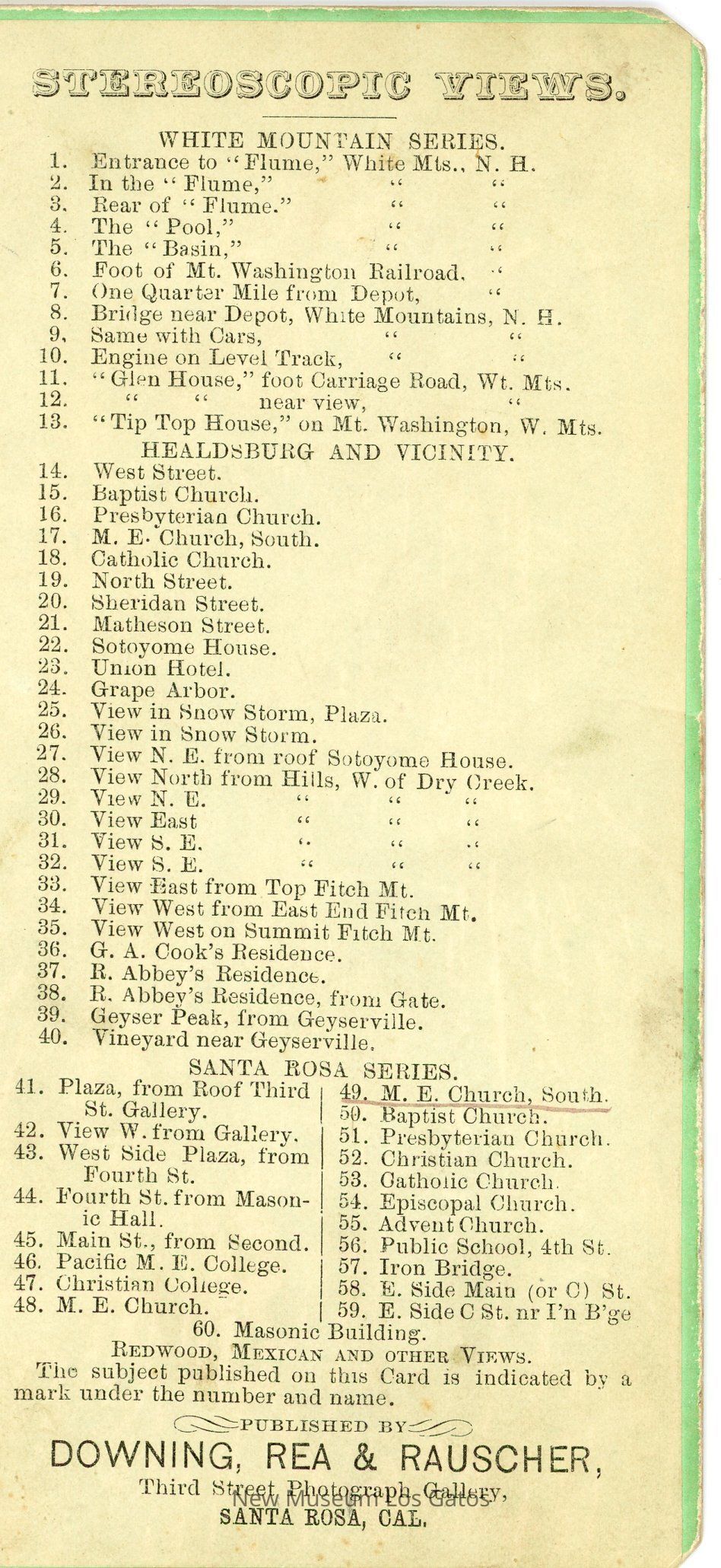 Two identical black and white photographs of a church, right next to each other on a green cardboard background. On the back side is a list of other available stereoscopic views from the publisher, on a light green background. Based on the underlined option on the list, the image is most likely of the M.E. Church, South from the Santa Rosa Series.Collection