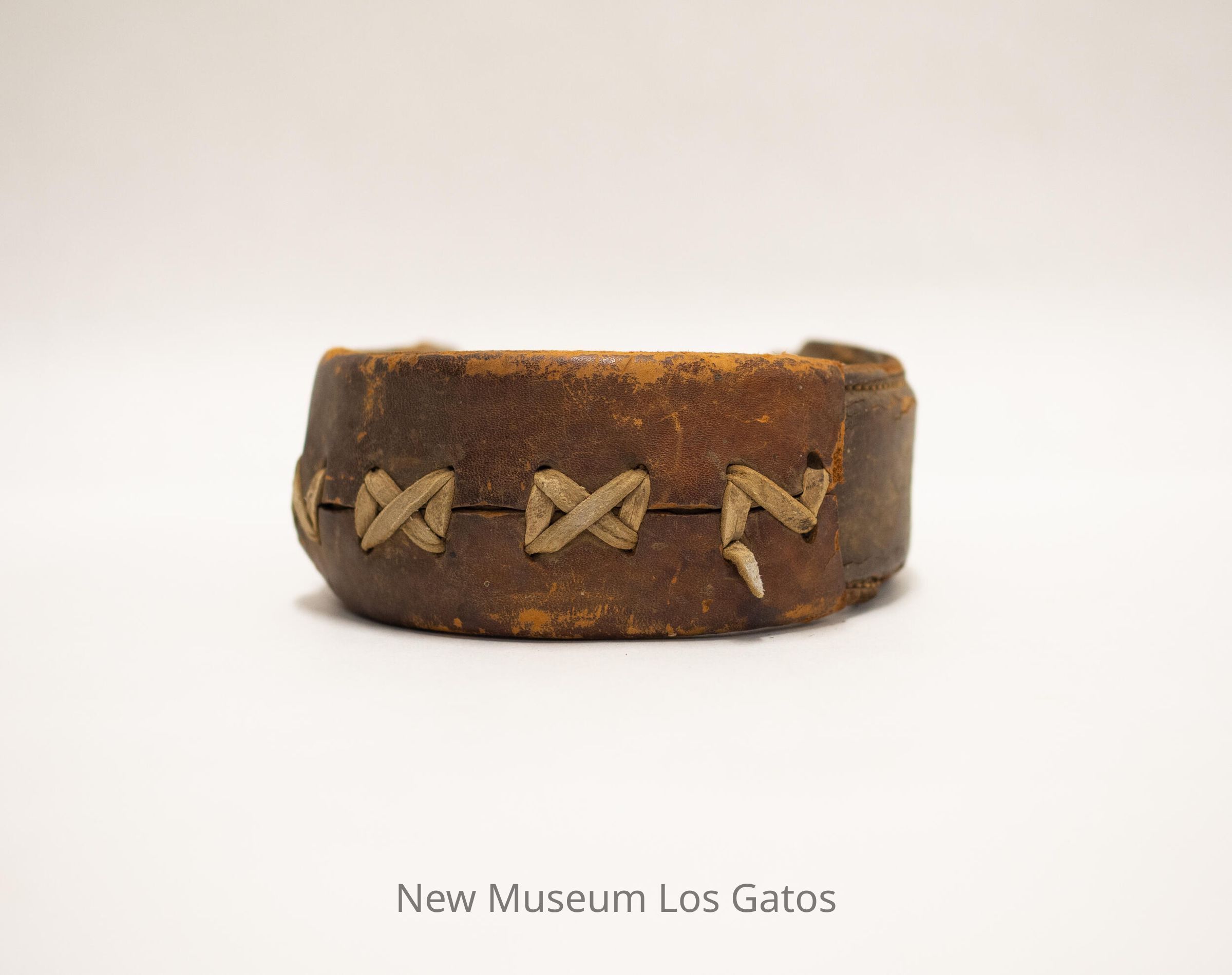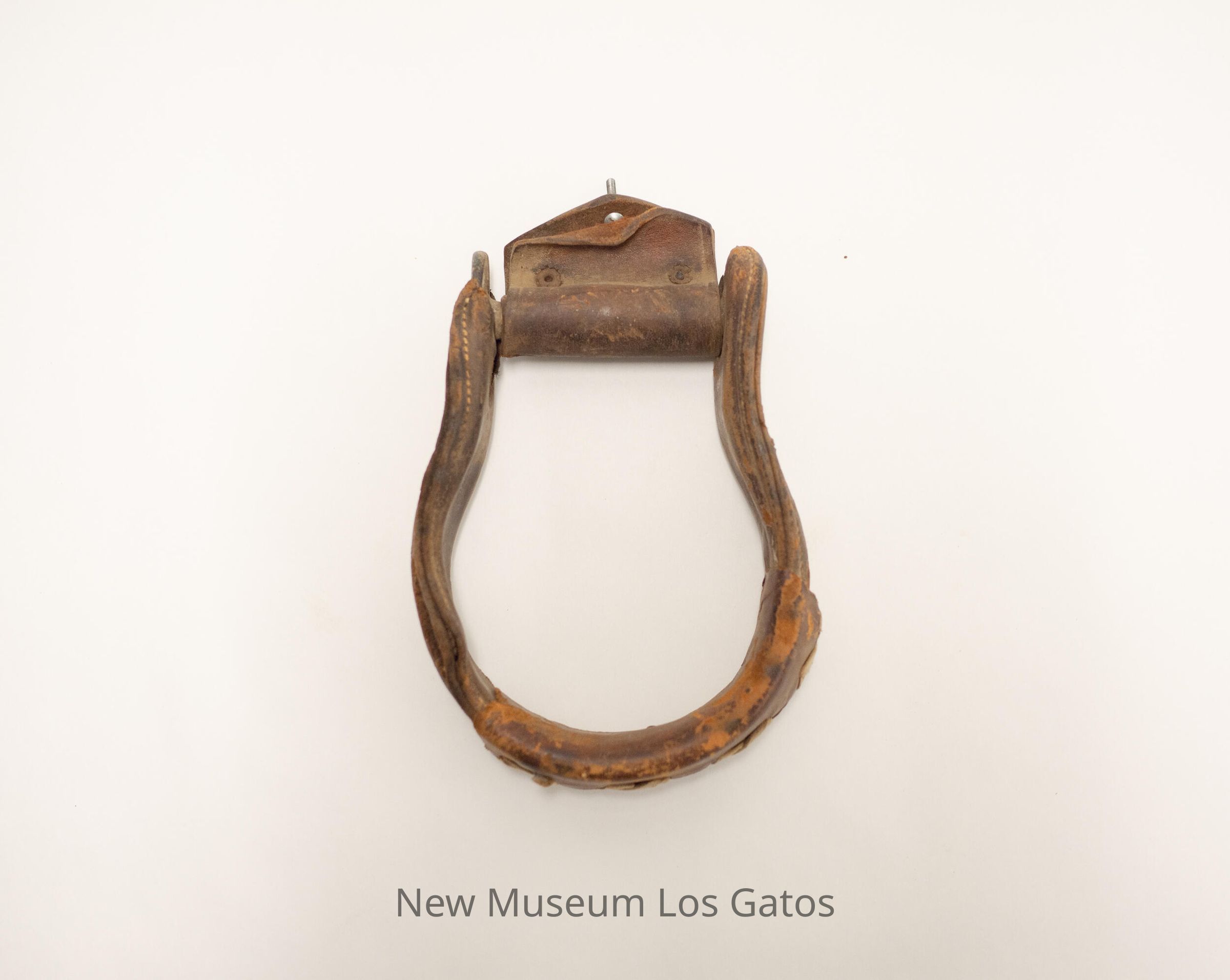 A U-shaped piece of metal covered in leather, with a moveable piece of metal also covered in leather across the opening. There is a screw coming out of the small, moveable piece.