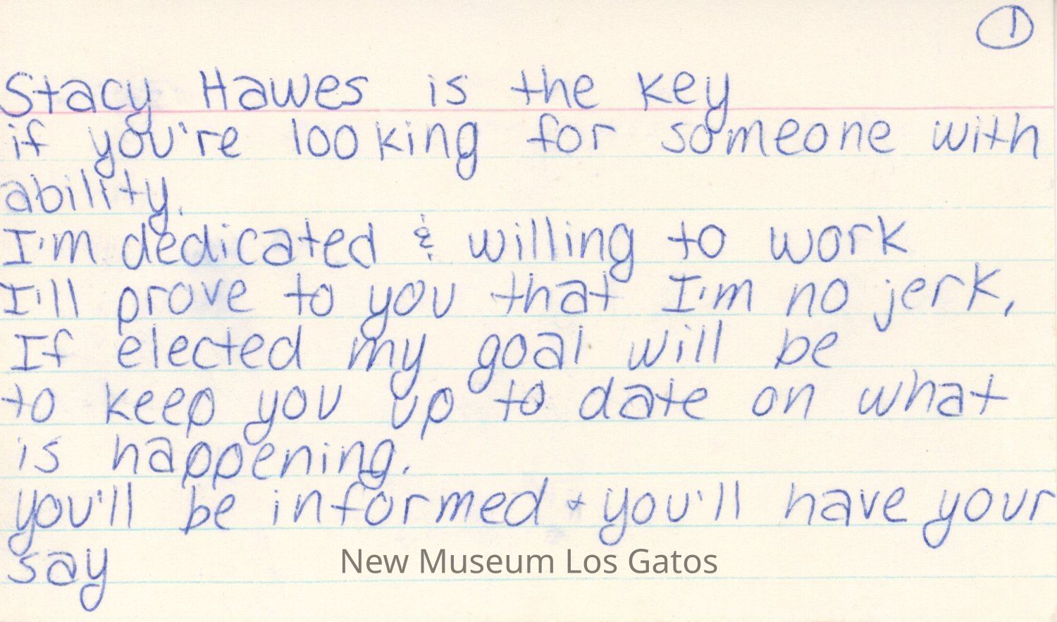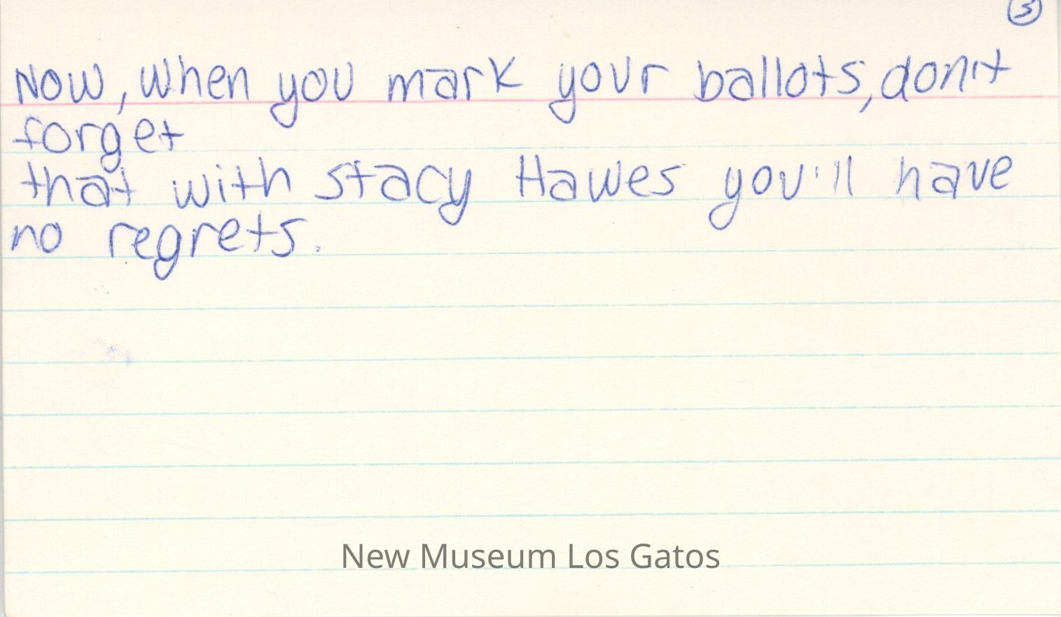 Three lined index cards with a campaign script handwritten in pen. The index cards are numbered in the upper right corners.