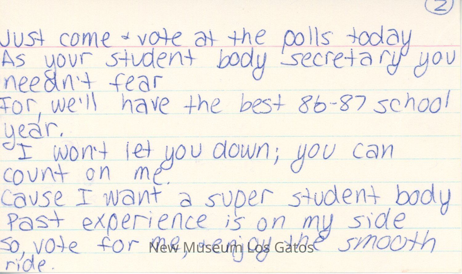 Three lined index cards with notes for a student body secretary campaign speech, written in pen.