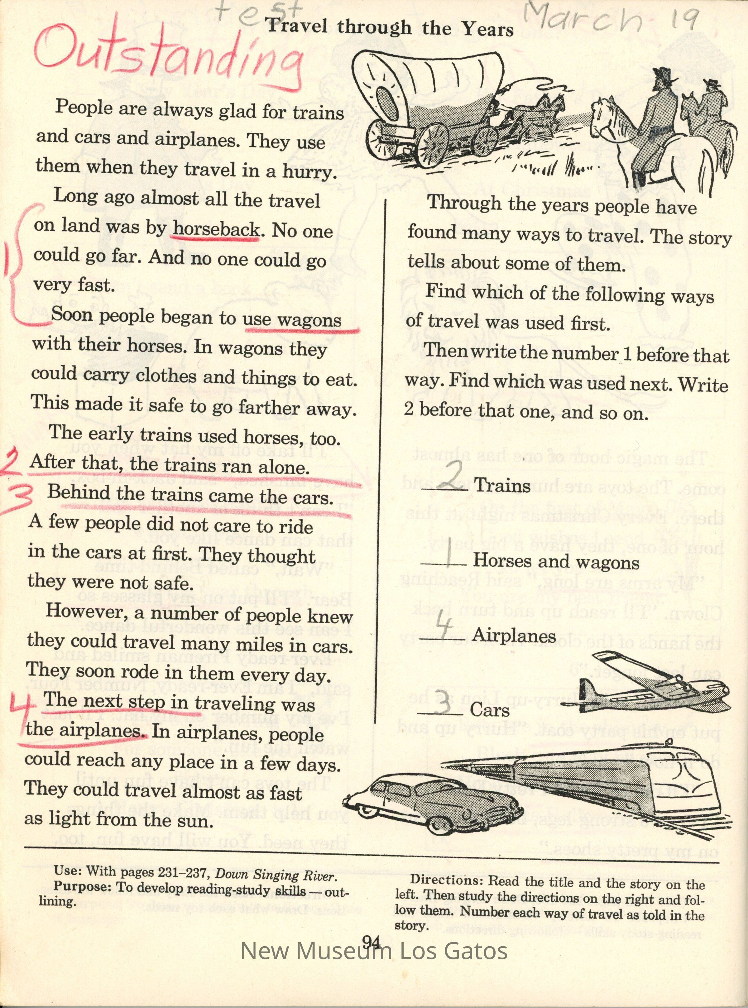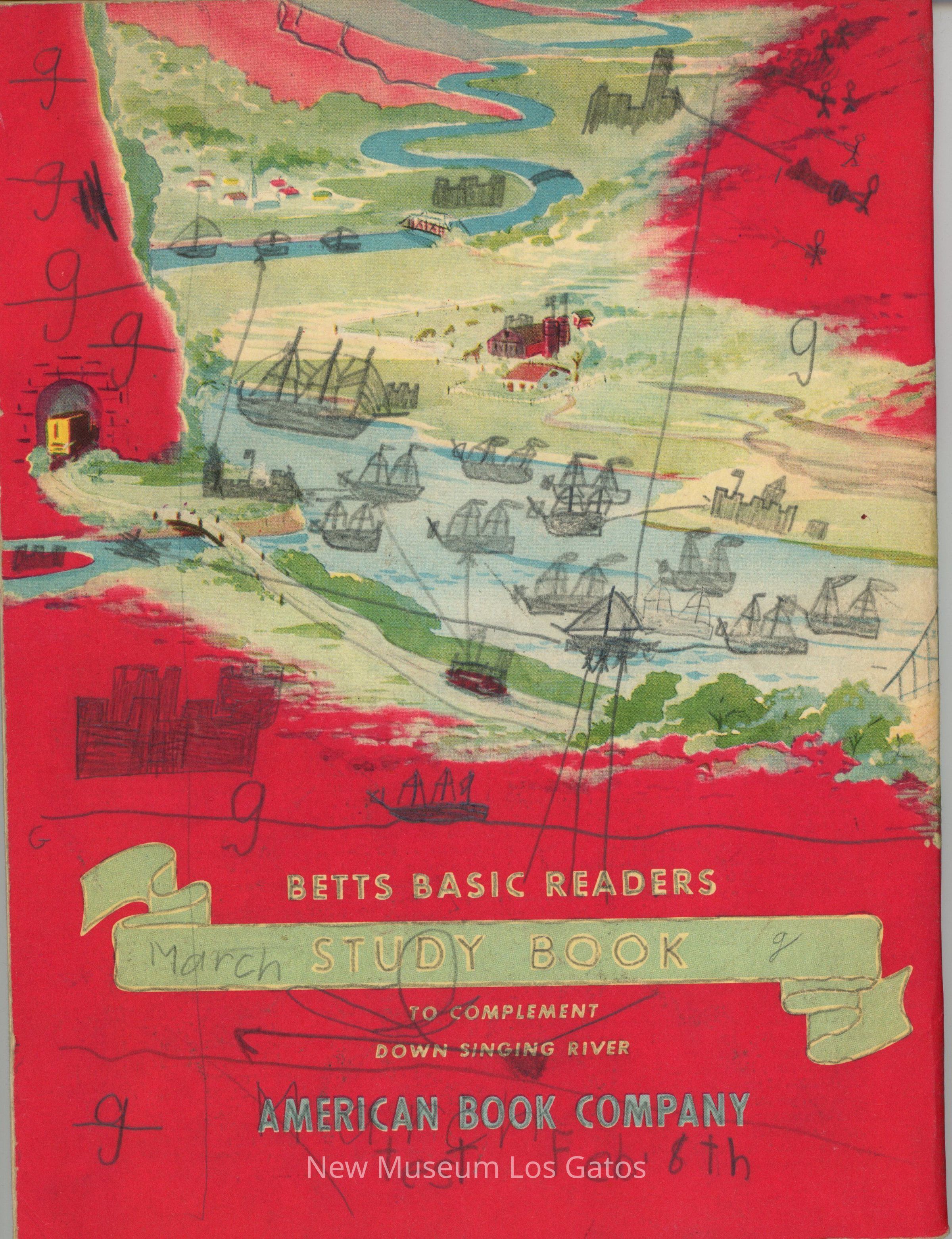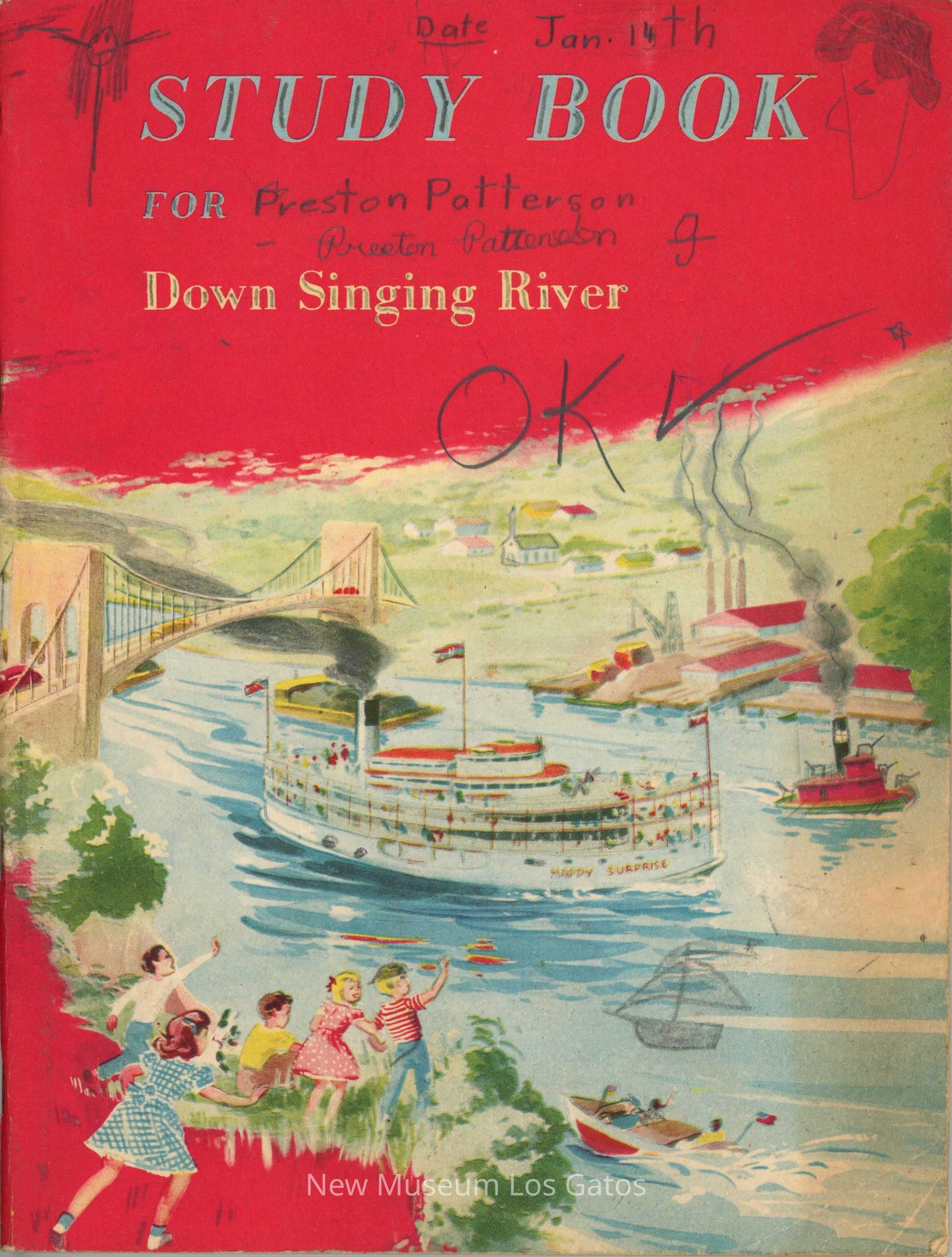 Red paper-bound book with a color illustration of a paddle boat sailing under a bridge, on the Pascagoula River in Mississippi, USA. The book is a companion study guide for students, already filled out and graded. The back has a color illustration of a river and town. There is a clipping from the San Carlos Enquirer tucked within.Collection