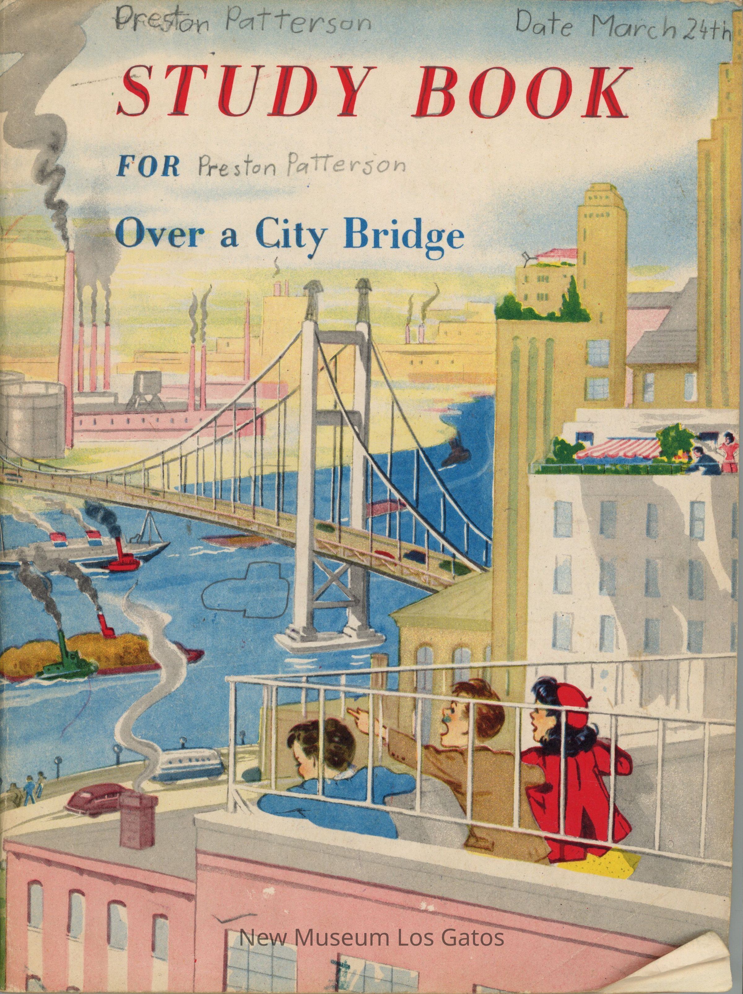 A brightly colored paper-bound book with a color illustration of a city overlooking a suspension bridge. The book is a companion study guide for students, already filled out and graded. The back has a color illustration of a river and town. The back has an illustration of a seagull, factory, and river.Collection
