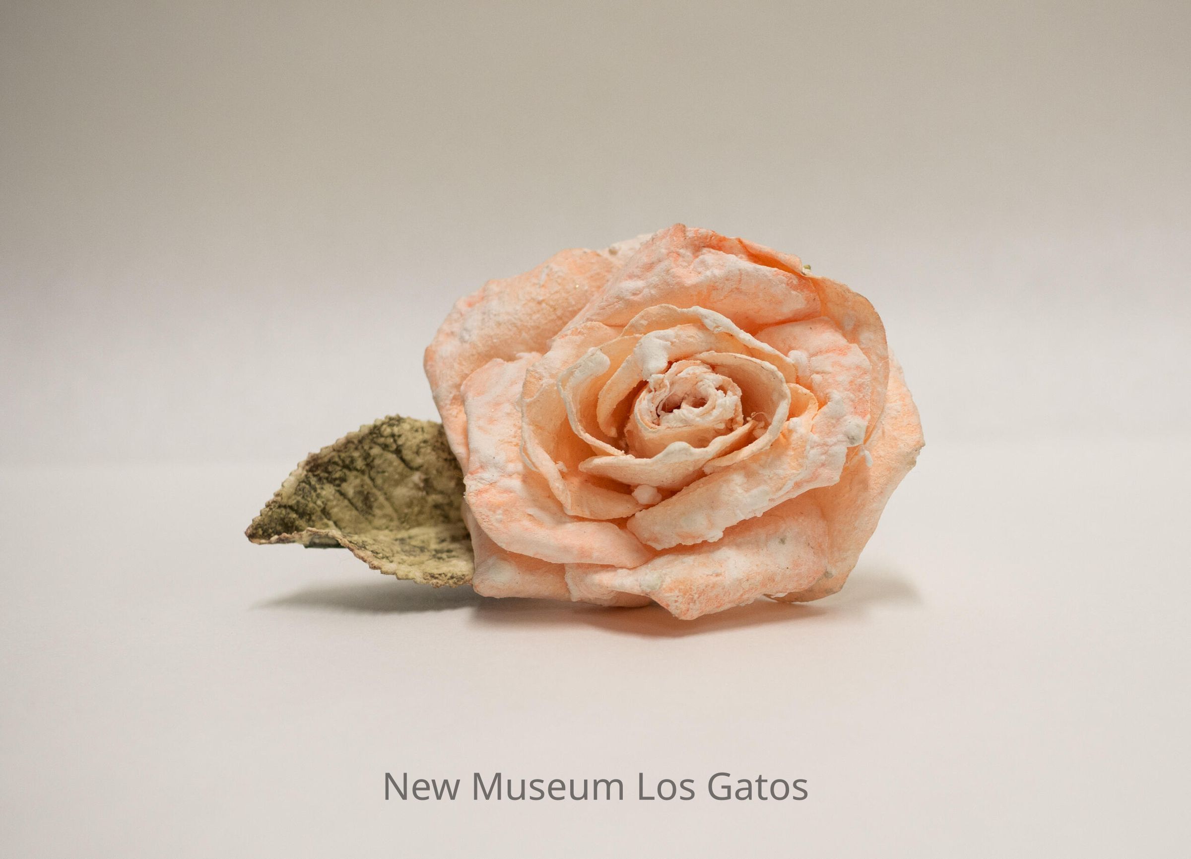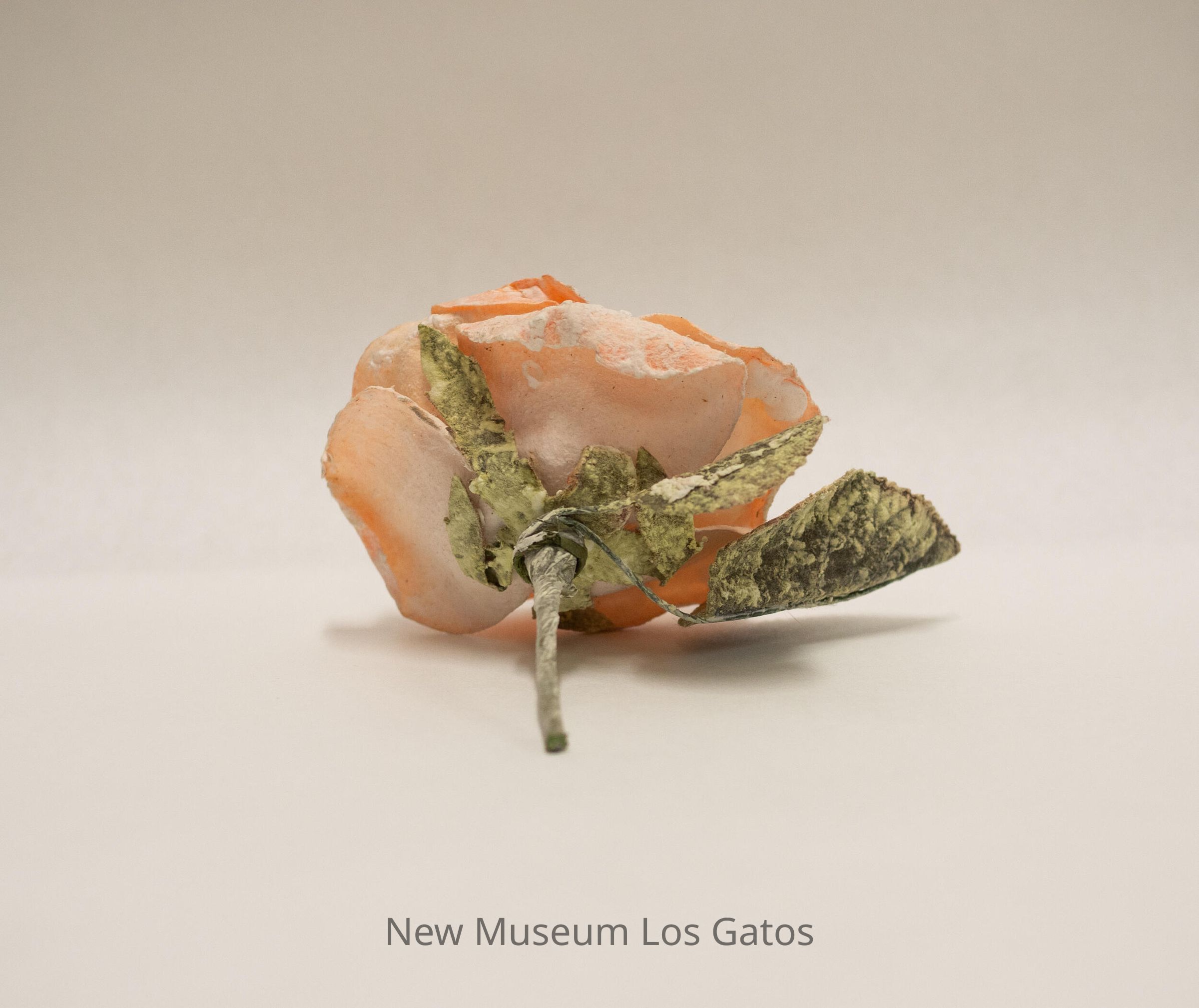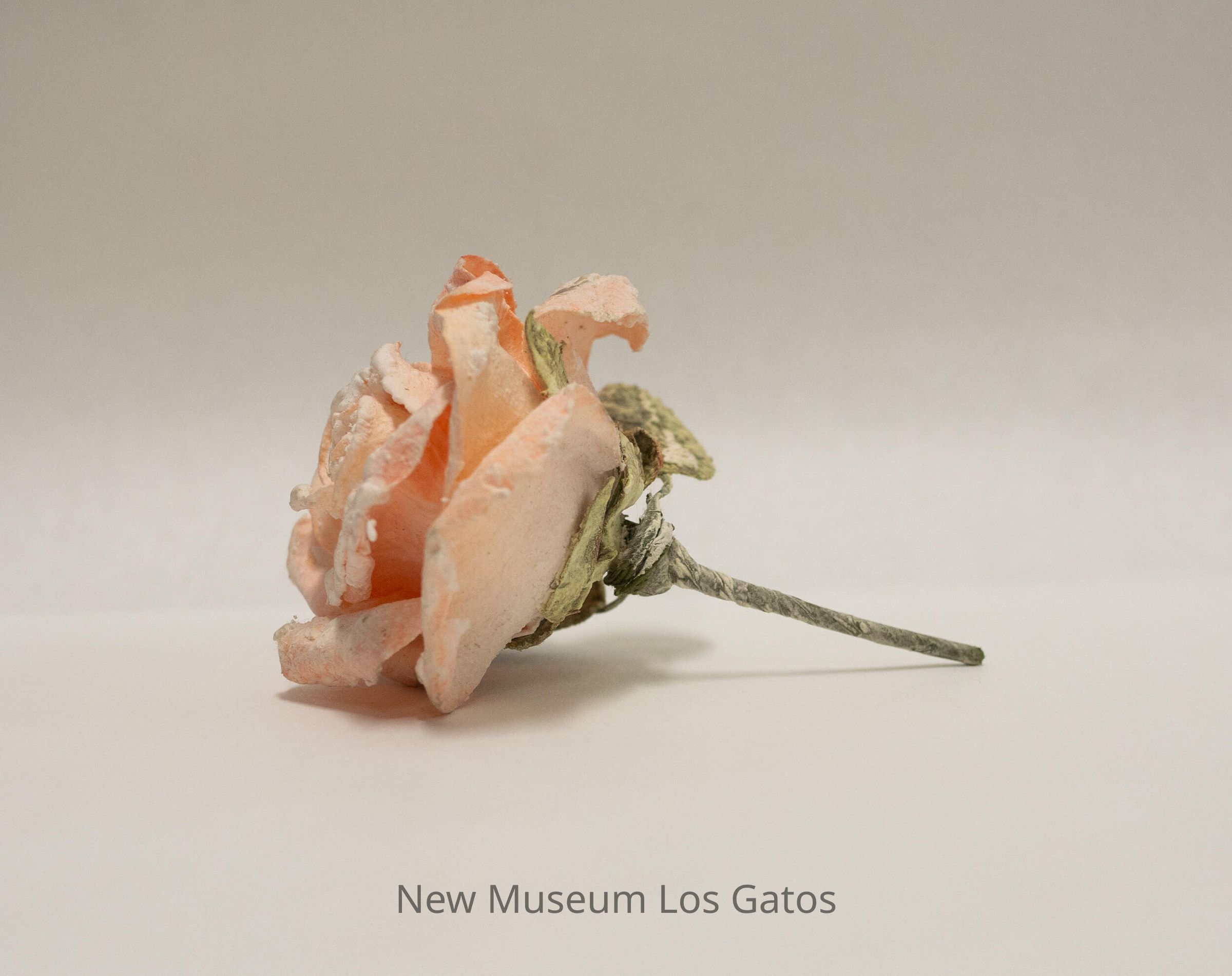 A synthetic pink rose, with a green stem and two green leaves, that appears to be made out of some sort of hardened paper material. There is a white coating over the majority of the rose, that appears inherent to the object.