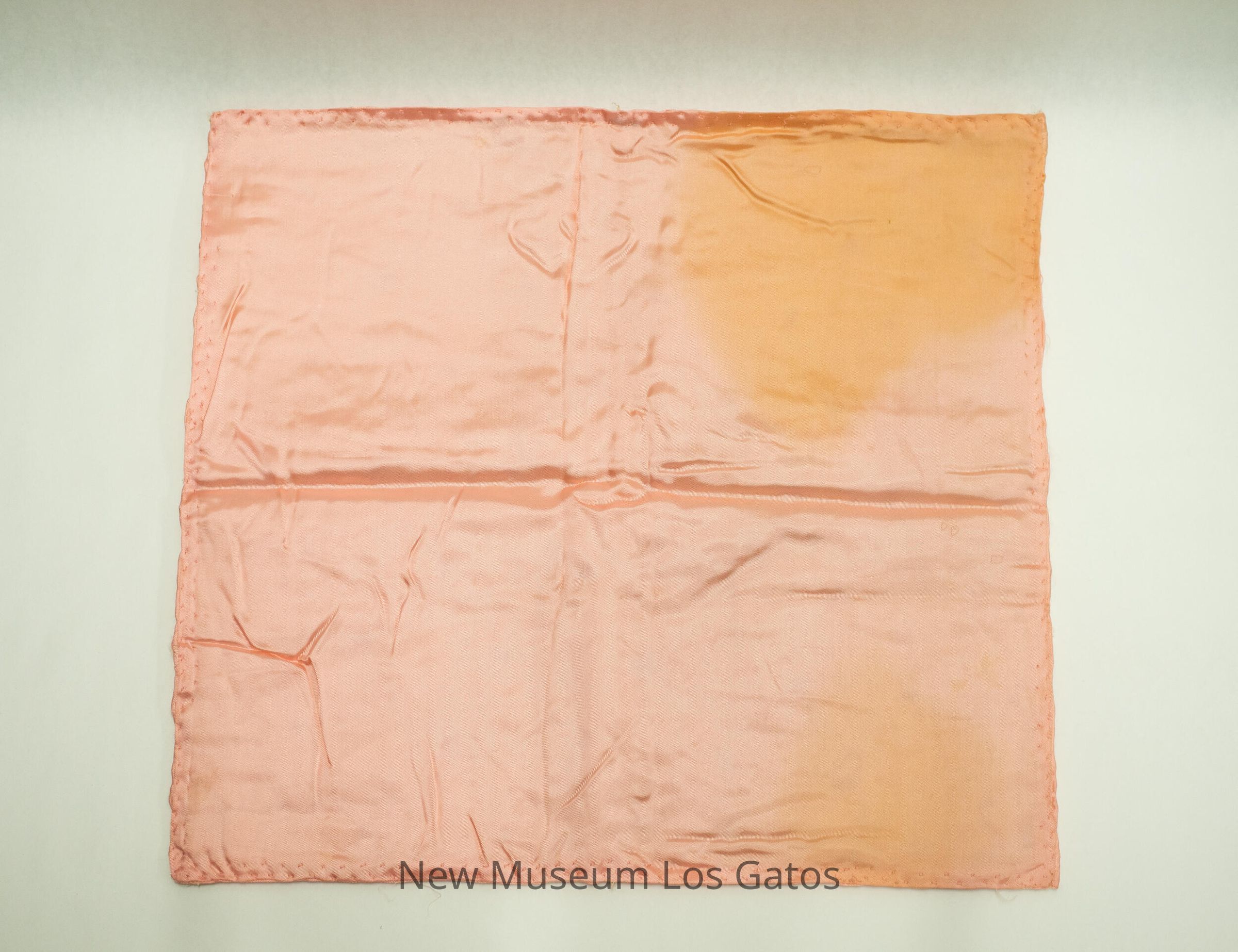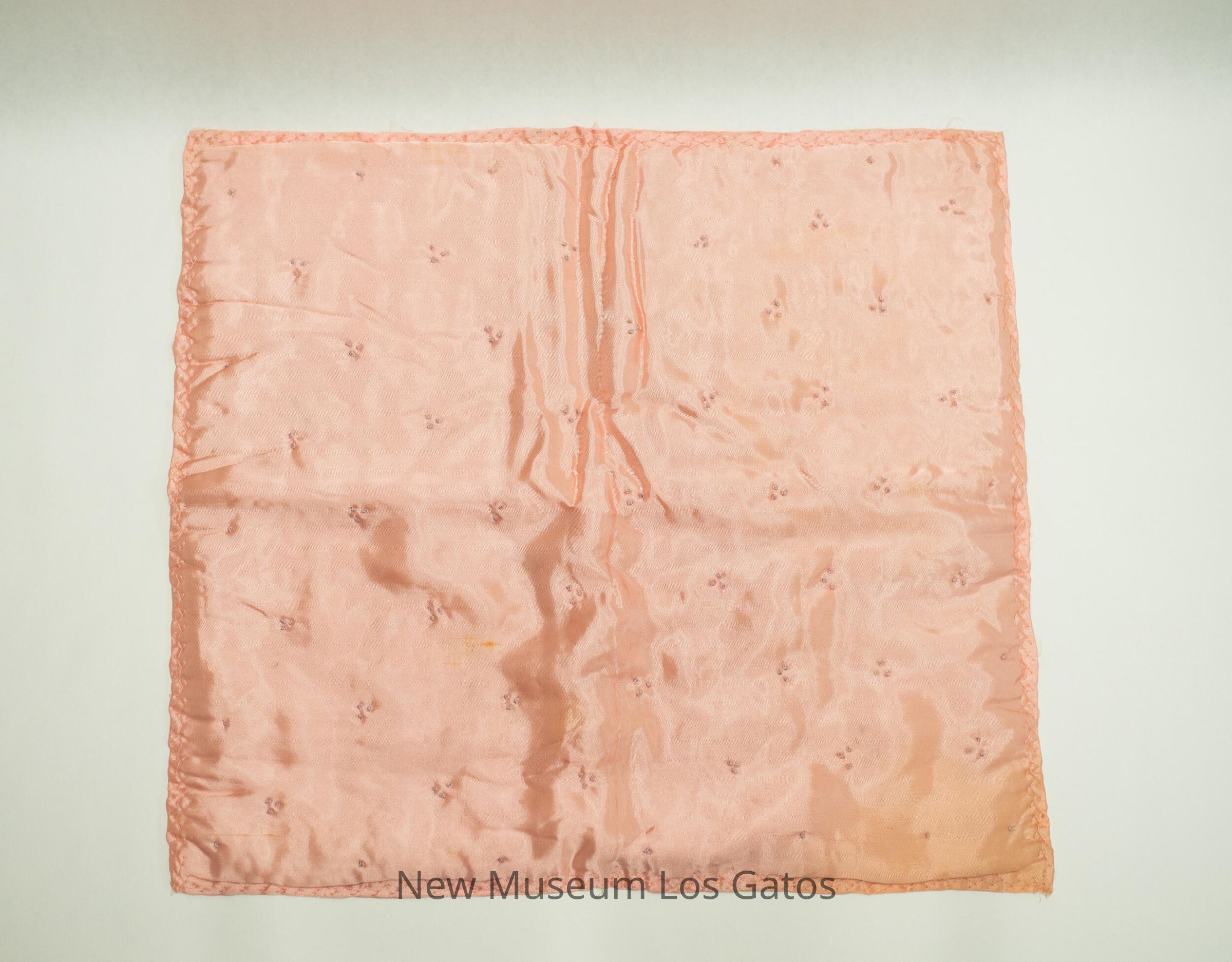 Pink, padded satin table runner, with decorative fabric knots forming triangles to create a pattern.