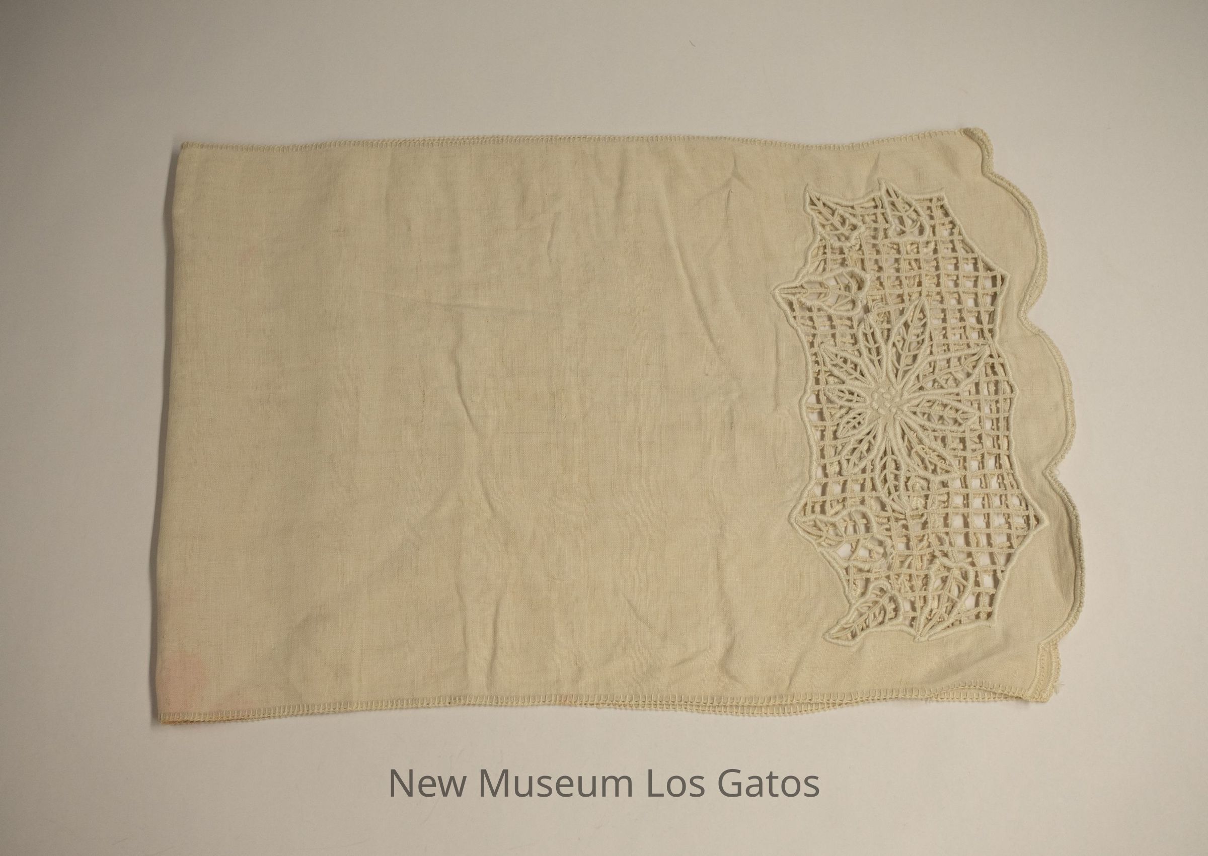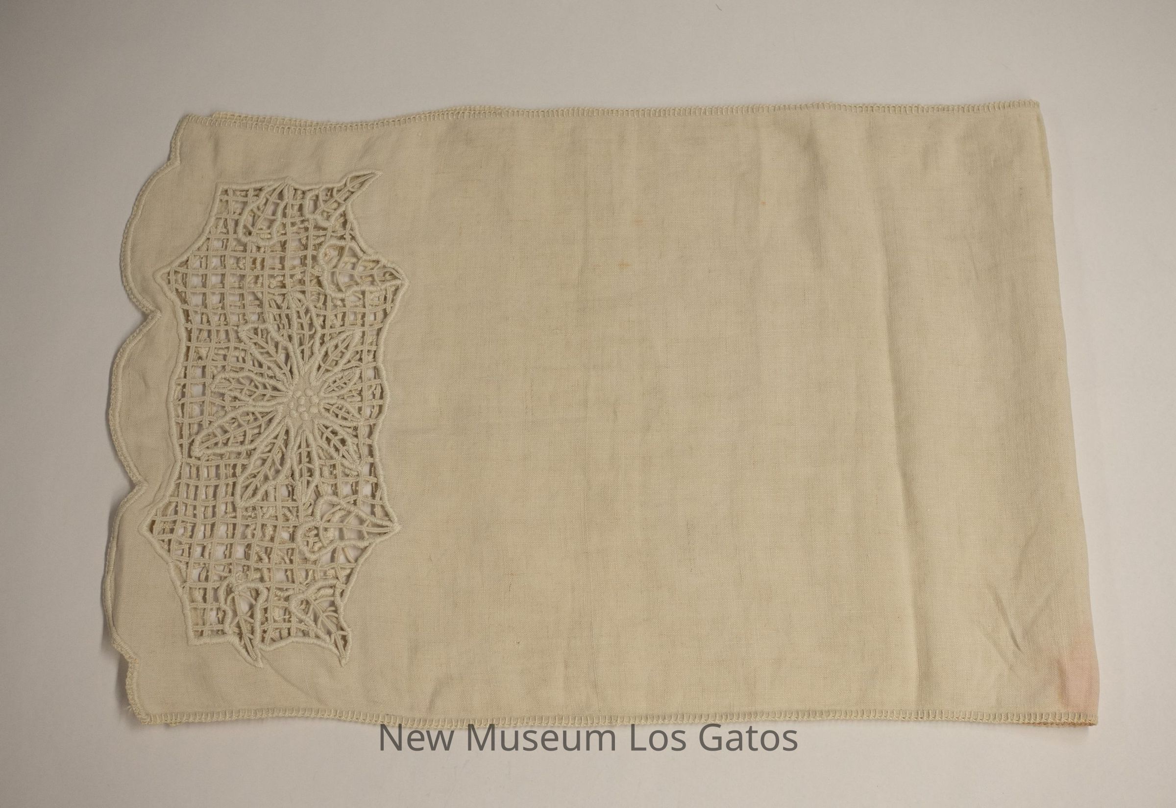 A plain, linen table runner with decorative stitching along the edges. There are transparent flower and leaf decorative elements at each end.